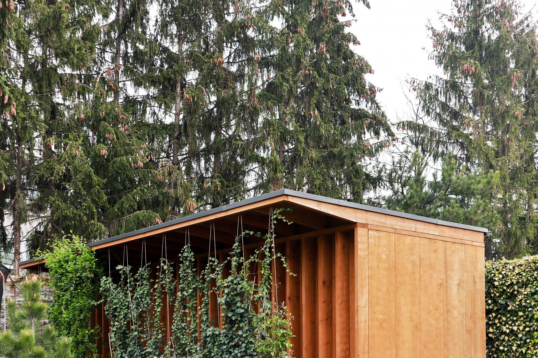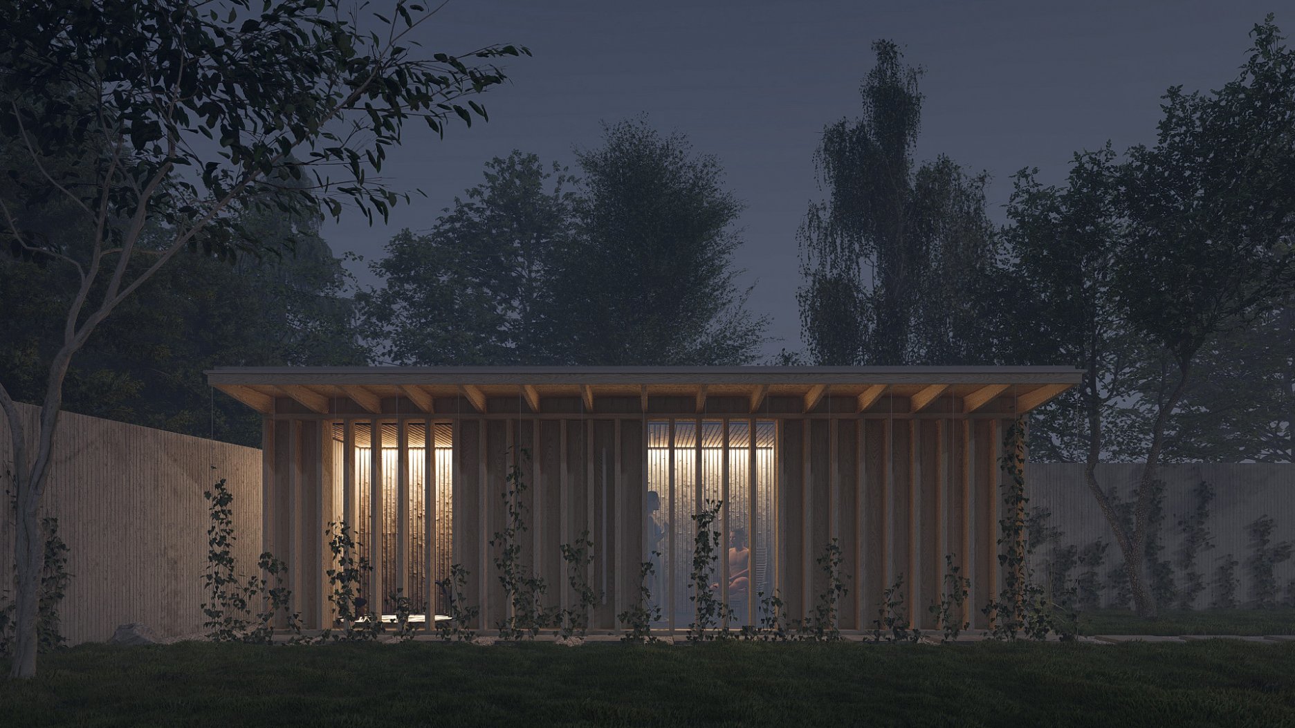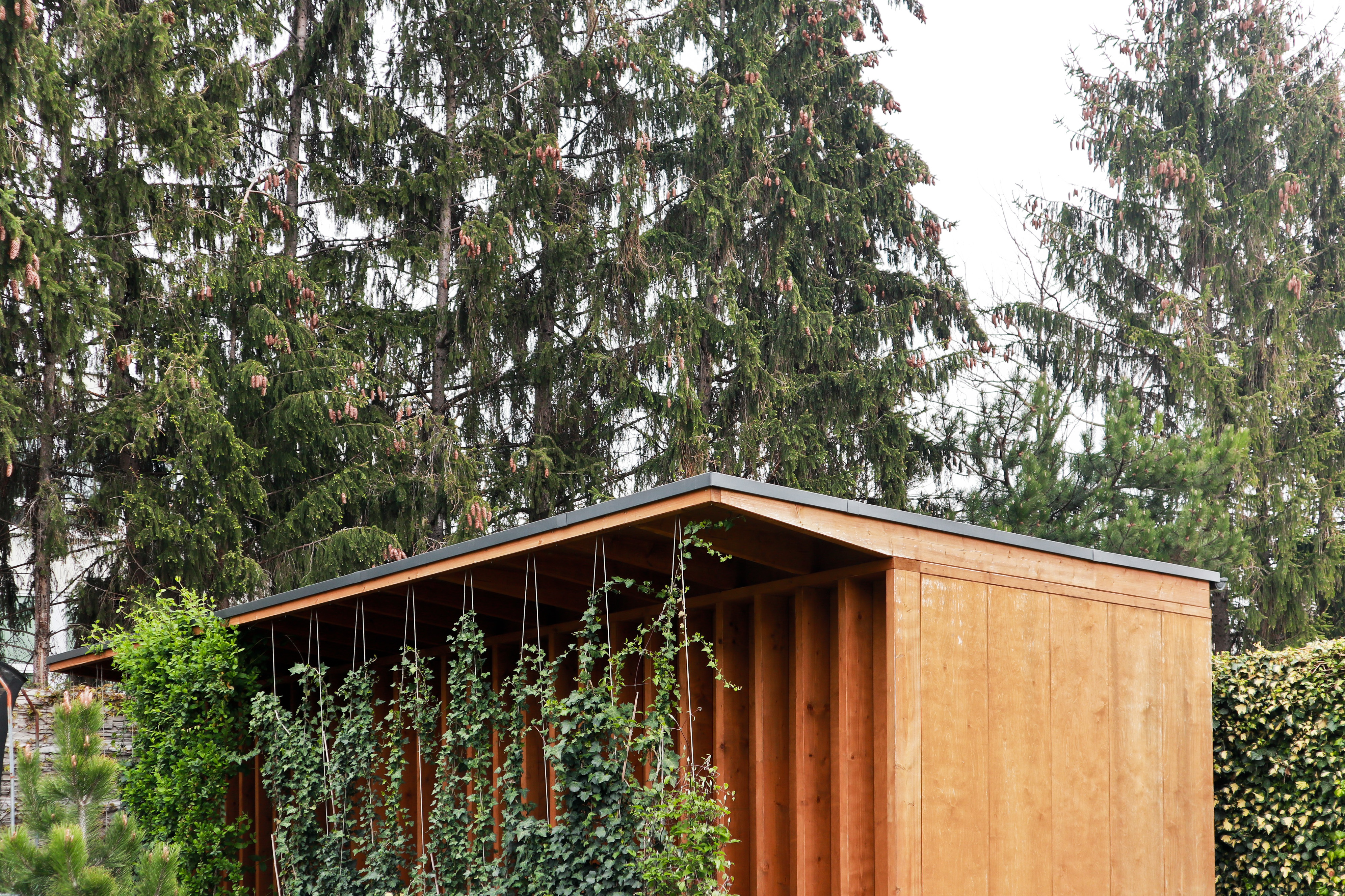 Skromná architektúra sauny má ambíciu citlivo dotvárať drobnú záhradu. Byť jej nenápadným doplnkom a účelným objektom. Jednoduchá drevená skeletová konštrukcia priznáva svoju tektoniku a materiály do celej fasády. Podklad tvorí betónová doska. Previs strechy vytvára krytý vstup, ktorý je doplnený popínavými rastlinami ako ďalšou vrstvou prírody.