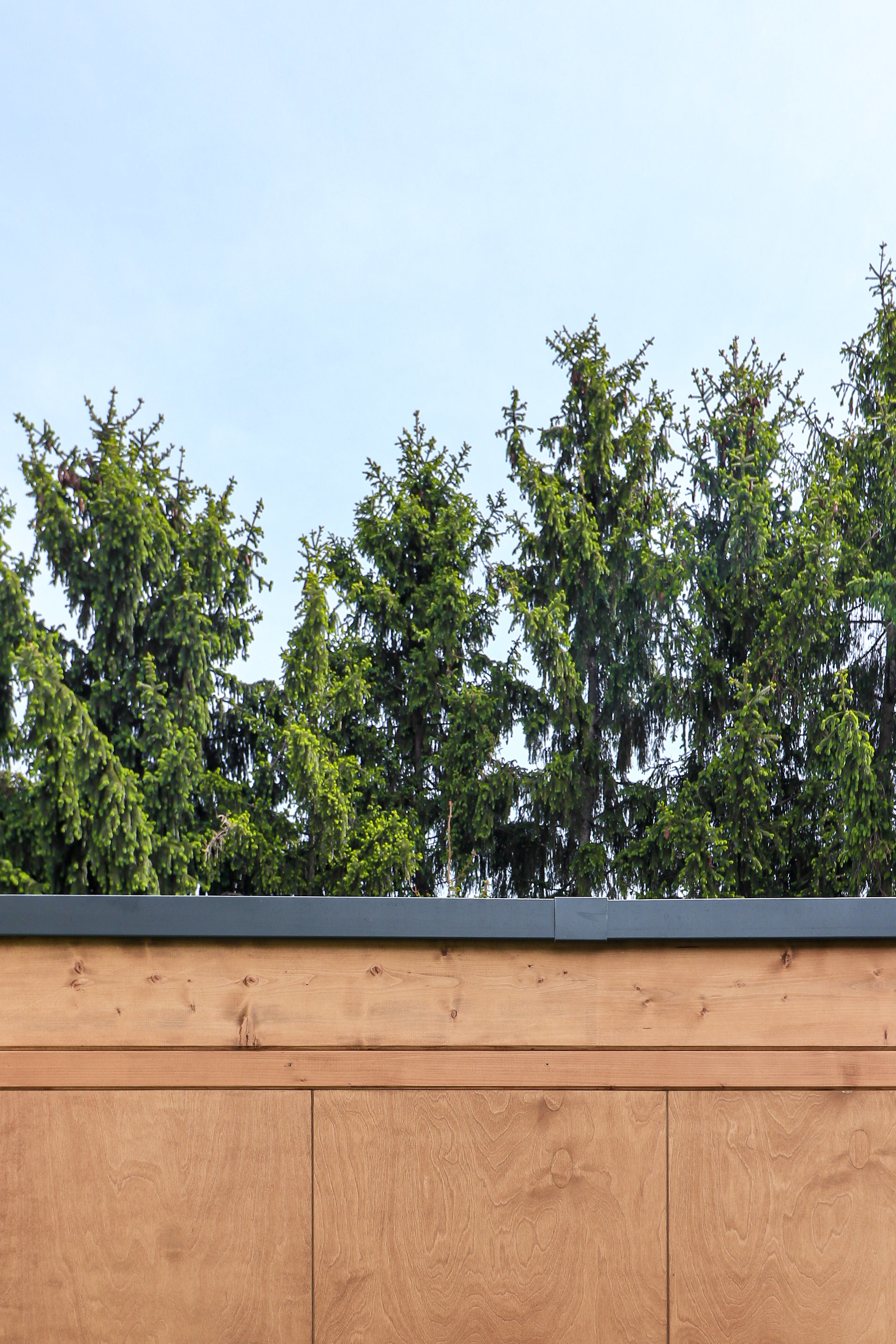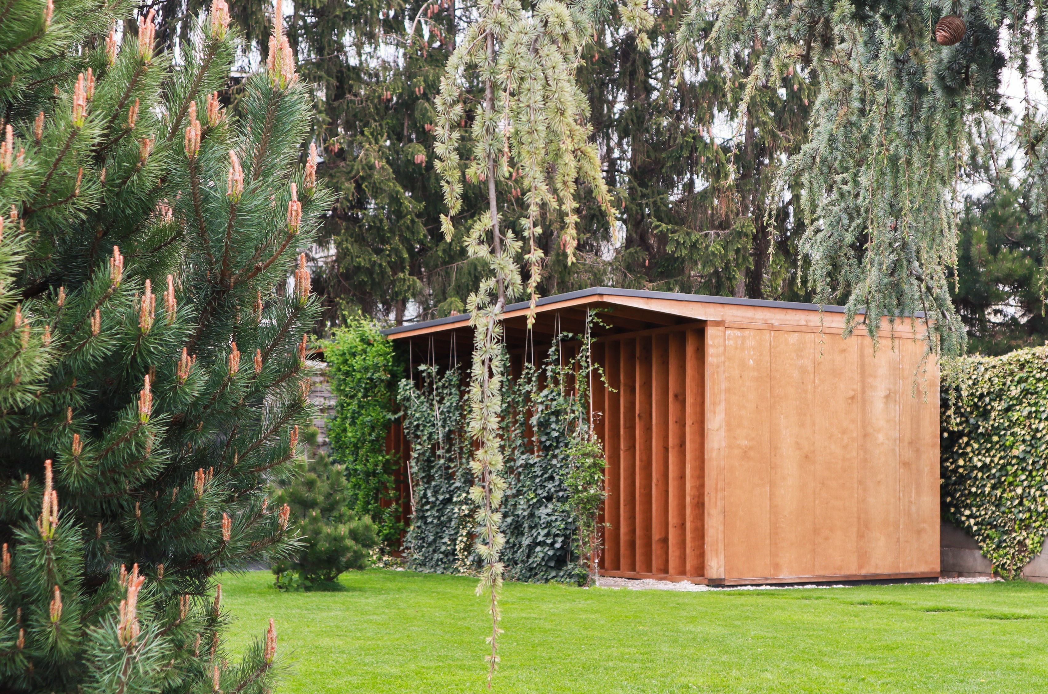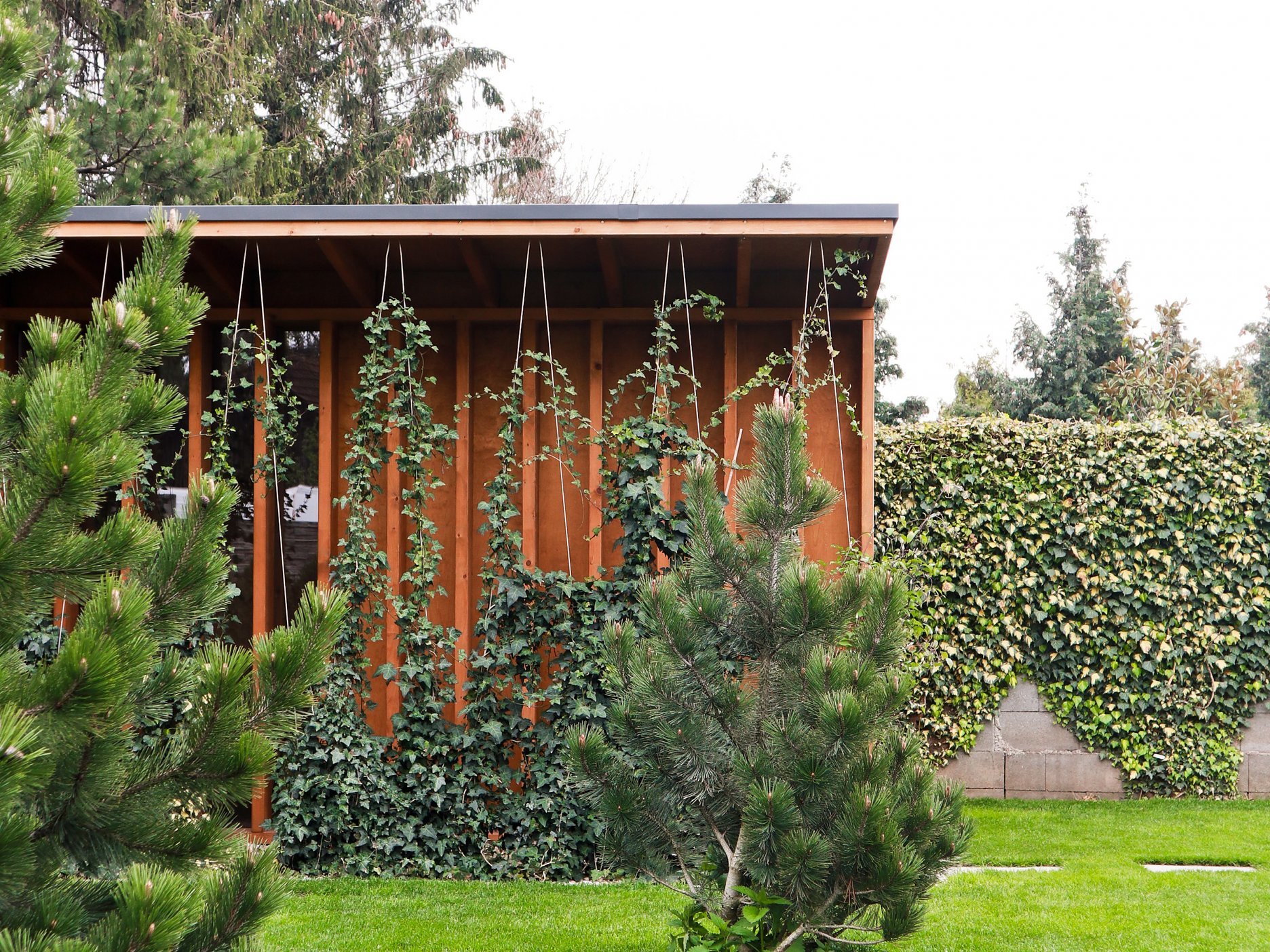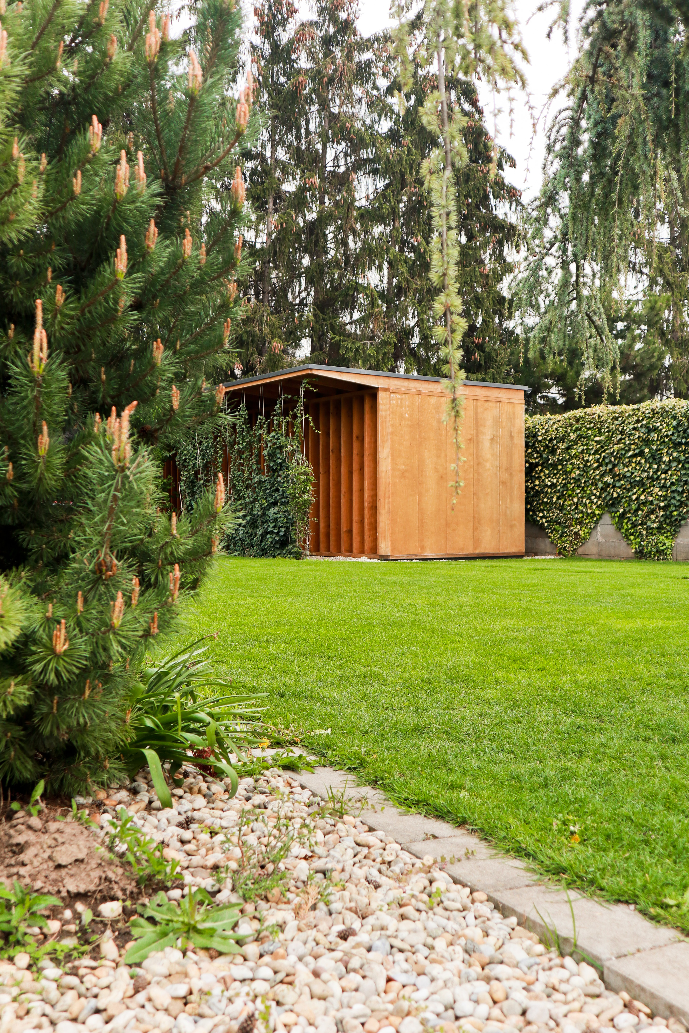 Drobná drevostavba priznáva na fasáde raster konštrukčného systému. Ten spolu s predsadenou trelážou vytvára príjemné súkromie. Pri pohľade zo sauny však ponecháva voľné dôležité priehľady do zelene a do záhrady.