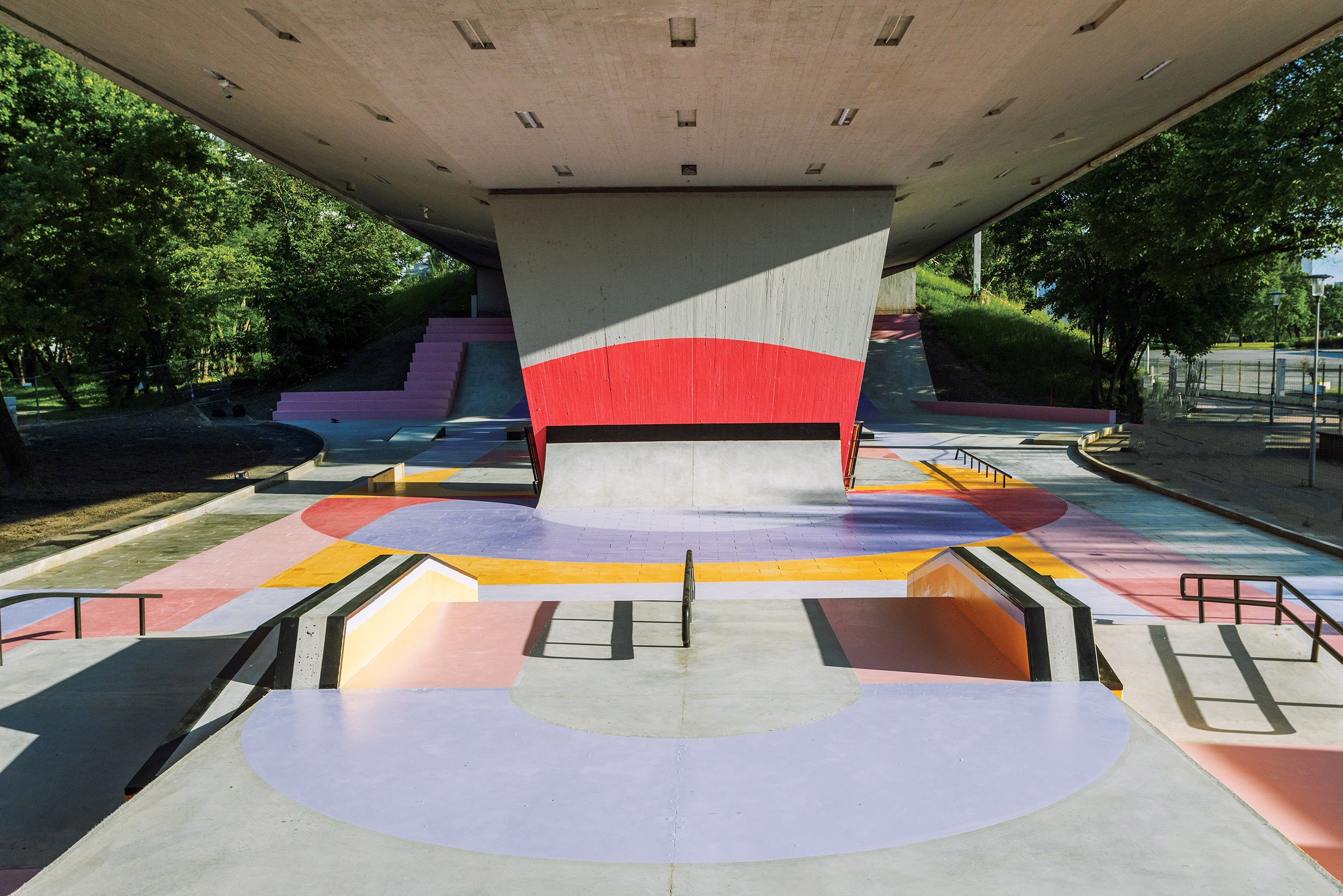 Hmotové rozloženie skateparku nadväzuje na existujúce konštrukcie a linearitu mosta. Hlavným kompozičným princípom návrhu sú piliere mosta, ktoré prirodzene vymedzujú plochy s hlavnými prekážkami, funkčne rozdeľujú skatepark na dva segmenty a zároveň sa stávajú jeho súčasťou. Segment nadväzujúci na nové workout ihrisko je navrhovaný ako plocha so "street" prekážkami na olympijskej úrovni pre pokročilejších jazdcov. Druhý segment, ako aj priestor po bokoch skateparku je navrhovaný ako voľnejšia "plaza" s prekážkami vhodnými pre rôzne úrovne zručností jazdcov.