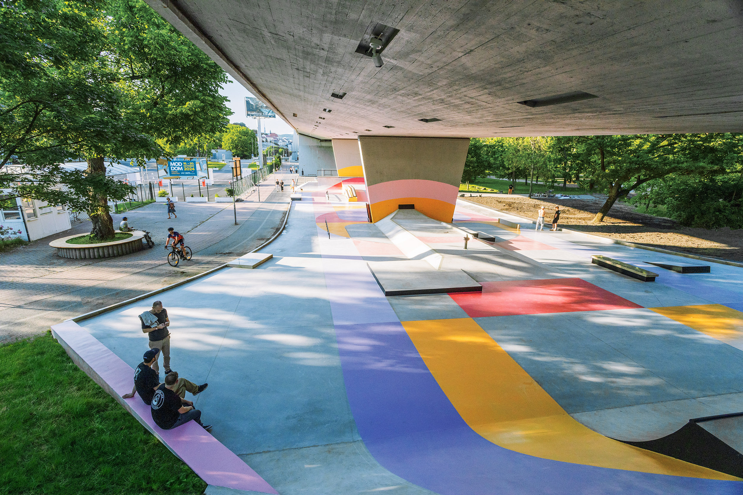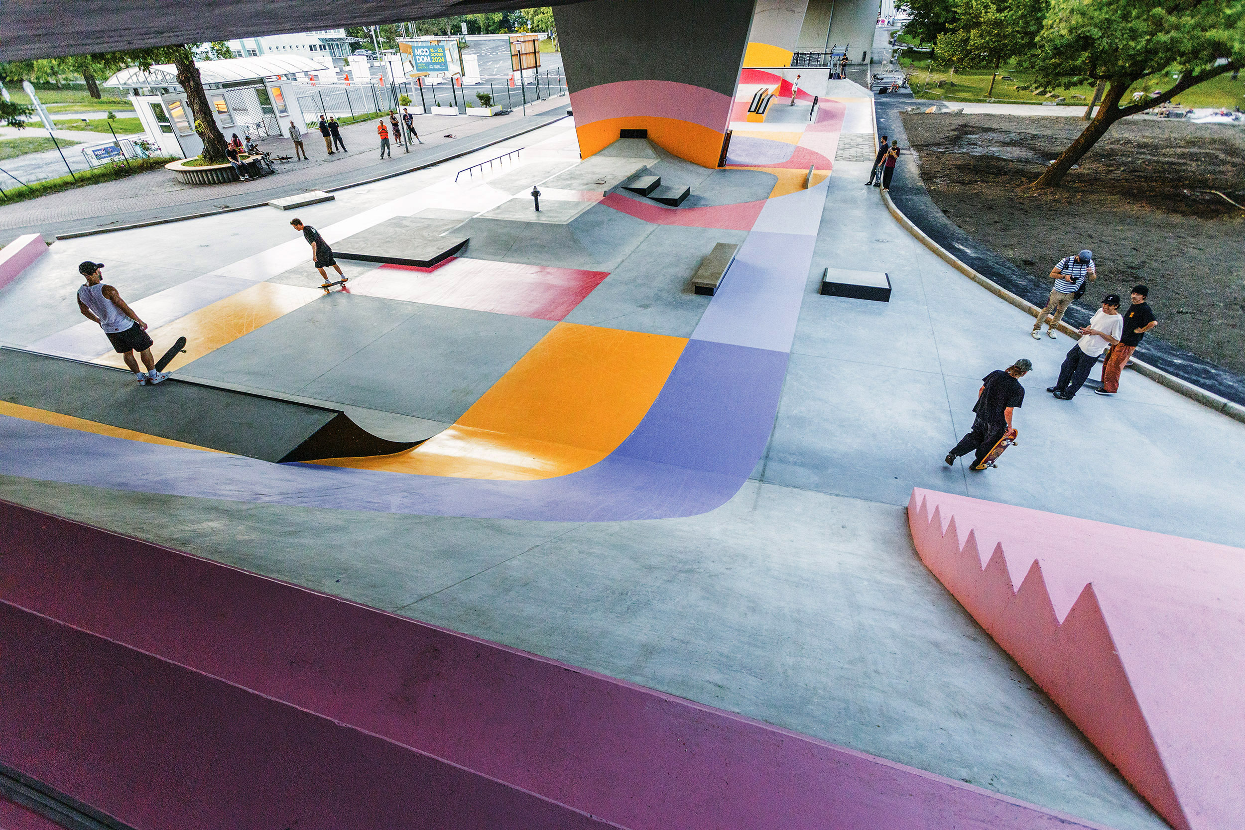 Súčasná podoba skateparku je výsledkom procesu viacerých kompromisov a zmien (pôvodne sa počítalo napríklad so zapustením športoviska o 15 cm oproti úrovni priľahlých cyklotrás). Architektom sa však podarilo vytvoriť funkčný a atraktívny "layout" pre kolieskové športy a BMX, ktorý sprevádza pre realizácie ateliéru už charakteristická výrazná farebná grafika. "Bratislava má konečne dôstojný krytý celobetónový skatepark s večerným osvetlením, výhľadom na dominanty Bratislavy a skvelým západom slnka," dopĺňa Lukáš Kalivoda.