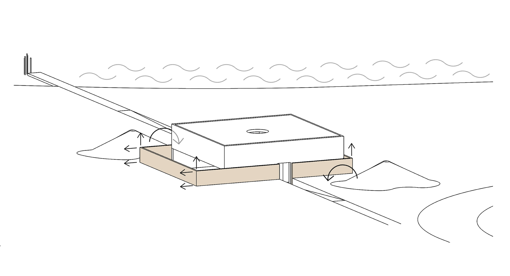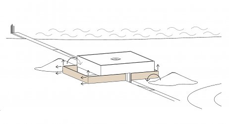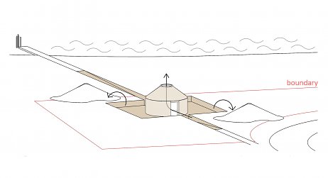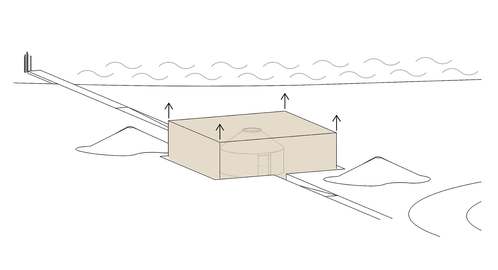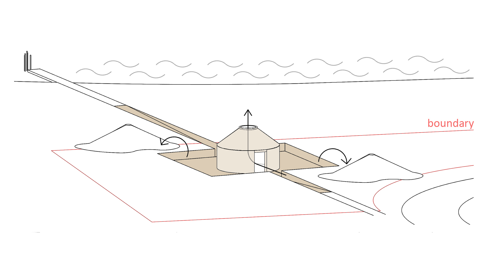 Okolo celého objektu je navrhnutá bariéra v podobe terénnej steny, ktorá je odsadená od obvodového muriva budovy, vďaka čomu vzniká štrbina. Tá slúži na prevetrávanie obvodového múru a jeho ochladzovanie. Na severnej strane je toto murivo dostatočne odsadené, aby bol priestor na prezentáciu dostatočne presvetlený. Tento priestor je rozdelený na exteriérovú a interiérovú plochu. Tá môže byť ľubovoľne zväčšovaná vďaka visiacim tieniacim stenám. Pri potrebe zväčšiť úžitkovú plochu môžeme tento tieniaci systém zdvihnúť do exteriéru, vďaka čomu nám vznikne prestrešenie. Pri nedostatku svetla, môžeme systém otvoriť do interiéru, čím zamedzíme tieneniu. Systém je ľahko manipulovateľný a dá sa s ním pracovať intuitívne.