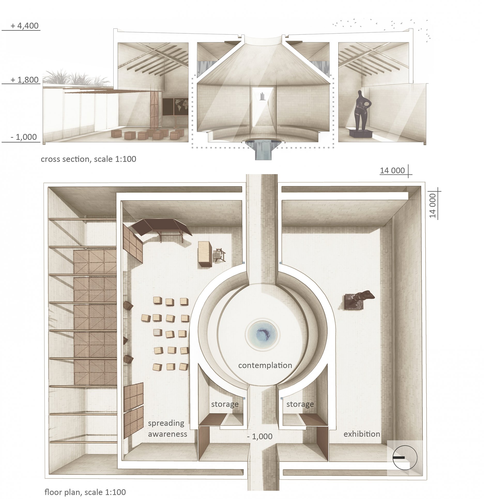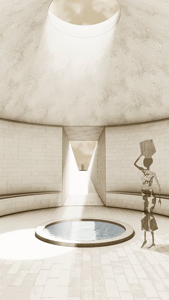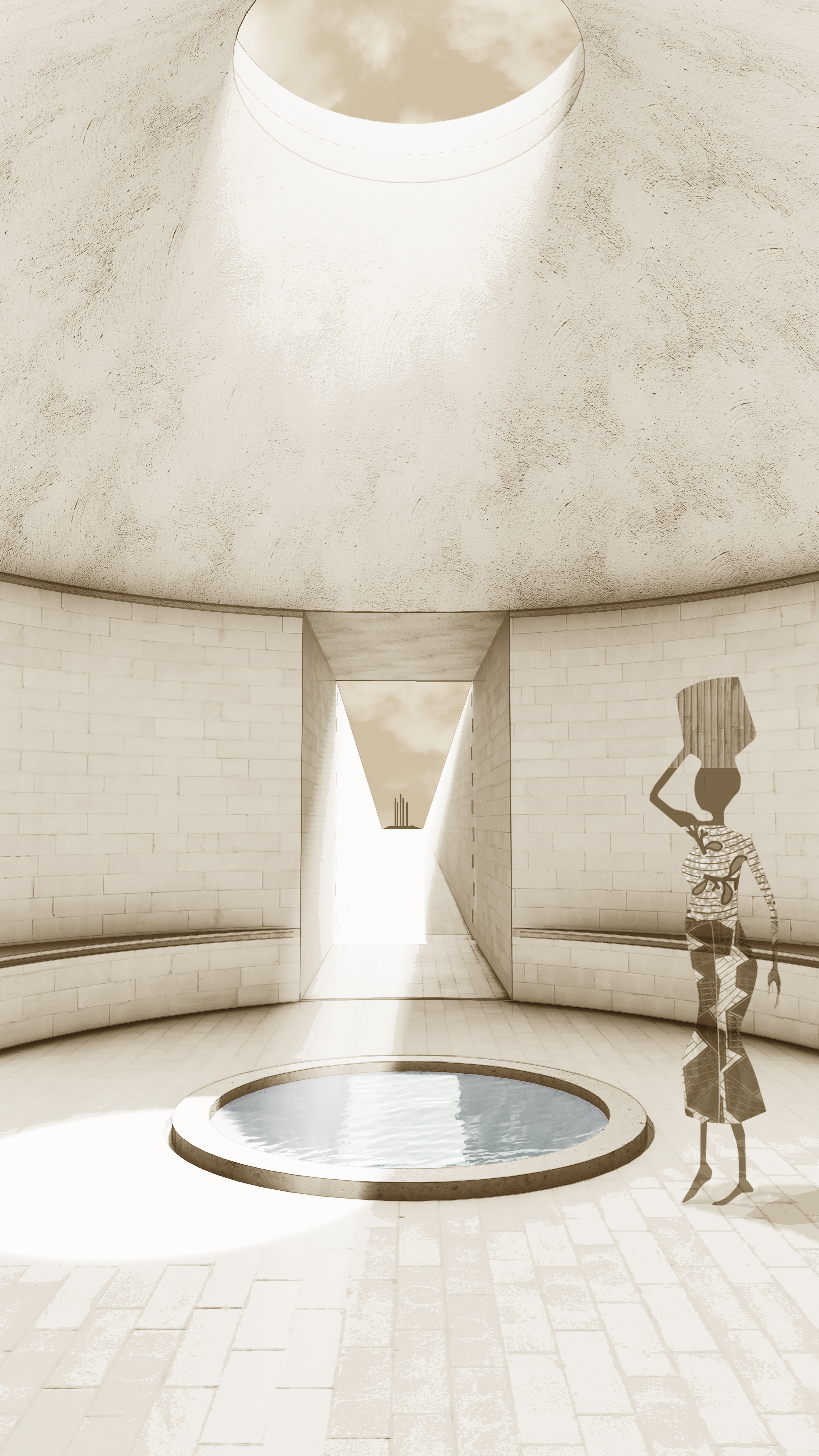 DOMOV – rodina, priatelia, strecha nad hlavou, vôňa jedla ... . Tradičný dom naprieč celým Africkým kontinentom sa nesie v duchu racionality a jednoduchosti. Typické rodinné domy, ktoré boli často krát vypálené počas vojnových konfliktov, majú kruhový pôdorys. Kruh zároveň symbolizuje večnosť, pôvod života, boha a jednotu. To boli dôvody, prečo sme sa rozhodli pre tento typ hmoty hlavného priestoru slúžiaceho na kontempláciu a modlitbu. Kruhový tvar priestoru situovaný na východ neobmedzuje meditáciu ľuďom žiadnych kultúr a náboženstiev. Do stredu strechy sme umiestnili otvor, cez ktorý prechádza svetlo. Zároveň slúži aj na vetranie vďaka komínovému efektu (tento fyzikálny jav sa v minulosti využíval na kúrenie a vetranie).
