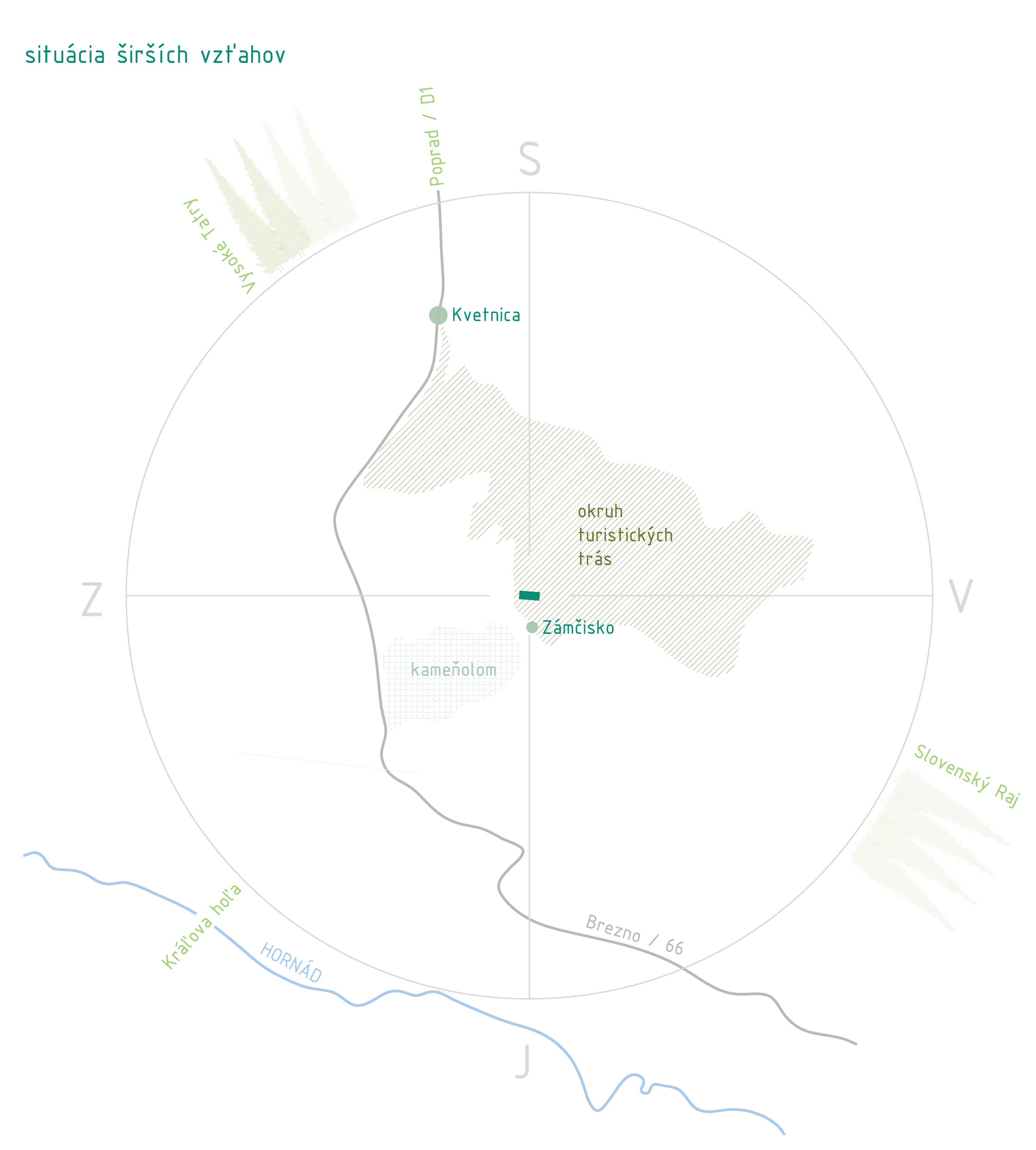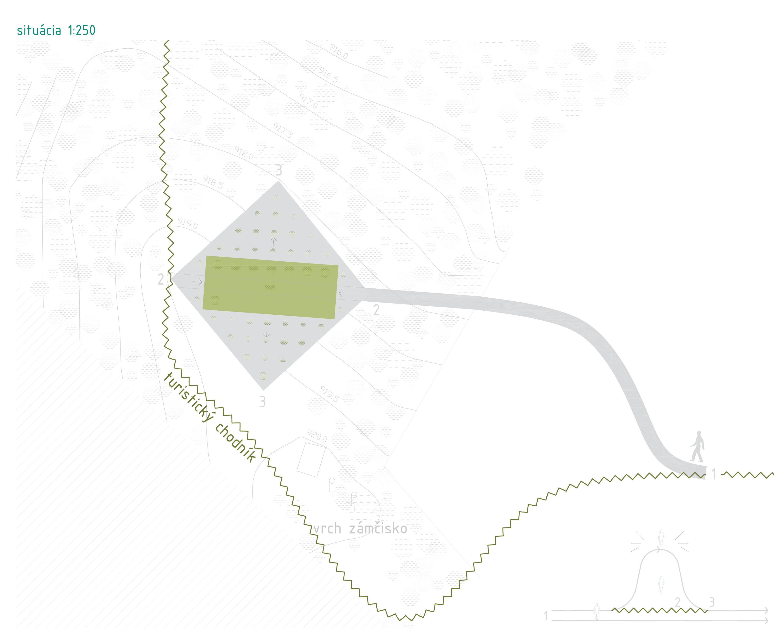 V mieste 1 sme sa preto odpojili od zelenej a vstupujeme cez les zapustenou cestičkou do vrstevnice kopca až priamo pod vyhliadkovú vežu. Týmto vstupom prichádza k momentu prekvapenia z vyhliadkovej veže, jej architektúry, vytvorenej scény a výhľadu, ktorý sa nám naskytne nečakane a v silnejšom zážitku. Dostali sme sa do bodu 2, kde sa cestičkou vedenou po vrstevnici zapúšťame v mieste osadenia veže do terénu. Týmto zapusteným vstupom získame tesnejší kontakt s vegetáciou a zelenou, dostaneme sa akoby pod „dáždnik“ vyhliadkovej veže. Zároveň je to odkaz na bývalé nálezisko a históriu tohto miesta, touto zapustenou cestou môžeme už od bodu 1 odprezentovať nálezy (v rámci informačných tabúľ upevnených po stranách zapustenej cesty) a historické súvislosti tohto miesta. Presne pod stredom veže vystúpime šiestimi stupňami na úroveň terénu a úroveň vstupu do vyhliadkovej veže. Dostaneme sa pod stred veže. Z tohto bodu môžeme buď pokračovať ďalej, alebo vystúpiť na vrchol veže. V tejto časti pod vežou sú chránené priehľady na všetky strany aj preto sme tu navrhli posiedku pre turistov. Bod 3 znamená voľné vstupy z turistickej zelenej trasy alebo aj voľne z lesa. Poloha samotnej vyhliadkovej veže, jej osadenie do terénu s nadväznosťou na povahu miesta je podstatnou súčasťou nášho návrhu.