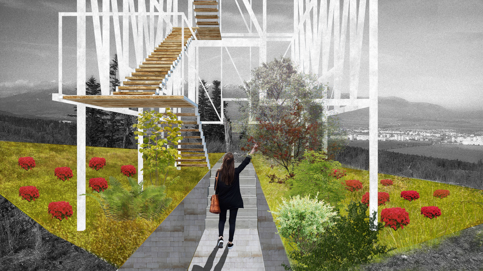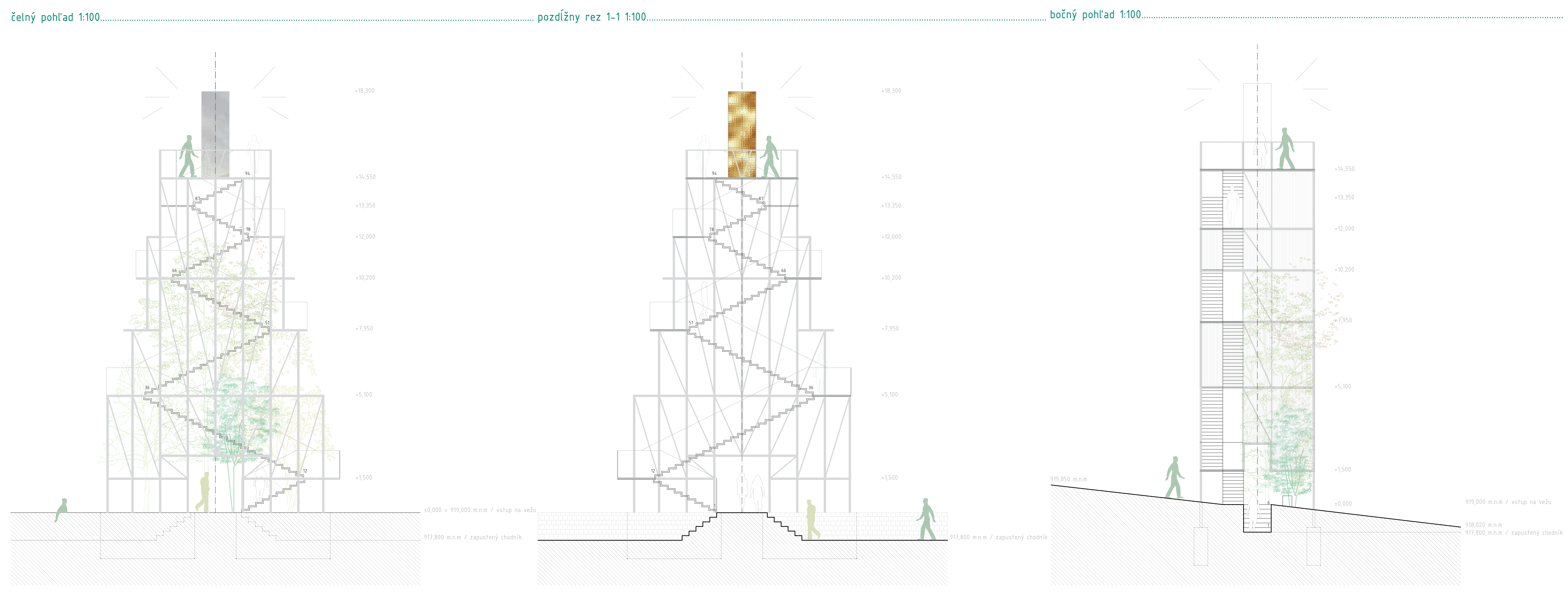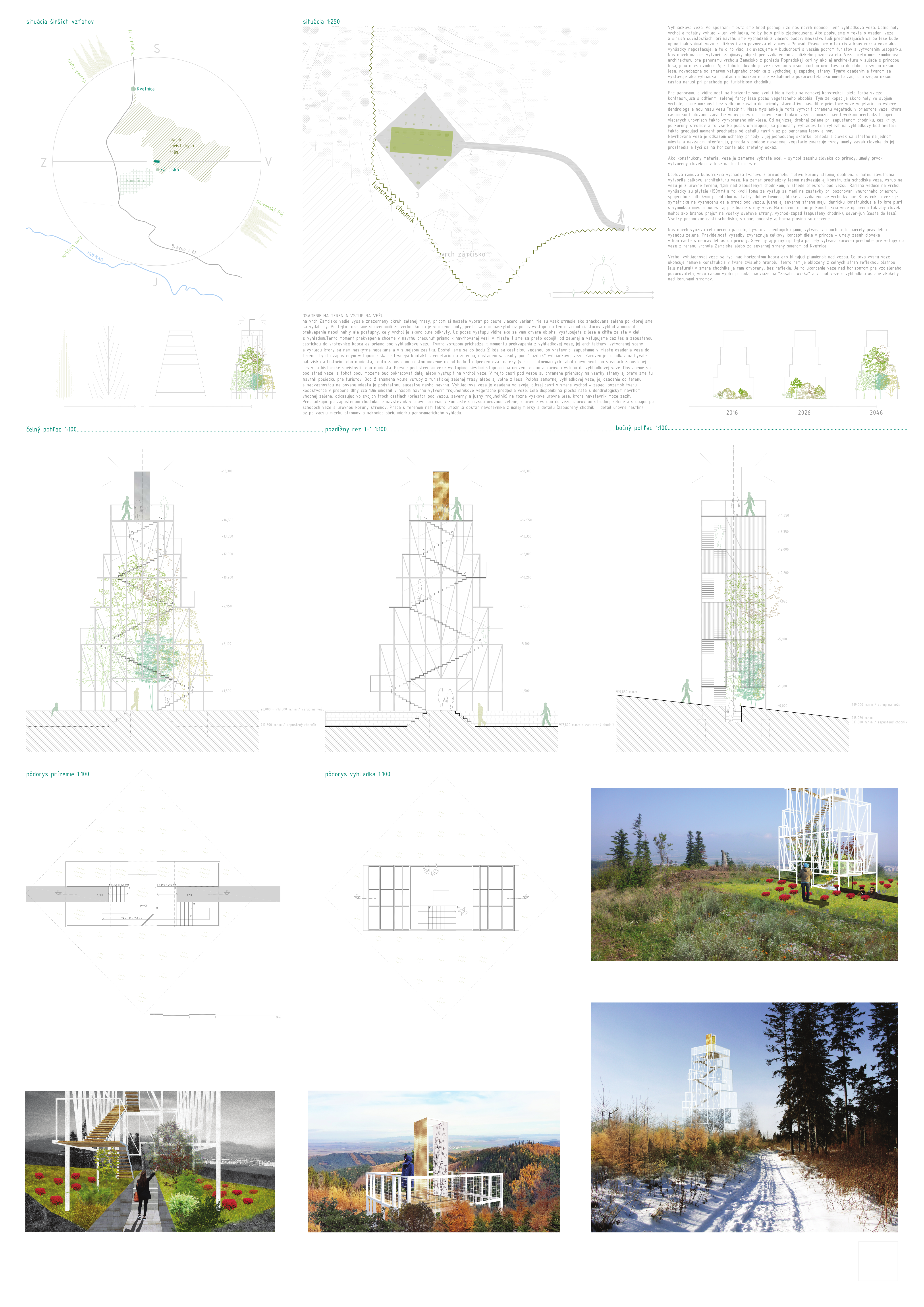 Pre panorámu a viditeľnosť na horizonte sme zvolili bielu farbu na rámovej konštrukcii, biela farba sviežo kontrastujúca s odtieňmi zelenej farby lesa počas vegetačného obdobia. Tým, že kopec je skoro holý vo svojom vrchole, máme možnosť bez veľkého zásahu do prírody starostlivo nasadiť v priestore veže vegetáciu po výbere dendrológa a ňou našu vežu "naplniť". Naša myšlienka je totiž vytvoriť chránenú vegetáciu v priestore veže, ktorá časom kontгоlovane zarastie voľný priestor rámovej konštrukcie veže a umožní návštevníkom prеchádzať popri viacerých úrovniach takto vytvoreného mini-lesa. Od najnižšej drobnej zelene pri zapustenom chodníku, cez kriky, po koruny stromov a to všetko počas otvárajúcej sa panorámy výhľadov. Len vyliezť na vyhliadkový bod nestačí, takto gradujúci moment prechádza od detailu rastlín a z po panorámu lesov a hôr. Navrhovaná veža je odkazom ochrany prírody v jej jednoduchej skratke, príroda a človek sa stretnú na jednom mieste a navzájom interferujú, príroda v podobe nasadenej vegetácie zmäkčuje tvrdý umelý zásah človeka do jej prostredia a týči sa na horizonte ako zreteľný odkaz.