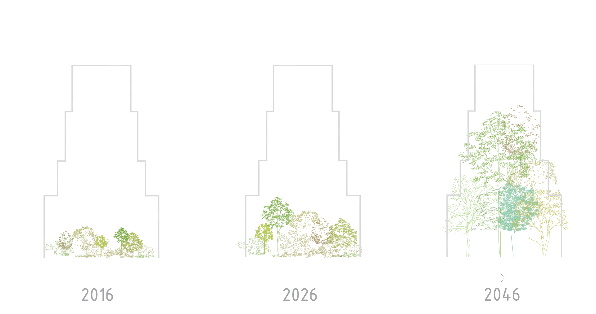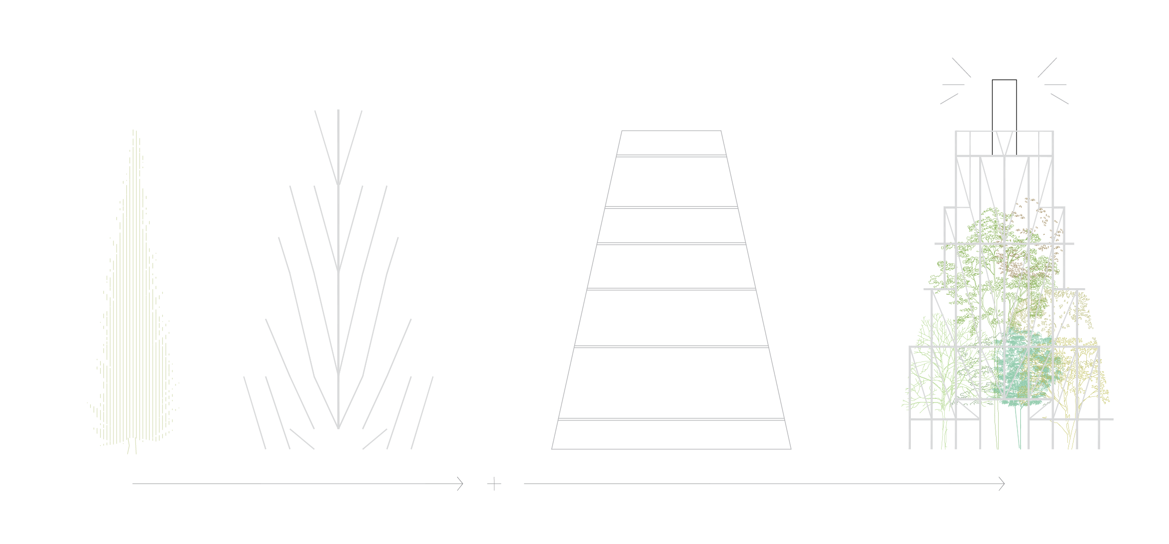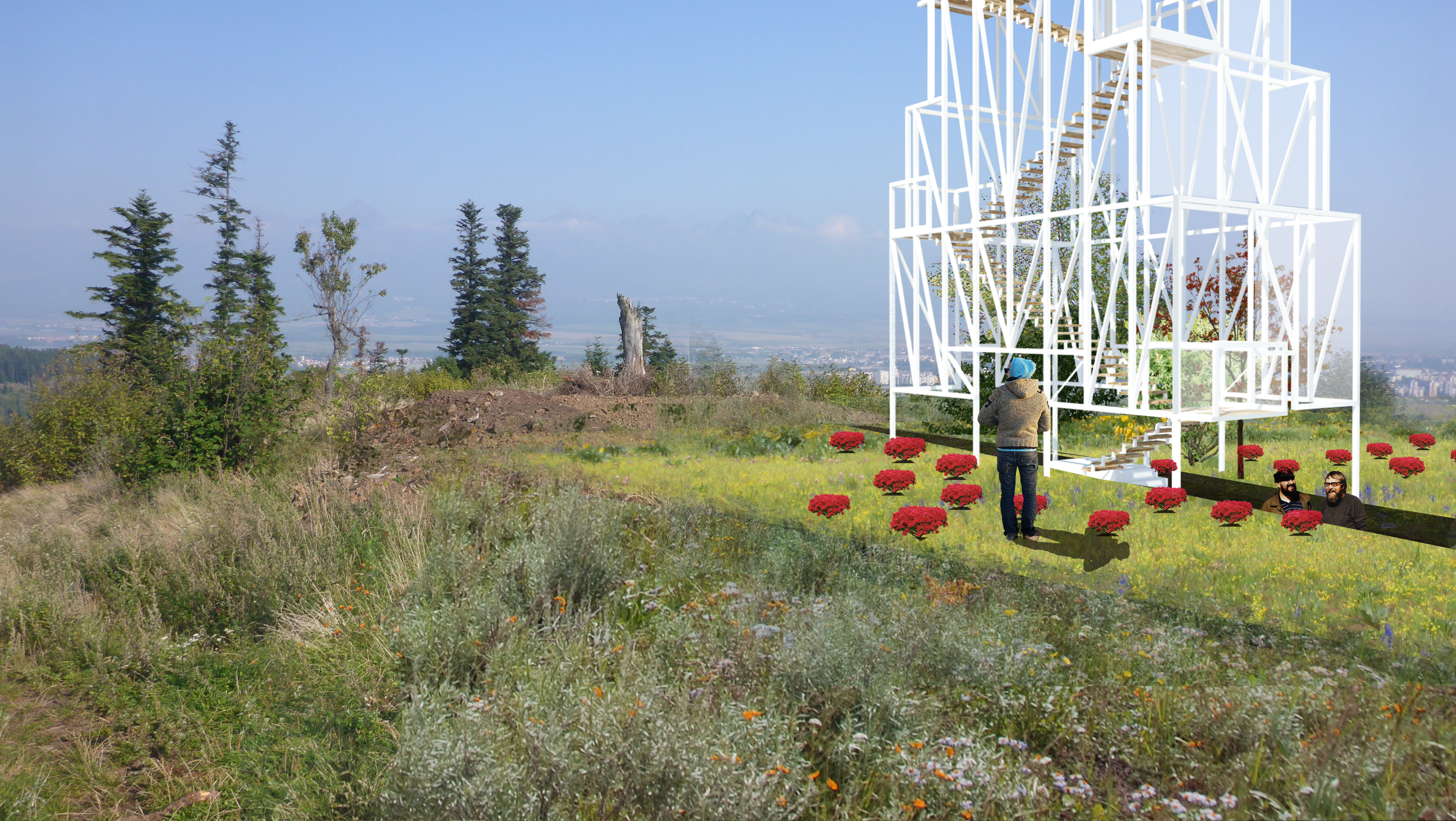Pre panorámu a viditeľnosť na horizonte sme zvolili bielu farbu na rámovej konštrukcii, biela farba sviežo kontrastujúca s odtieňmi zelenej farby lesa počas vegetačného obdobia. Tým, že kopec je skoro holý vo svojom vrchole, máme možnosť bez veľkého zásahu do prírody starostlivo nasadiť v priestore veže vegetáciu po výbere dendrológa a ňou našu vežu "naplniť". Naša myšlienka je totiž vytvoriť chránenú vegetáciu v priestore veže, ktorá časom kontгоlovane zarastie voľný priestor rámovej konštrukcie veže a umožní návštevníkom prеchádzať popri viacerých úrovniach takto vytvoreného mini-lesa. Od najnižšej drobnej zelene pri zapustenom chodníku, cez kriky, po koruny stromov a to všetko počas otvárajúcej sa panorámy výhľadov. Len vyliezť na vyhliadkový bod nestačí, takto gradujúci moment prechádza od detailu rastlín a z po panorámu lesov a hôr. Navrhovaná veža je odkazom ochrany prírody v jej jednoduchej skratke, príroda a človek sa stretnú na jednom mieste a navzájom interferujú, príroda v podobe nasadenej vegetácie zmäkčuje tvrdý umelý zásah človeka do jej prostredia a týči sa na horizonte ako zreteľný odkaz.