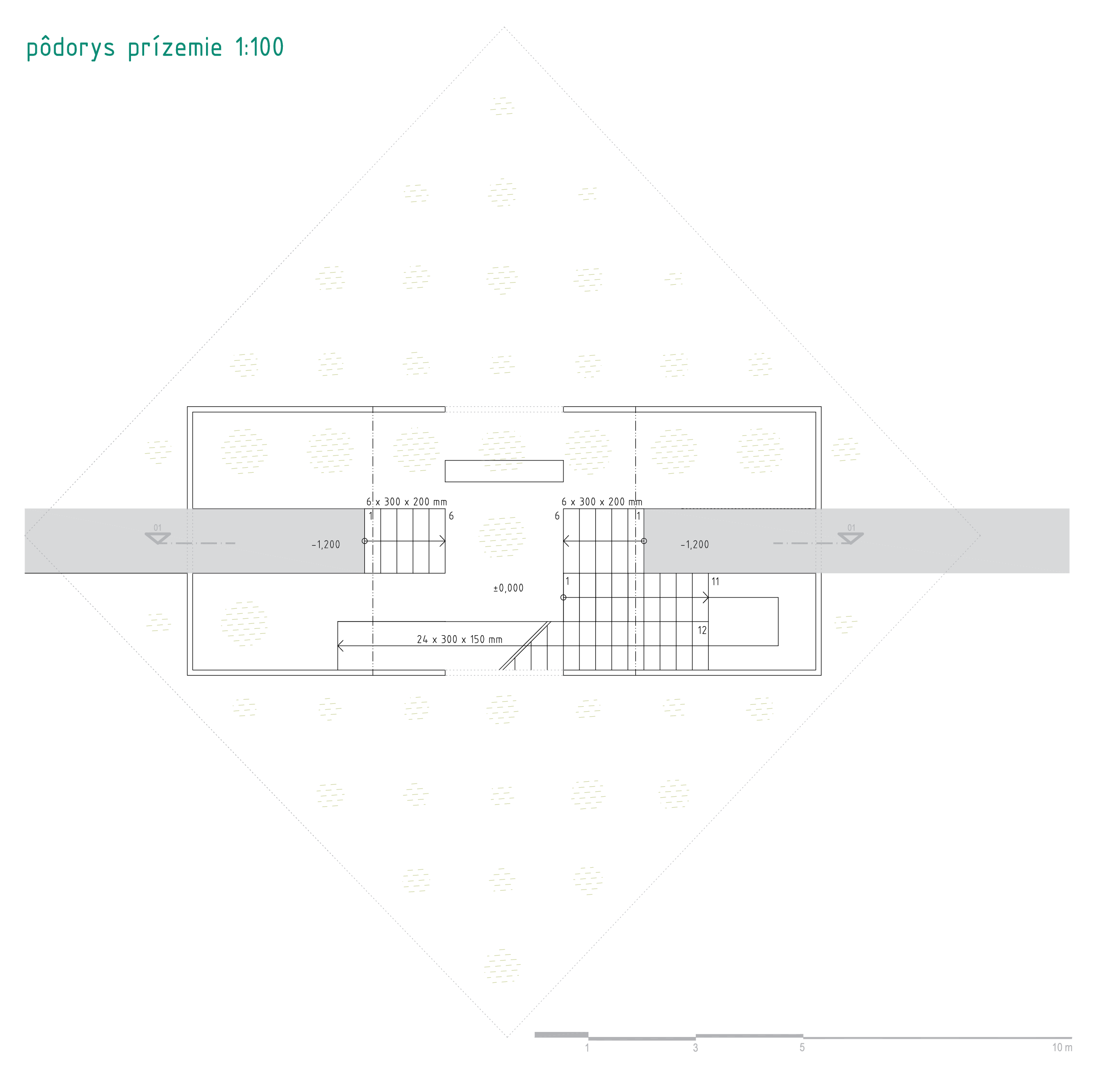Náš návrh využíva celú určenú parcelu, bývalú archeologickú jamu, vytvára v cípoch tejto parcely pravidelnú výsadbu zelene. Pravidelnosť výsadby zvýrazňuje celkový koncept diela v prírode – umelý zásah človeka v kontraste s nepravidelnosťou prírody. Severný aj južný cíp tejto parcely vytvára zároveň predpolie pre vstupy do veže z terénu vrchola Zámčiska alebo zo severnej strany smerom od Kvetnice.