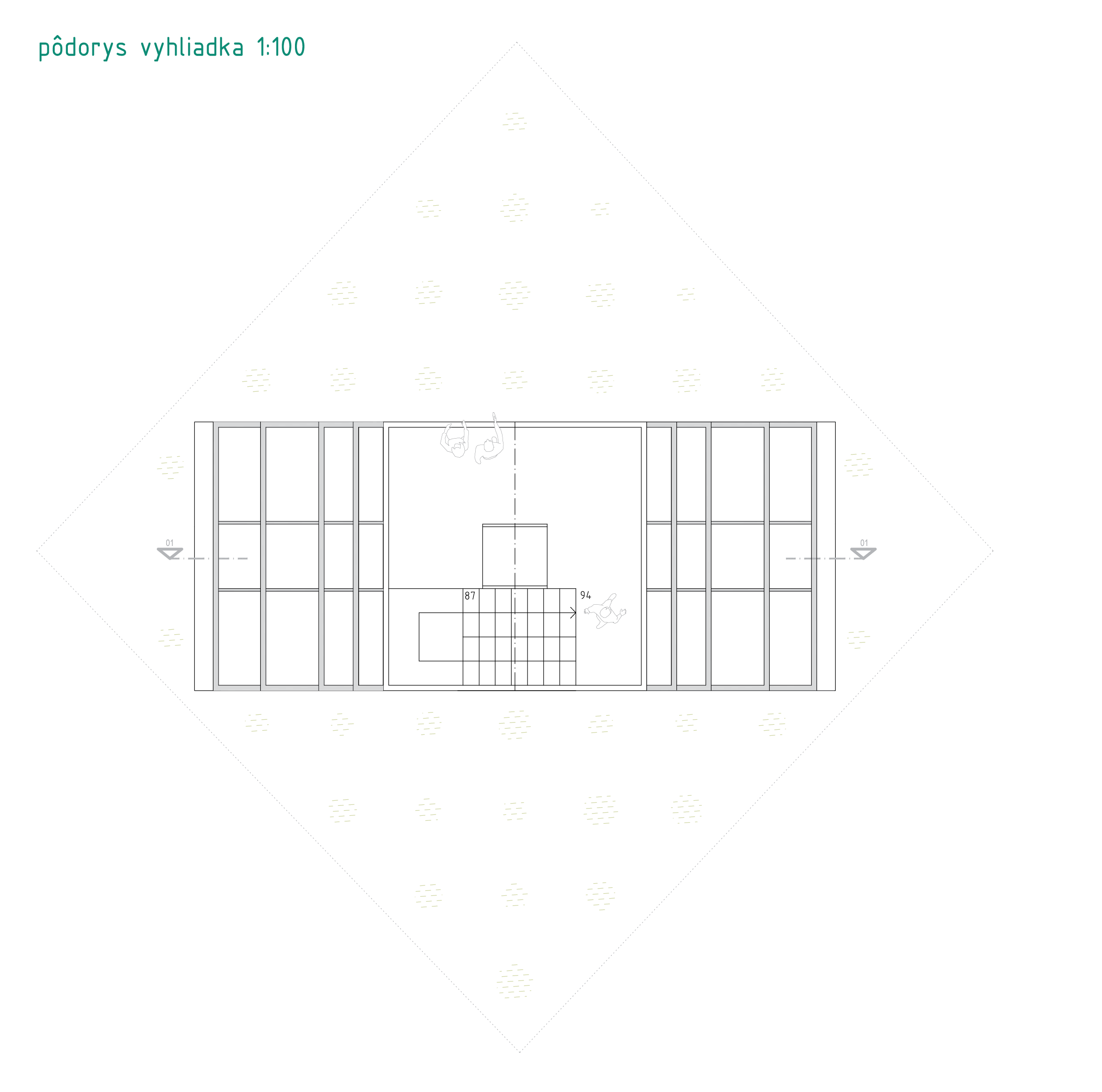 Vyhliadková veža je osadená vo svojej dlhšej časti v smere východ – západ, pozemok tvaru kosoštvorca v prepone dlhy cca 18m umožnil v našom návrhu vytvoriť trojuholníkové vegetačné predpolia veže. Celá disponibilná plocha ráta s dendrologickým návrhom vhodnej zelene, odkazujúc vo svojich troch častiach (priestor pod vežou, severný a južný trojuholník) na rôzne výškové úrovne lesa, ktoré návštevník môže zaži. Prechádzajúc po zapustenom chodníku je návštevník v úrovni očí viac v kontakte s nižšou úrovňou zelene, z úrovne vstupu do veže strednej zelene a stúpajúc po schodoch s úrovňou koruny stromov. Práca s terénom nám takto umožnila dostať návštevníka z malej mierky detailu ( zapustený chodník – detail úrovne rastlín) až po väčšiu mierku stromov a nakoniec obriu mierku panoramatického výhľadu.