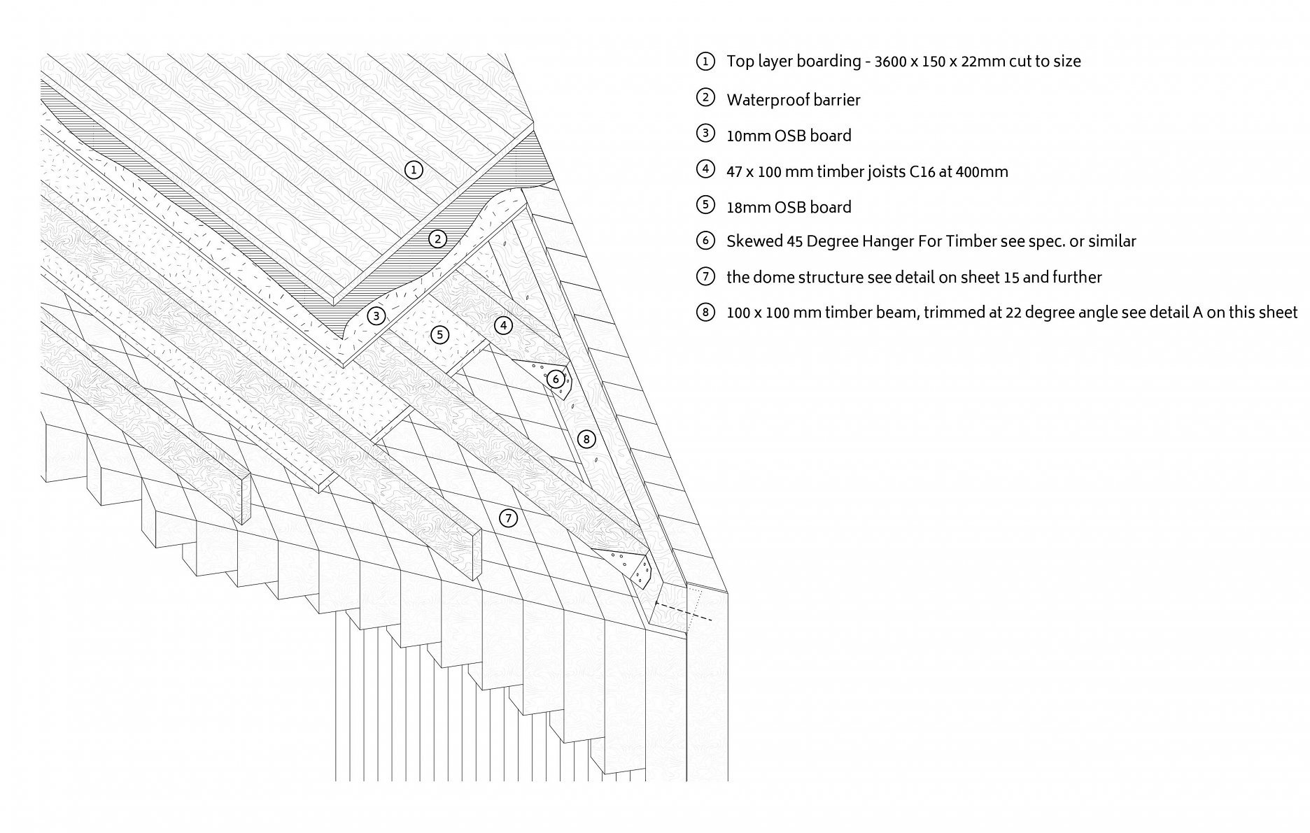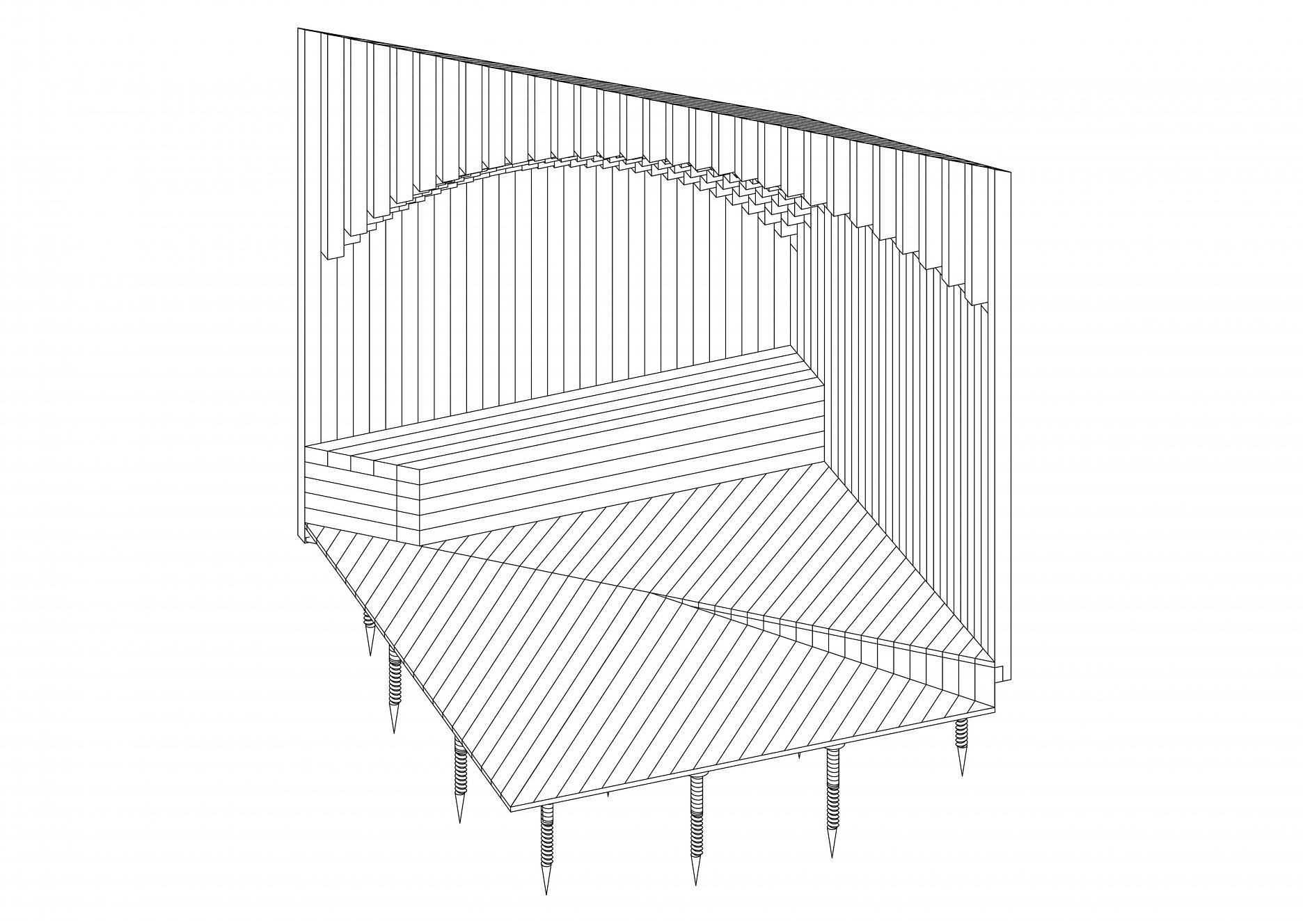 Kupola strechy je vygenerovaná skriptom, odpočítaním elipsoidu z jednoduchej geometrie. Poloha elipsoidu narúša symetriu základnej formy. Rampa dotvára štvorcový pôdorys.