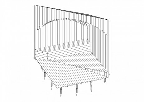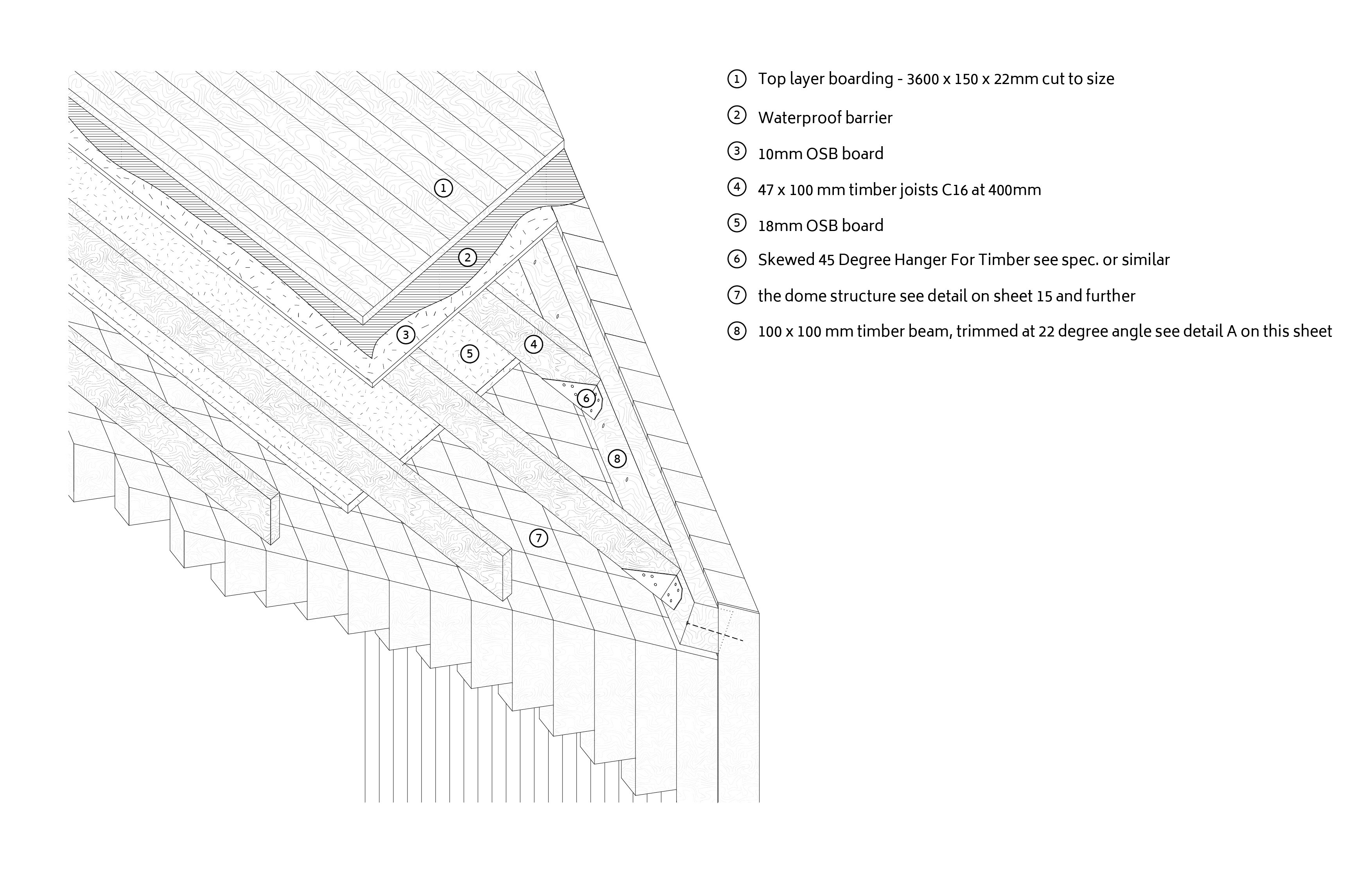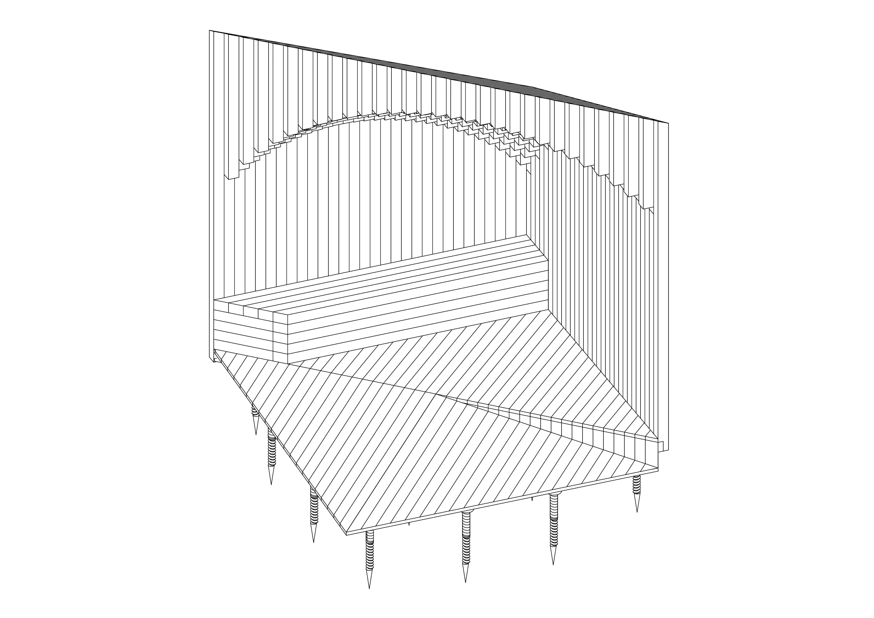Kupola strechy je vygenerovaná skriptom, odpočítaním elipsoidu z jednoduchej geometrie. Poloha elipsoidu narúša symetriu základnej formy. Rampa dotvára štvorcový pôdorys.