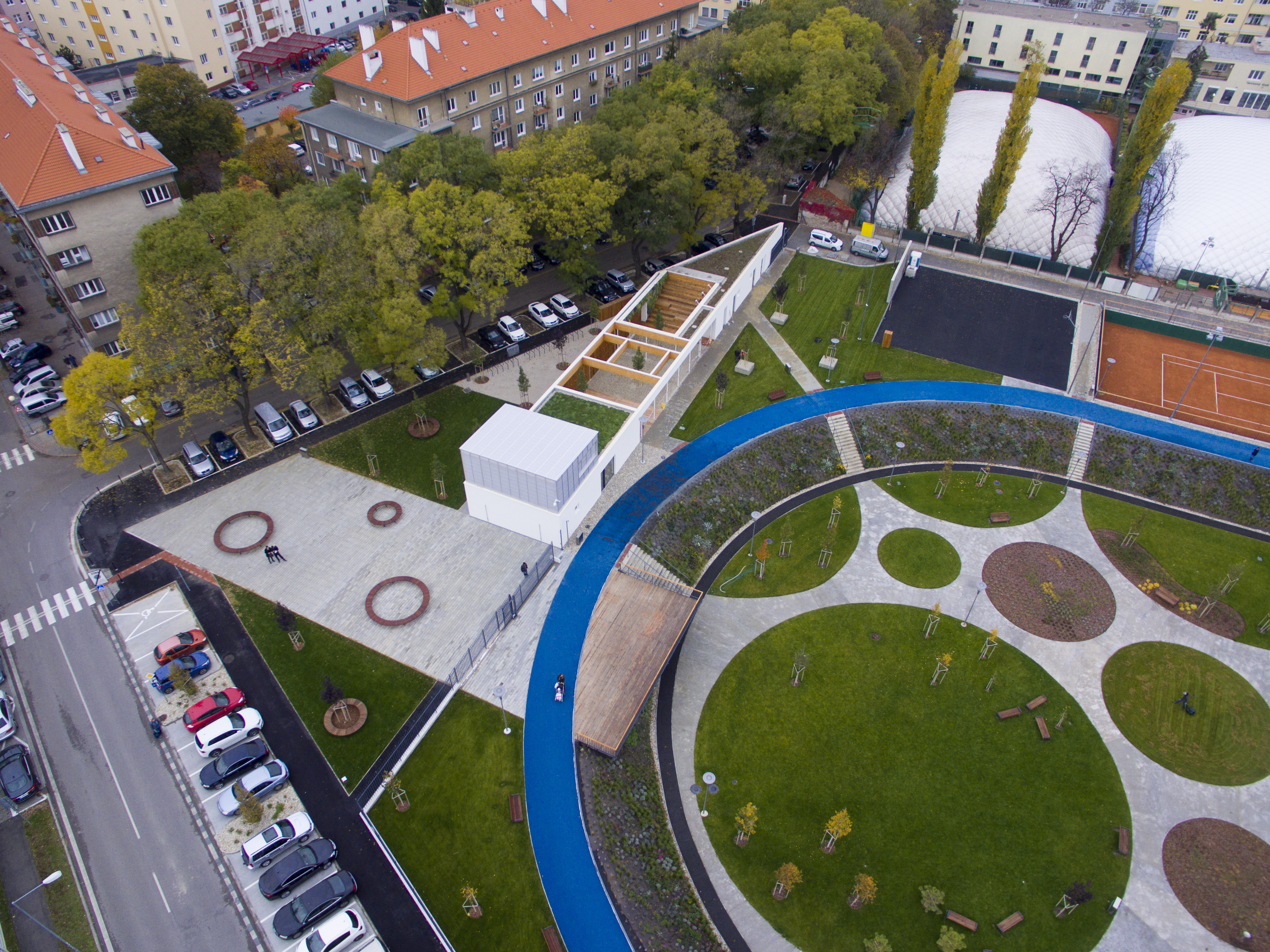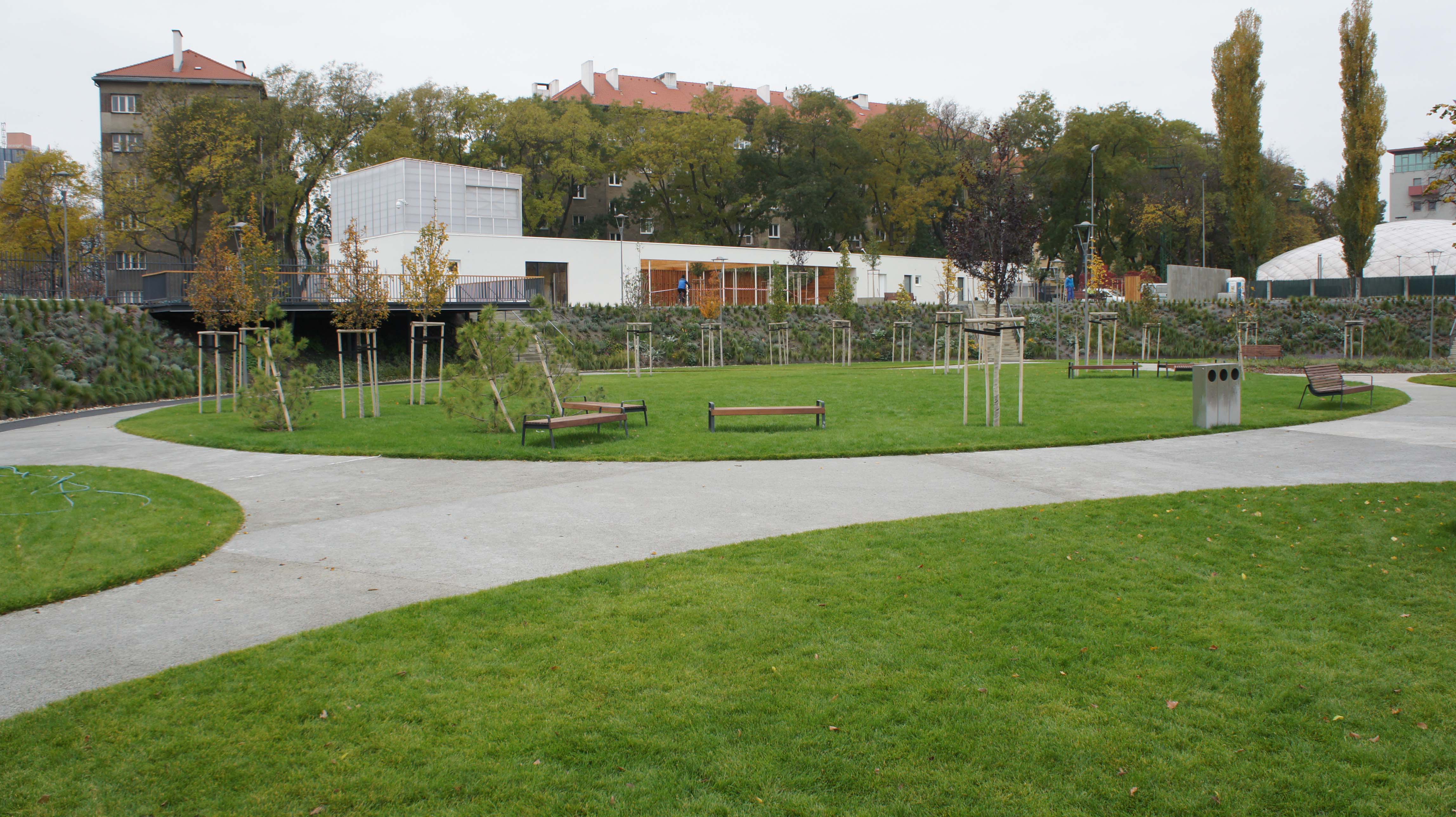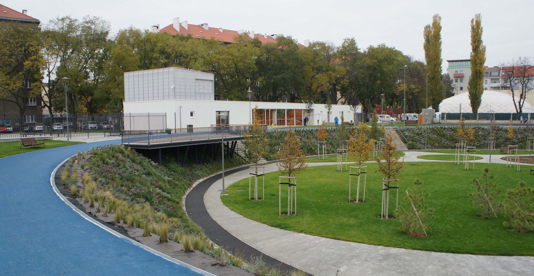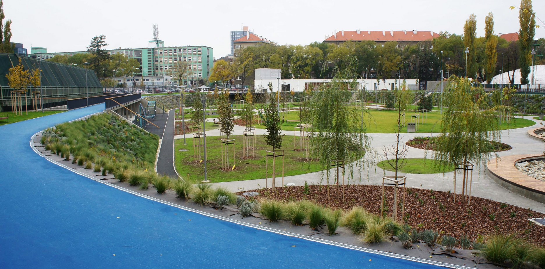 DŠ: Jeden z kľúčových momentov návrhu bolo vyriešenie dopravy, či už statickej alebo dynamickej. Už len tým, že išlo o bývalý cykloštadión bola jedna z našich priorít zakomponovať bicykle aj do fungovania areálu, či už v podobe ponechanej dráhy alebo v navrhnutí podpornej cyklo-vybavenosti (prenájom bicyklov a ich údržba). Nakoniec, cyklodráha (slúžiaca aj pre in-line) dotvára jasnú identitu parku aj jeho odkaz na históriu tohto miesta. Pri návrhu sme počítali z jeho úplným otvorením, ale z prevádzkových dôvodov a pod tlakom okolitých subjektov sa musel oplotiť.