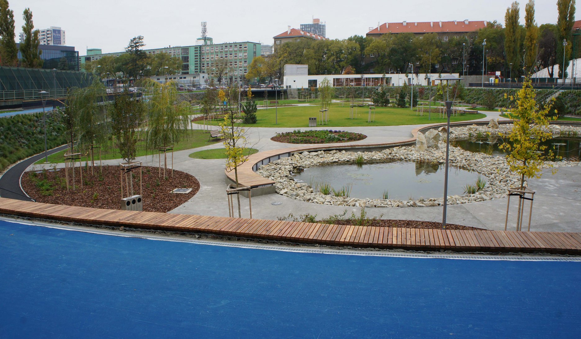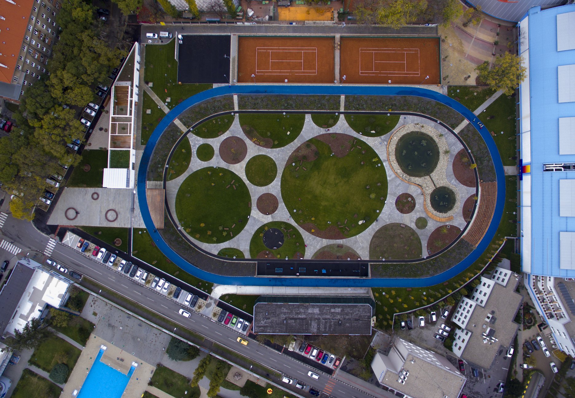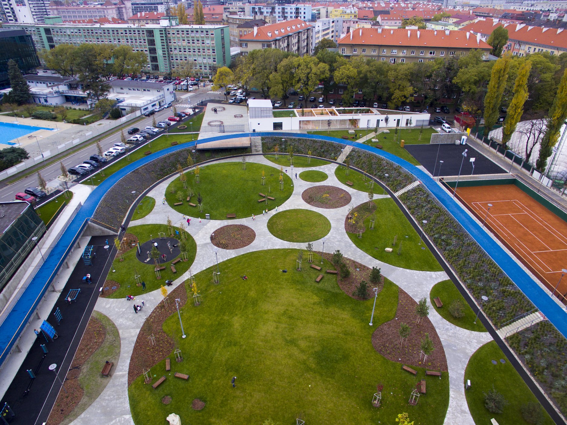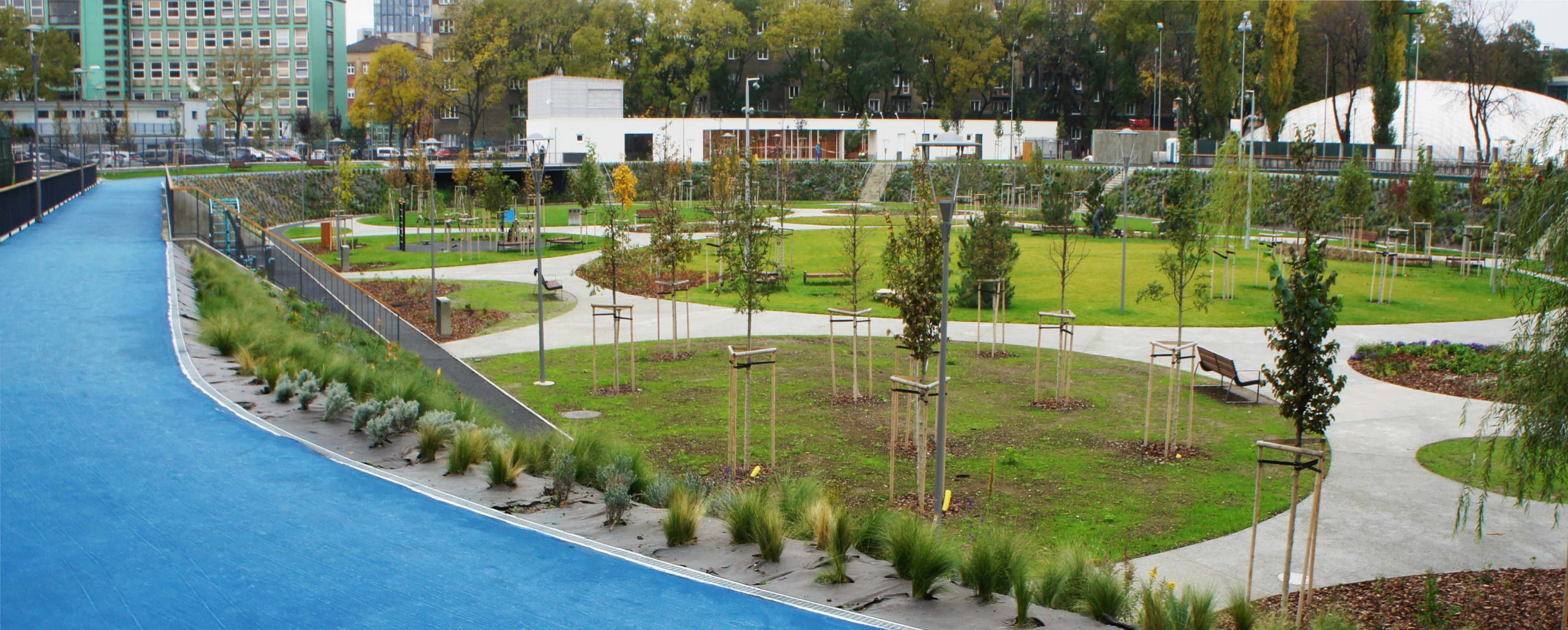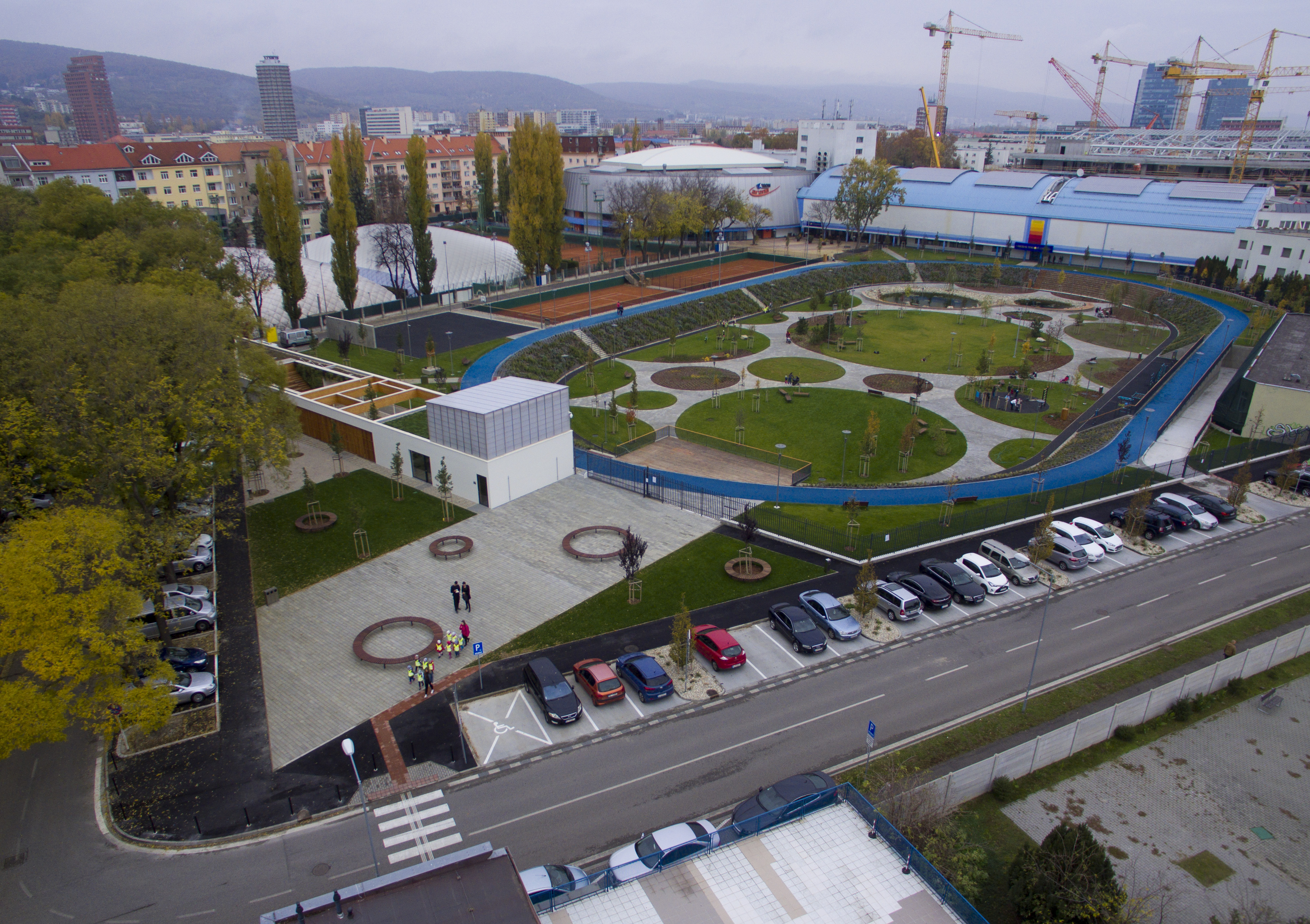 DŠ: Jeden z kľúčových momentov návrhu bolo vyriešenie dopravy, či už statickej alebo dynamickej. Už len tým, že išlo o bývalý cykloštadión bola jedna z našich priorít zakomponovať bicykle aj do fungovania areálu, či už v podobe ponechanej dráhy alebo v navrhnutí podpornej cyklo-vybavenosti (prenájom bicyklov a ich údržba). Nakoniec, cyklodráha (slúžiaca aj pre in-line) dotvára jasnú identitu parku aj jeho odkaz na históriu tohto miesta. Pri návrhu sme počítali z jeho úplným otvorením, ale z prevádzkových dôvodov a pod tlakom okolitých subjektov sa musel oplotiť.