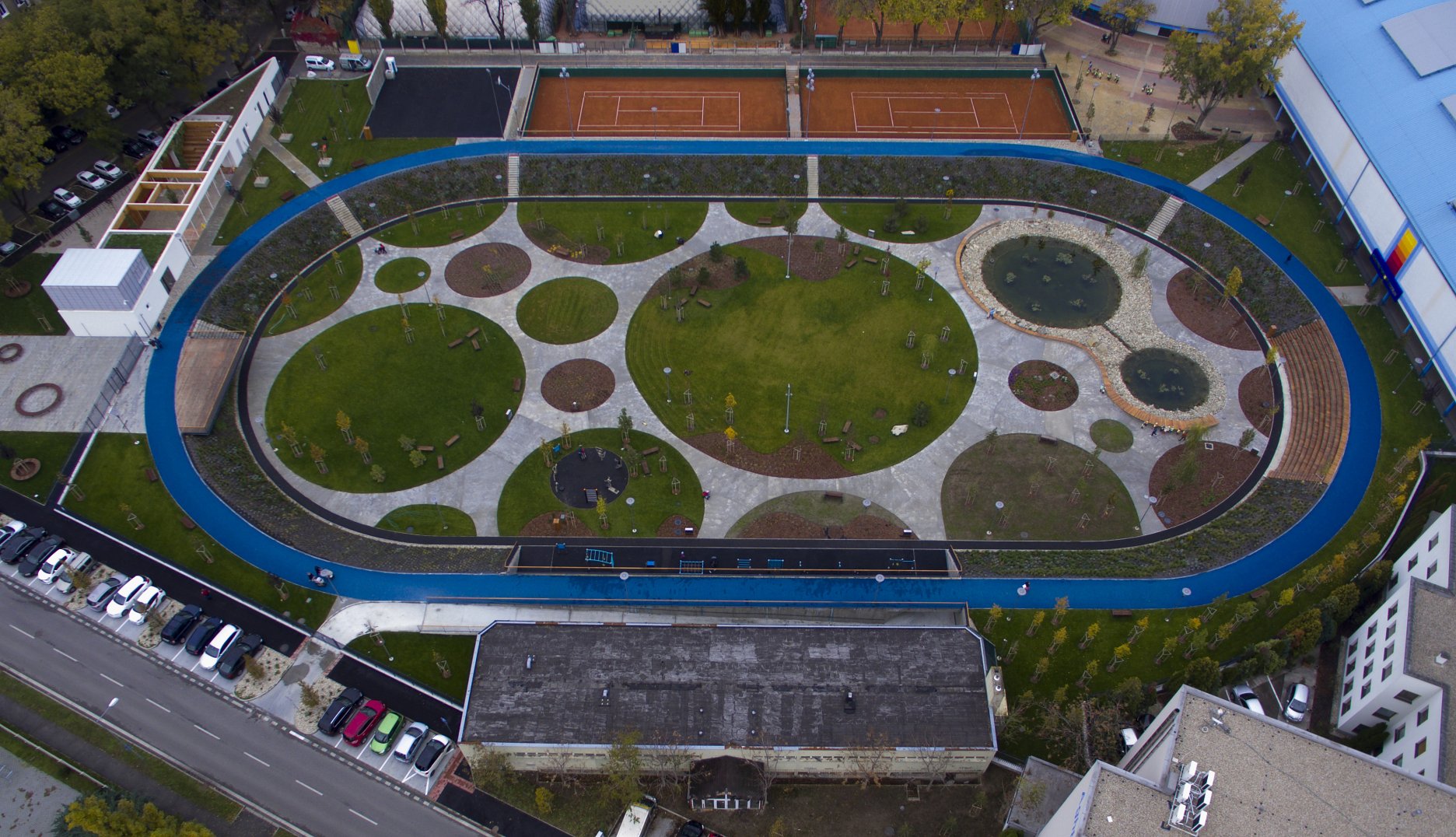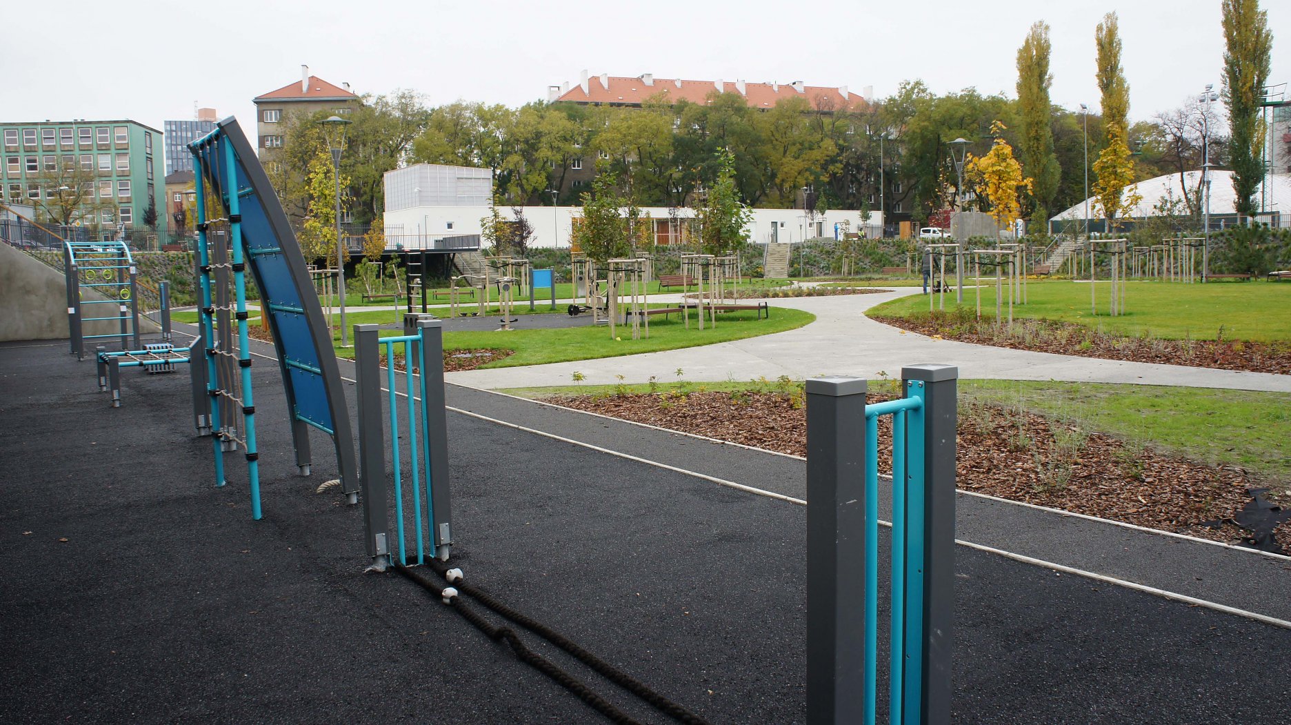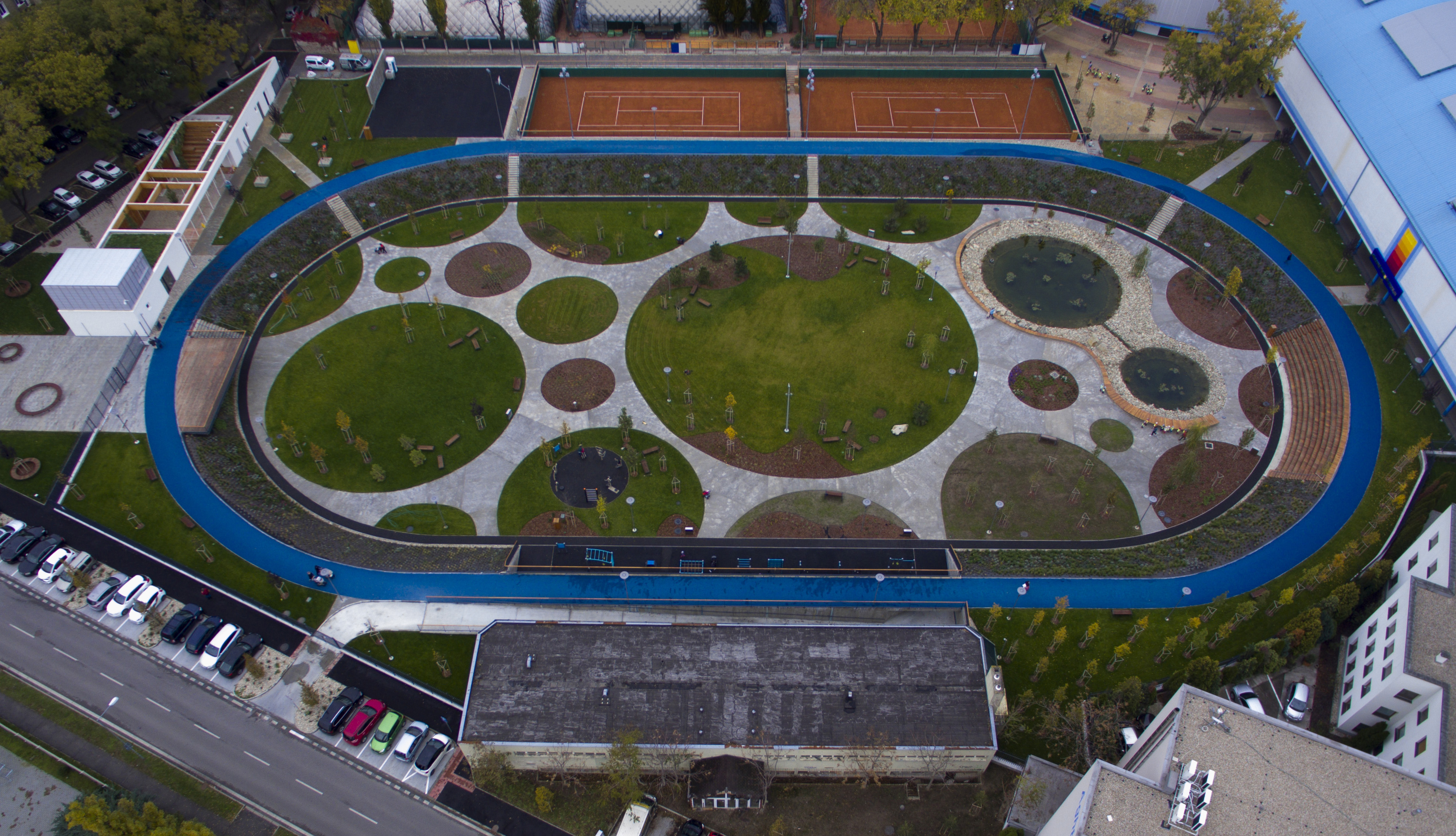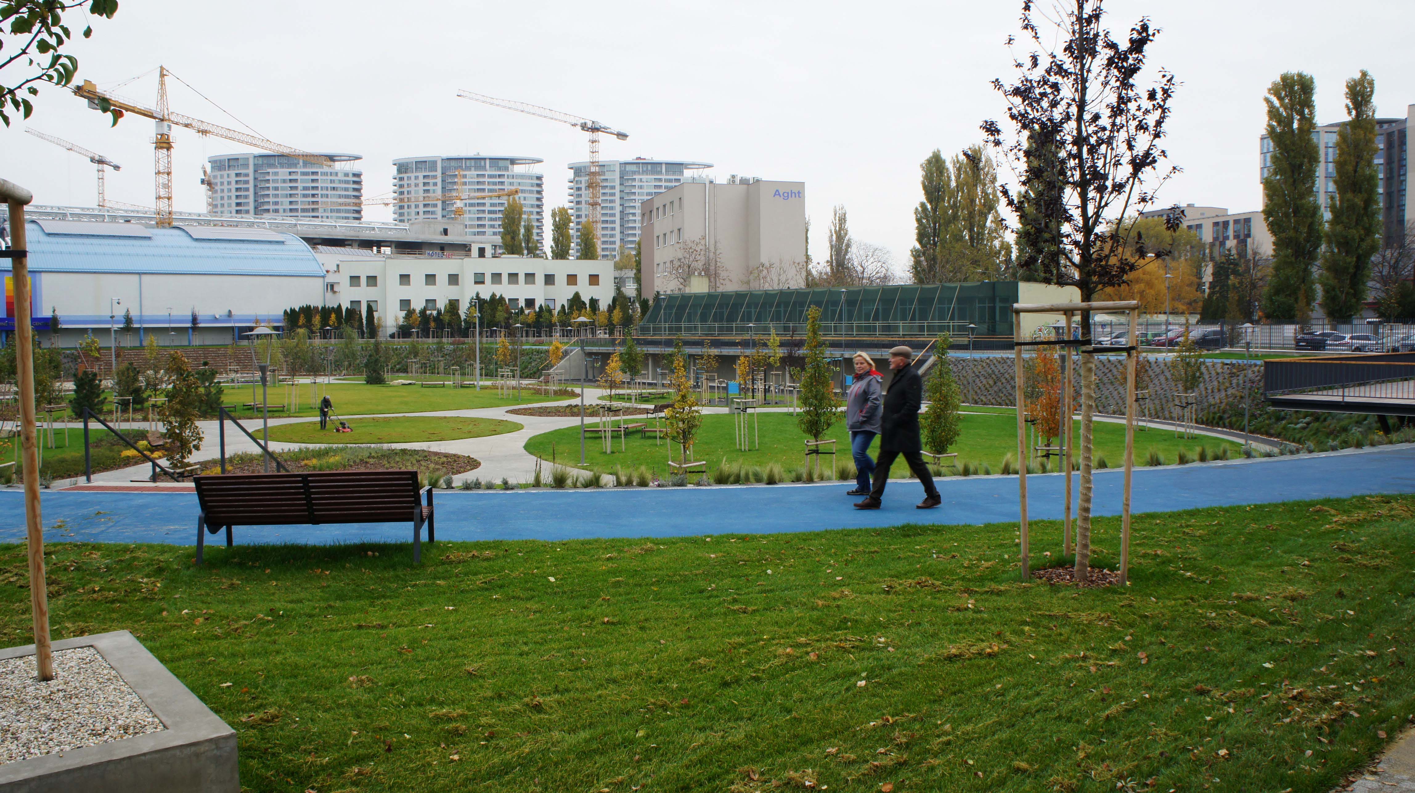 DŠ: Jeden z kľúčových momentov návrhu bolo vyriešenie dopravy, či už statickej alebo dynamickej. Už len tým, že išlo o bývalý cykloštadión bola jedna z našich priorít zakomponovať bicykle aj do fungovania areálu, či už v podobe ponechanej dráhy alebo v navrhnutí podpornej cyklo-vybavenosti (prenájom bicyklov a ich údržba). Nakoniec, cyklodráha (slúžiaca aj pre in-line) dotvára jasnú identitu parku aj jeho odkaz na históriu tohto miesta. Pri návrhu sme počítali z jeho úplným otvorením, ale z prevádzkových dôvodov a pod tlakom okolitých subjektov sa musel oplotiť.