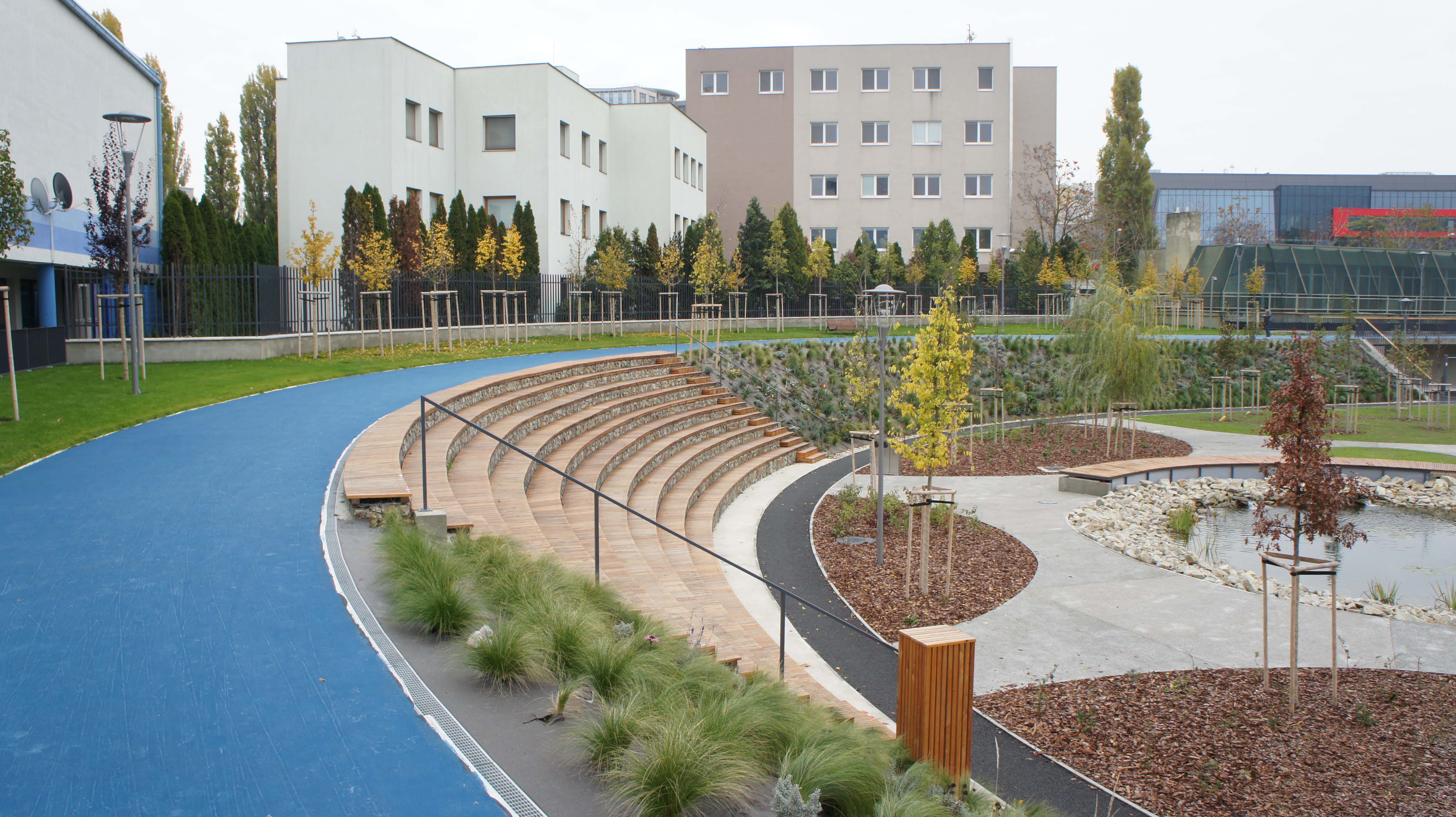 DŠ: Blízkosť významných mestských športových areálov, niektoré aj celoslovenského významu (NFŠ, NTC, Zimný štadión), v kombinácií s obytnou zónou prevažne so starším obyvateľstvom a neďalekou vysokou školou je už samo o sebe zaujímavým urbánnym stretom. Mix ľudí, migrujúcich za prácou, športom, školou a poloha tohto areálu predurčovala toto miesto na relax a aktívny oddych. Snaha bola práve spomaliť hektický pohyb, vniesť do územia kľud a vytvoriť zelenú "oázu" odfiltrovanú od neďalekého frekventovaného mestského ruchu. K tomu nám paradoxne dopomohla "jama" po bývalom cykloštadióne, a tak zo slabej stránky sme vyťažili maximum.
