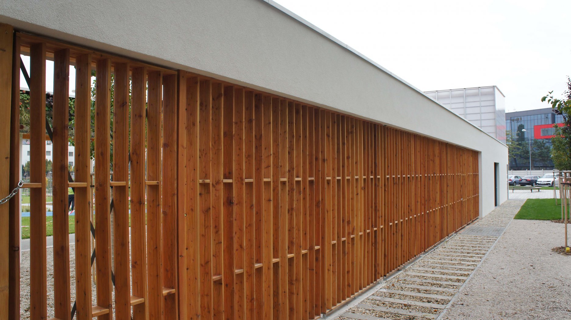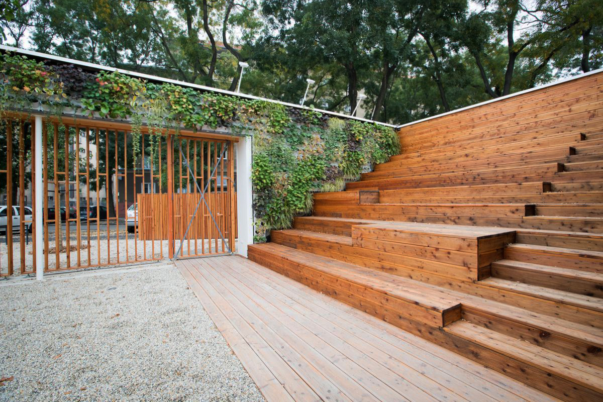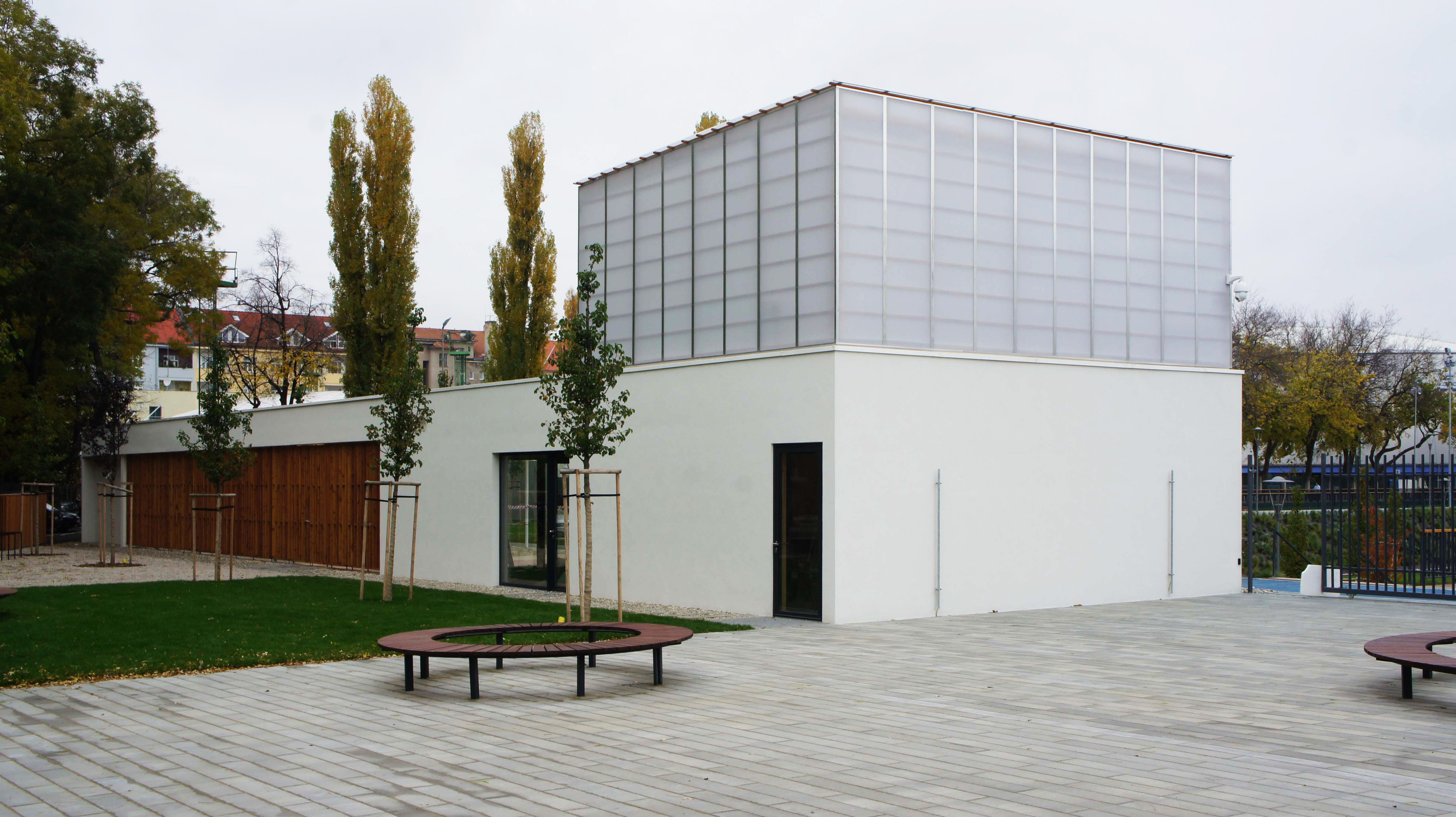 KB: Cieľom bolo okrem iného návrhom zareagovať aj na samotný verejný priestor od Kalinčiakovej ulice. Situovanie servisného objektu svojim natočením reaguje na park tak, aby sa zväčšil priestor smerom do ulice. Ten vyúsťuje do nástupného mikro-námestia, vďaka ktorému park Jama získal dôležitý verejný priestor, voľne prístupný z ulice. Za pozornosť stojí realizácia vegetačnej steny a strechy, ktoré sú súčasťou servisného objektu. Vegetačné steny sú samé o sebe v Bratislave témou skôr využívanou v interiéroch. My sme naopak chceli vniesť tento princíp do exeriéru.