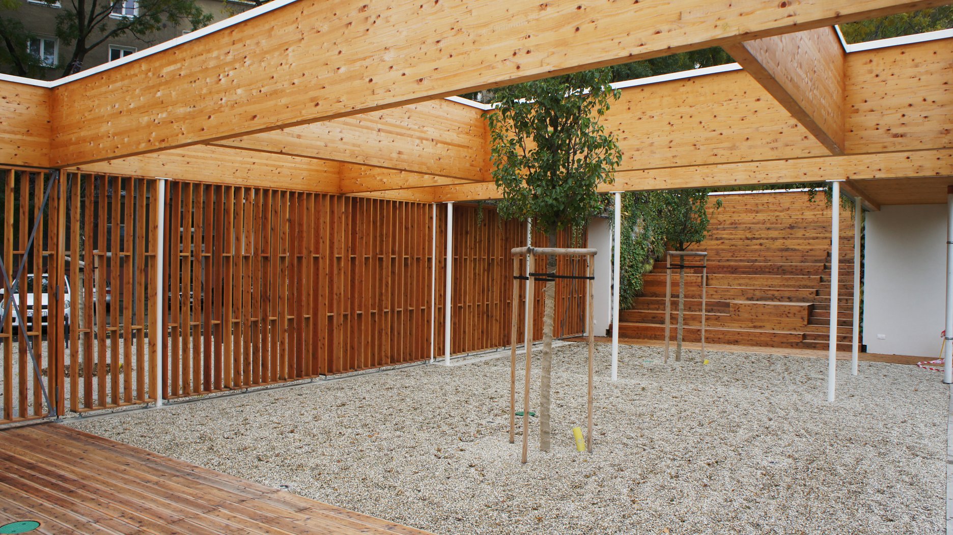 DŠ: Z technického hľadiska dôležitou podmienkou, s ktorou sme museli už od začiatku pracovať (bola to aj požiadavka Nórskych fondov), bol manažment dažďových vôd. Územie by sa malo vysporiadať s prívalom "100-ročného" dažďa. K tomu slúži rozsiahla drenážna sieť. Retenčná nádrž - jazierko je jediná viditeľná časť. Možno zaujímavým momentom bude vegetačná stena pri tribúnovom sedení a samotná stavba servisného objektu z CLT- panelov.