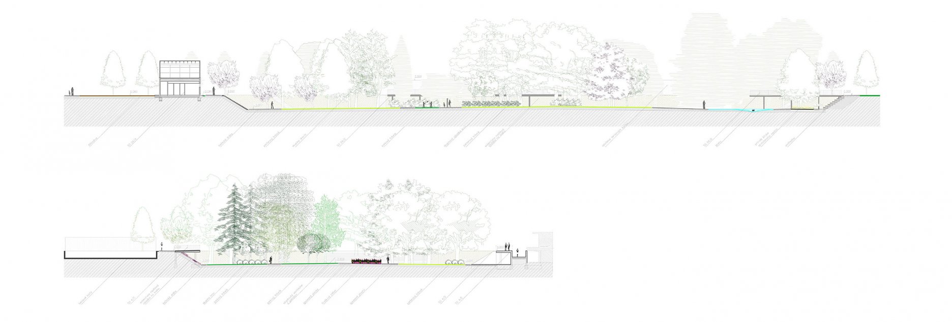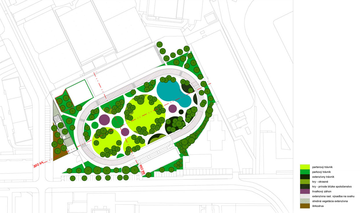 KB: Súčasťou zadania súťaže bola aj možnosť uvažovať s navrhnutím podzemných garáží. My sme nad touto alternatívou strávili nejaký čas, ale následne sme ju vylúčili z viacerých dôvodov. Najdôležitejším argumentom sa stala snaha vytvoriť návrh, ktorý by sa priblížil z pohľadu enviromentálnych a ekologických aspektov a kvality manažmentu zrážkových vôd, novým trendom v tvorbe verejných priestorov, ktoré poznáme zo zahraničia. Kedže sa jednalo o pilotný projekt takéhoto druhu na Slovensku, bolo jasné, že vytvorenie betónovej vane v podobe podzemných garáží by nenapĺňalo spomínané požiadavky na park.