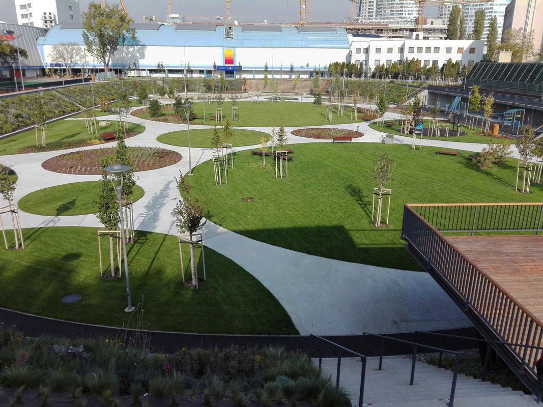 Výsadba parku prebiehala pod dohľadom záhradného architekta Eugena Lipku. Sleduje architektonický koncept autorov s charakteristickými zónami voľnočasového areálu. Horný "mestský" parter je typický pravidelným rastrom ovocných stromov a upravenými trávnikmi. Dolná "prírodná" etáž je špecifická organickým tvarovaním chodníkov a nesúrodou výsadbou stromov, ktoré kopírujú trávnaté plochy s nižším nárokom na údržbu. V zadnej časti parku nájdeme extenzívnu zeleň, takmer bez zásahu človeka. "Ideový koncept spodnej úrovne je myslený ako nedbalá elegancia no nie anarchia", dodávajú autori. Prevládajú tu autochtónne a rýchlo rastúce druhy. Svahový ovál, ktorý tvorí prechod medzi hornou a dolnou úrovňou parku je porastený spoločenstvom extenzívnych rastlín.