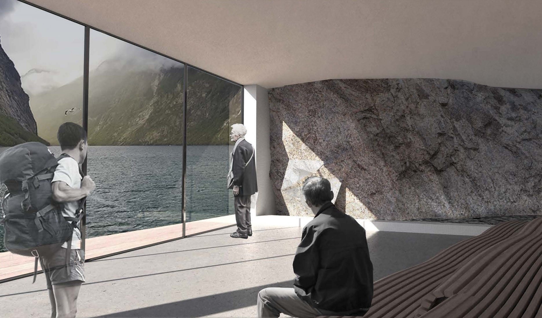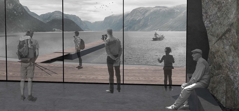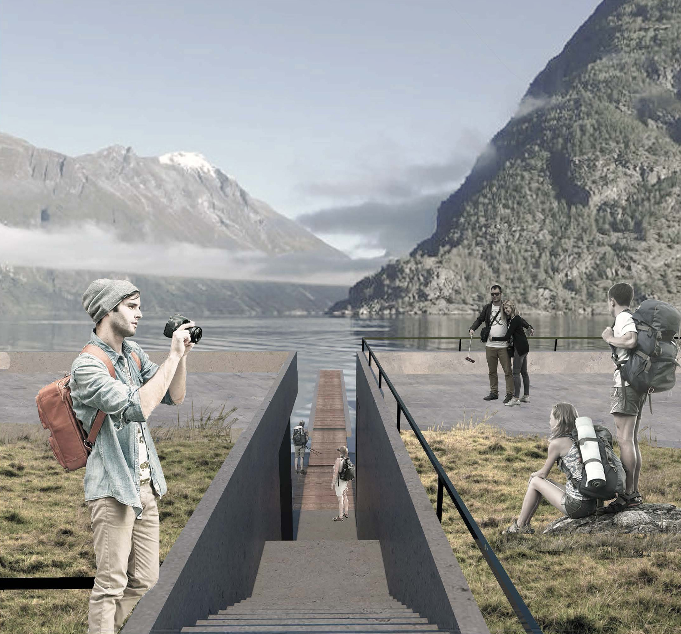 Vyhliadková trasa je delená na tri časti. Časť "A" predstavuje začiatok trasy - je tvorená prístavným mólom pre výletné lode, verejnými toaletami, objektom pre pozorovanie krajiny/čakáreň a promenádou s rekreačnou funkciou. Samotná vyhliadka - časť "B" je situovaná v blízkosti farmy Knivsflå, ktorá sa spája s históriou fjordu. Do historických kamenných múrov neďaleko farmy sú situované objekty tak aby eliminovali periférne videnie vo voľnej prírode, čo má za následok, zmenu vnímania scenérie fjordu a upriamenie pozornosti sledovateľa na hlavné krajinotvorné prvky. Záver trasy časť "C" sa nachádza v blízkosti najznámejšieho vodopádu s názvom Sedem sestier. Táto časť slúži ako vyhliadka avšak primárne ako miesto na možnosť športovej aktivity bezmotorového lietania - paraglidingu. V tomto prípade slúži lietanie ako prostriedok na opätovnú zmenu perspektívy vnímania krajiny fjordu.