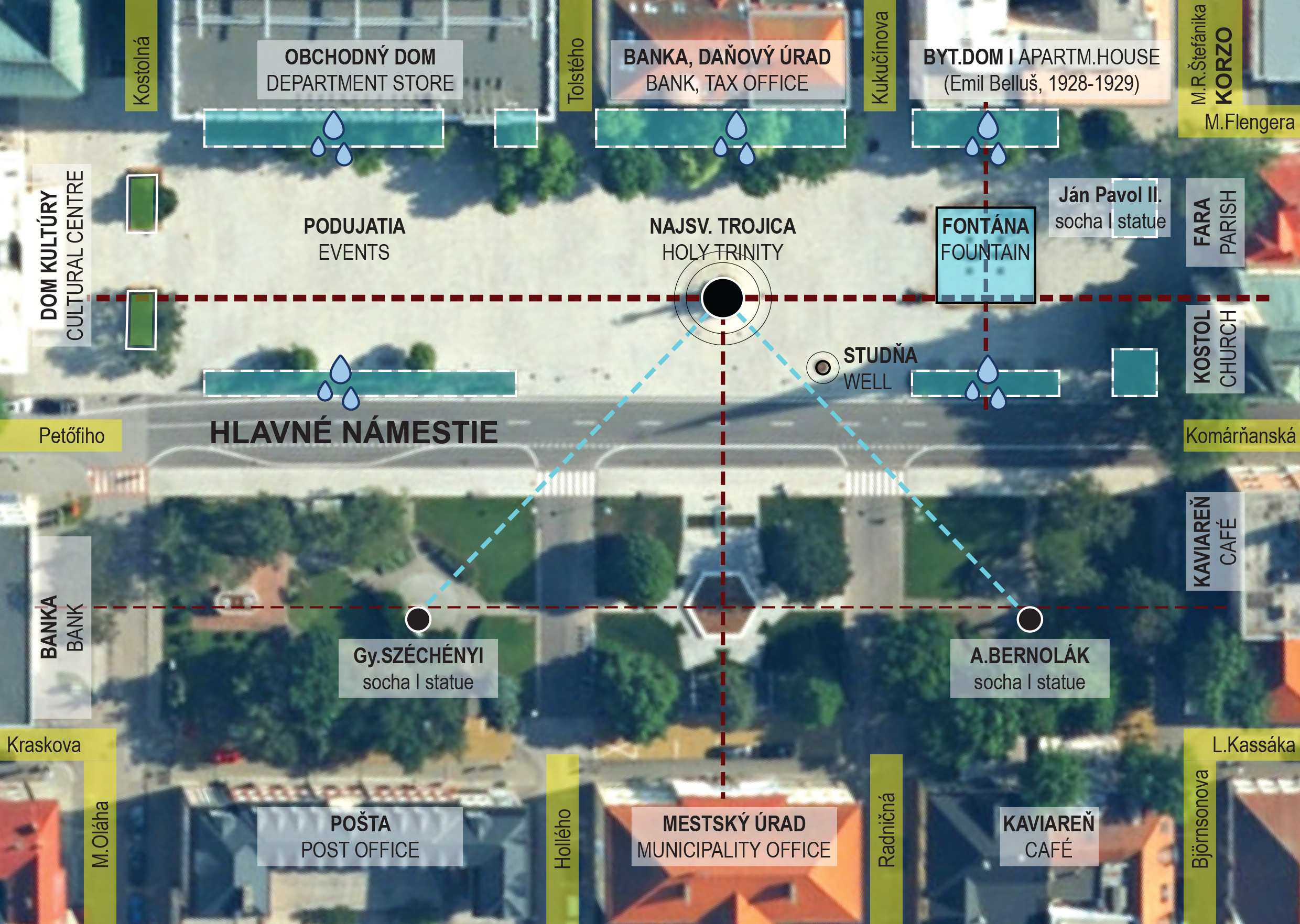 Hlavné námestie je pomyselnou “obývačkou” mesta. Konajú sa na ňom rôzne podujatia - koncery, tradičný jarmok Porciunkula, vianočné trhy a ďalšie. Počas týchto podujatí sa rozsiahle otvorené priestory premenia na útulný exteriér s dočasnými prvkami.