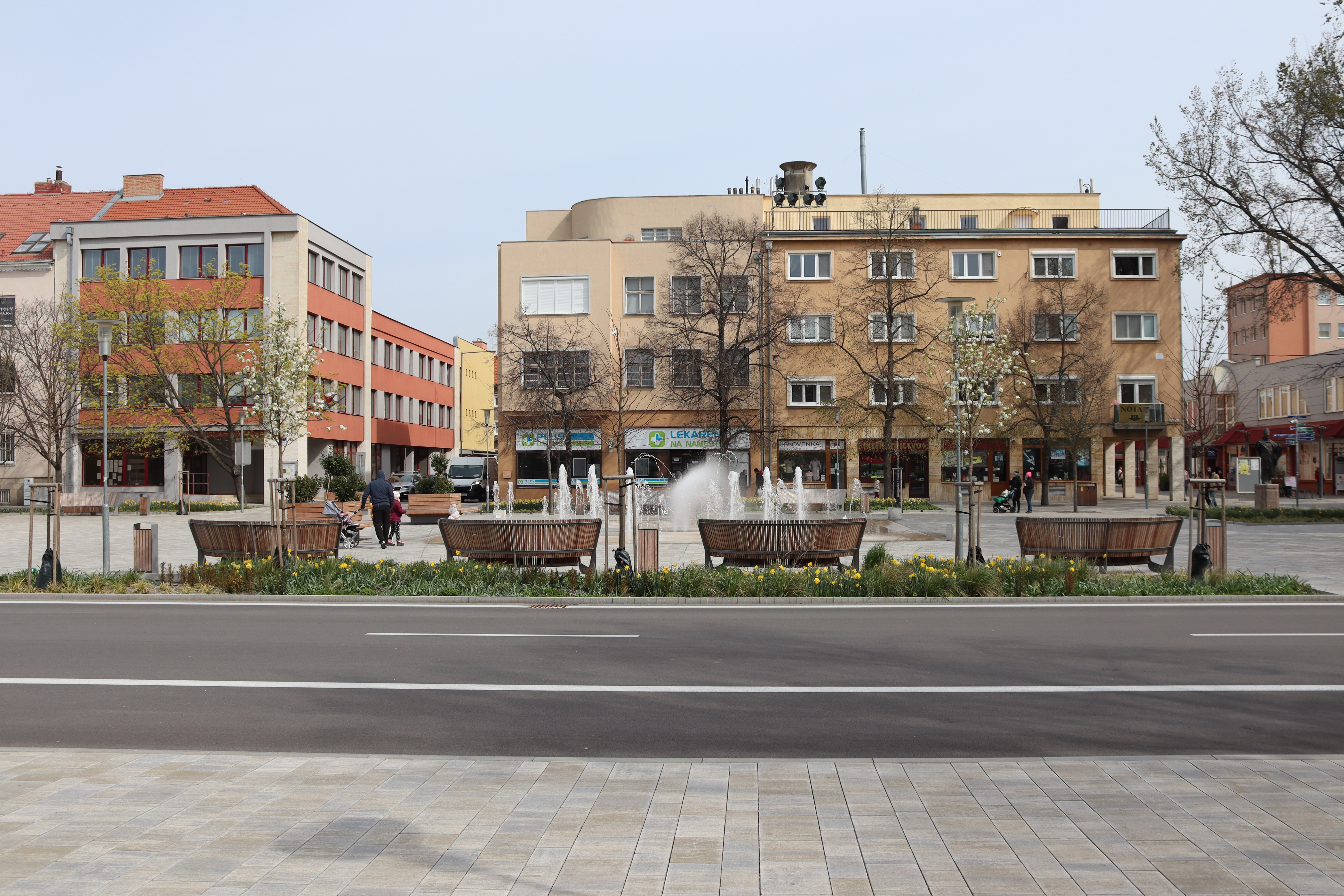 Navrhovaný dynamický vodný prvok (úrovňovú fontánu v dlažbe) navrhujeme osadiť tak, aby bola z oboch strán rovnako vzdialená od lineárnych záhonových pásov. Vodný prvok bude osadený na hlavnej pohľadovej osi medzi kostolom a kultúrnym domom. Lavičky sú osadené tak, aby pre návštevníkov a užívateľov priestoru ponúkli atraktívne sedenie s výhľadom na dynamickú vodu v priestore.