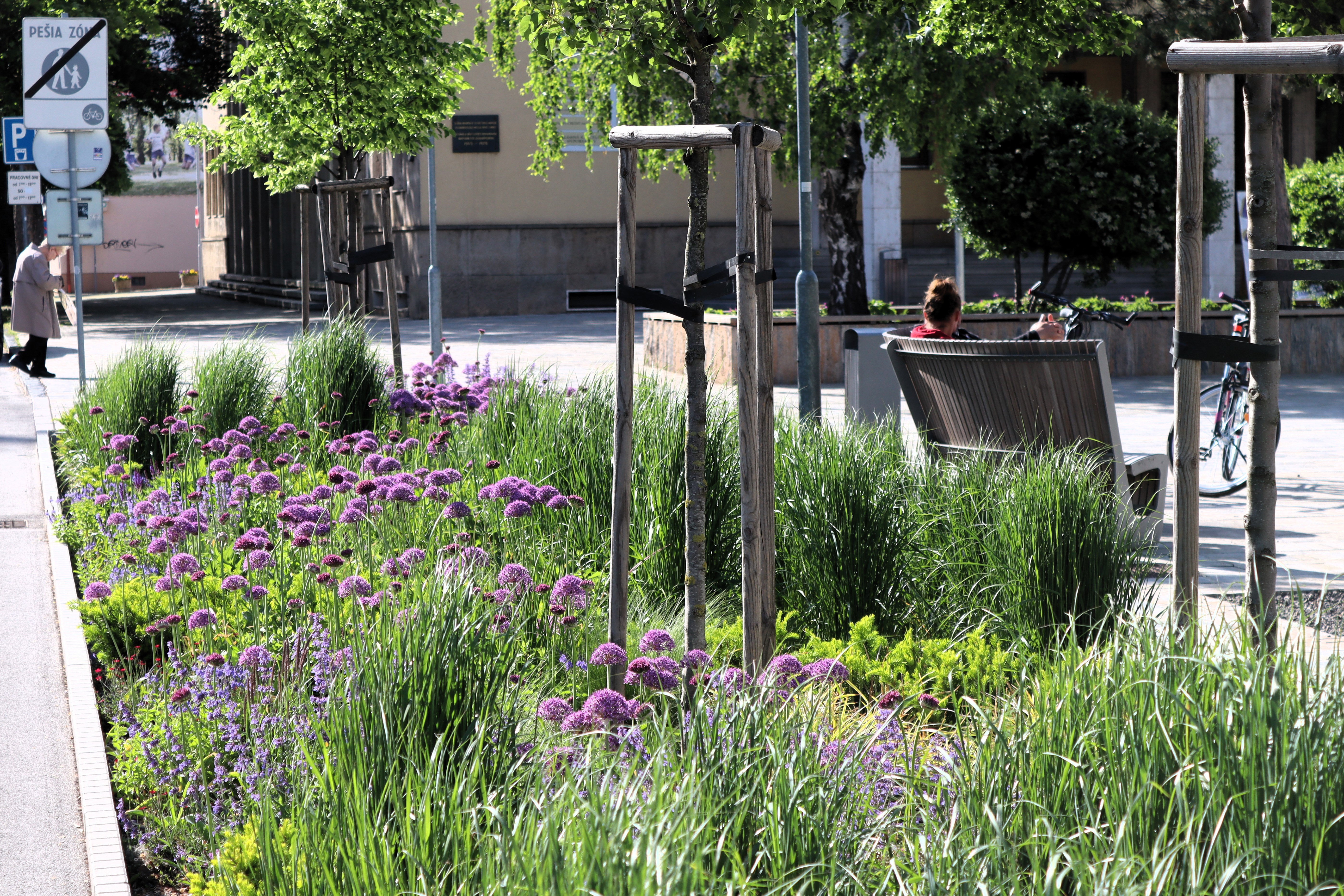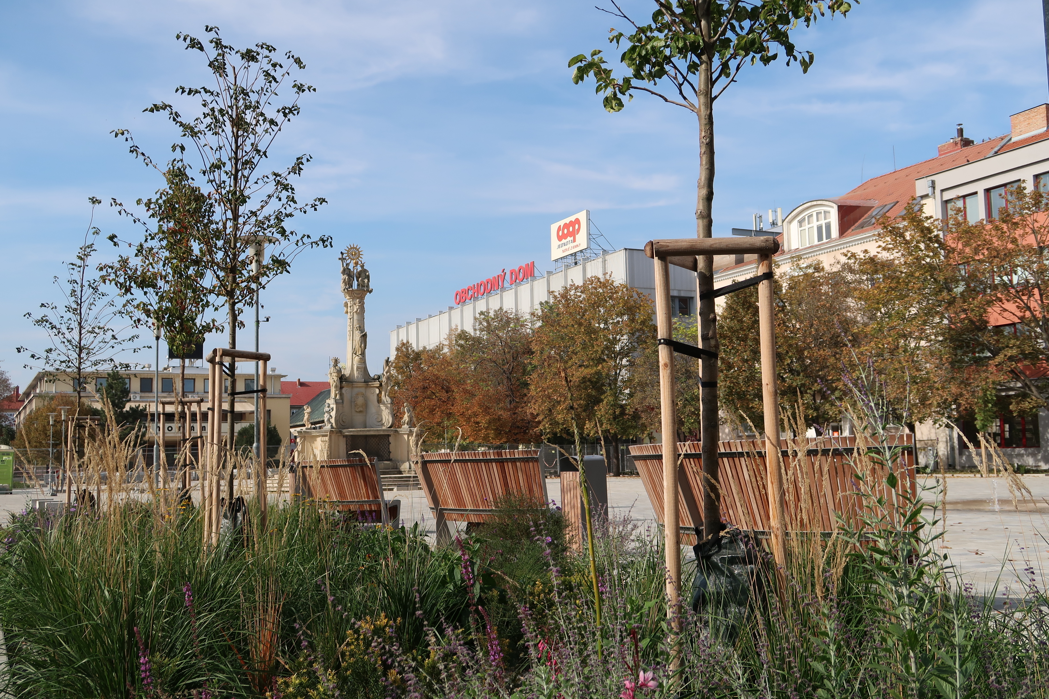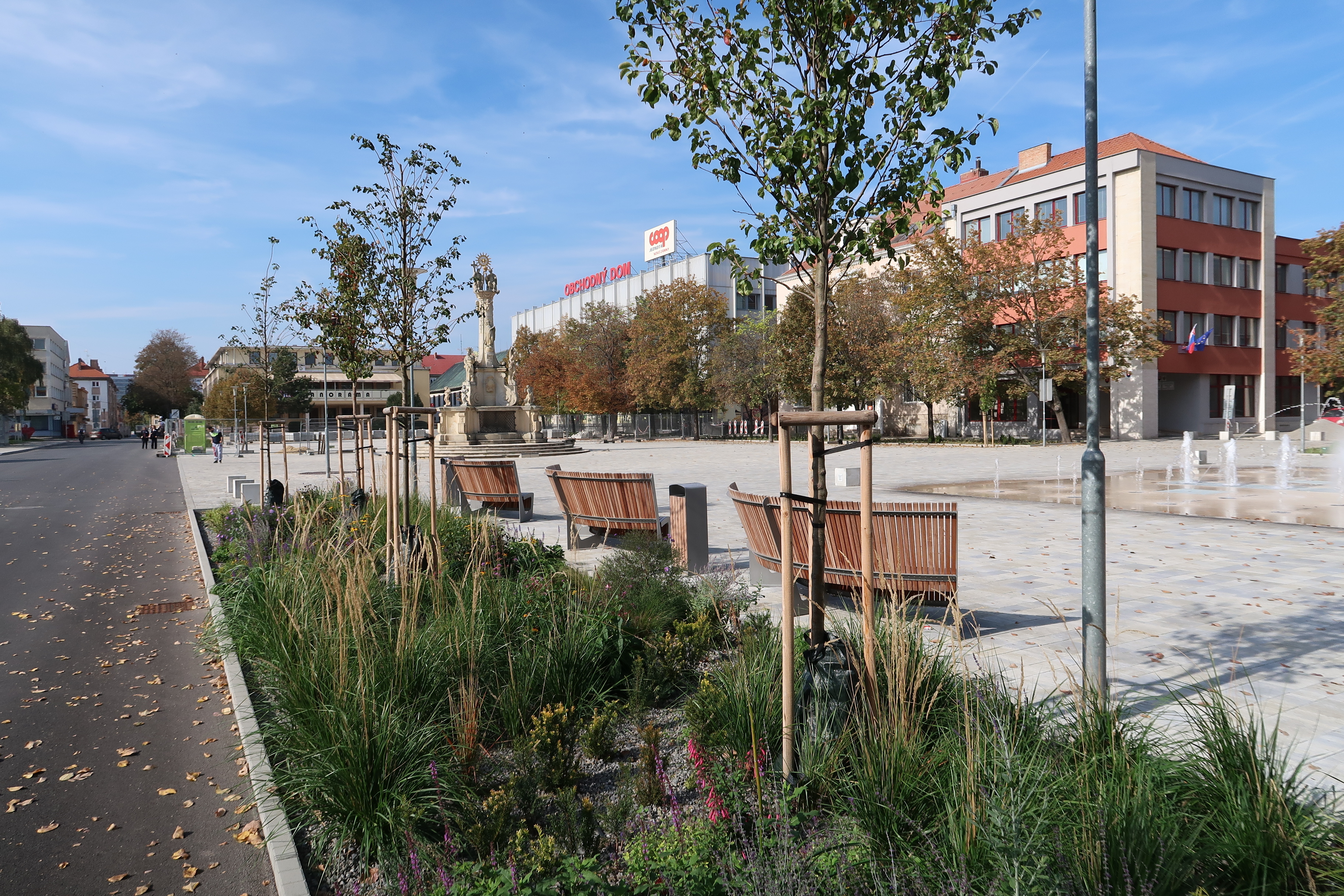 Zeleň bude na námestí pôsobiť ako adaptačné opatrenie na meniacu sa klímu. Navrhovaná zeleň nielenže v plnej miere rešpektuje historické väzby a hodnoty, ale je aj inovatívna a nadčasová. Bude zbierať zrážkovú vodu a využije ju v prospech rastlín a stromov tak, aby do kanalizácie neodtiekla žiadna, alebo len minimálna zrážková voda (Poznámka: obrubníky záhonových úprav sú prerušované, aby umožnili vtekanie zrážkovej vody). Toto riešenie zlepší celkovú lokálnu mikroklímu, kolobeh vody, ako aj estetické pôsobenie námestia ako celku. Stromy navyše vytvoria žiadúci tieň pre posedenie v letných mesiacoch a keďže sú v návrhu použité listnaté druhy stromov, tieto umožnia užiť si aj jarné slnečné lúče na námestí.