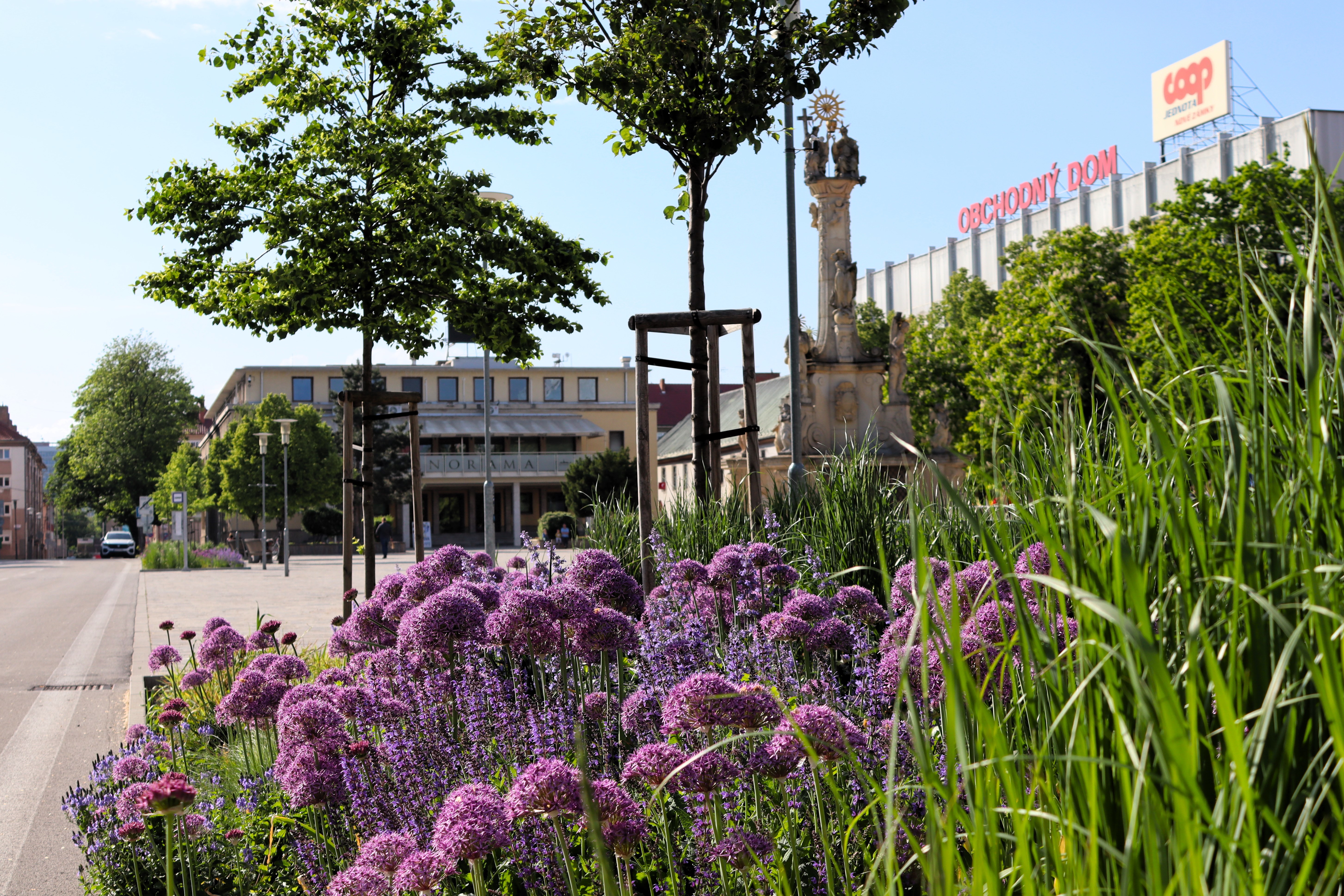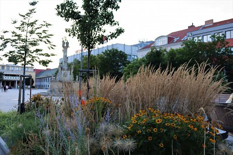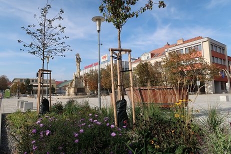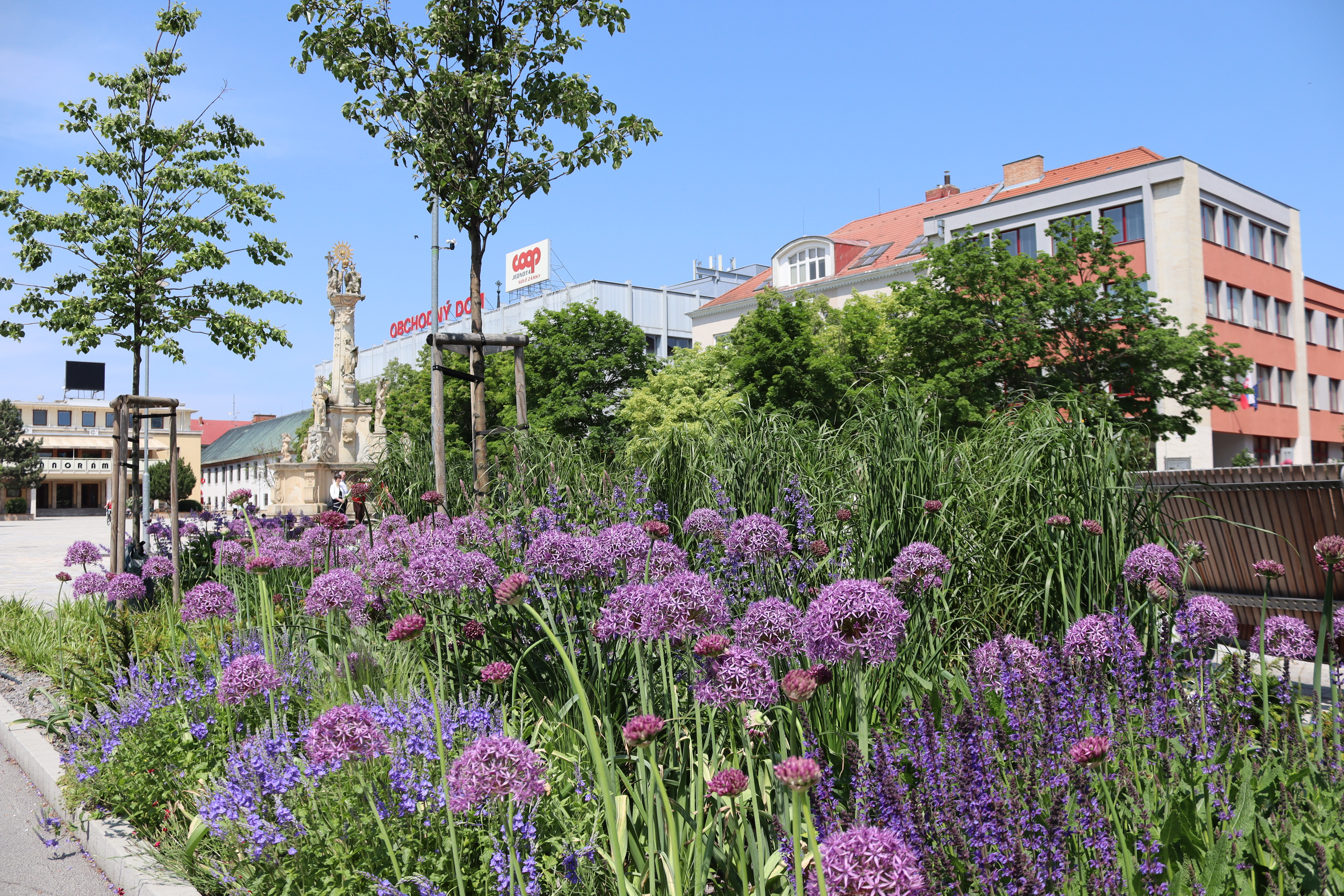 Zeleň bude na námestí pôsobiť ako adaptačné opatrenie na meniacu sa klímu. Navrhovaná zeleň nielenže v plnej miere rešpektuje historické väzby a hodnoty, ale je aj inovatívna a nadčasová. Bude zbierať zrážkovú vodu a využije ju v prospech rastlín a stromov tak, aby do kanalizácie neodtiekla žiadna, alebo len minimálna zrážková voda (Poznámka: obrubníky záhonových úprav sú prerušované, aby umožnili vtekanie zrážkovej vody). Toto riešenie zlepší celkovú lokálnu mikroklímu, kolobeh vody, ako aj estetické pôsobenie námestia ako celku. Stromy navyše vytvoria žiadúci tieň pre posedenie v letných mesiacoch a keďže sú v návrhu použité listnaté druhy stromov, tieto umožnia užiť si aj jarné slnečné lúče na námestí.
