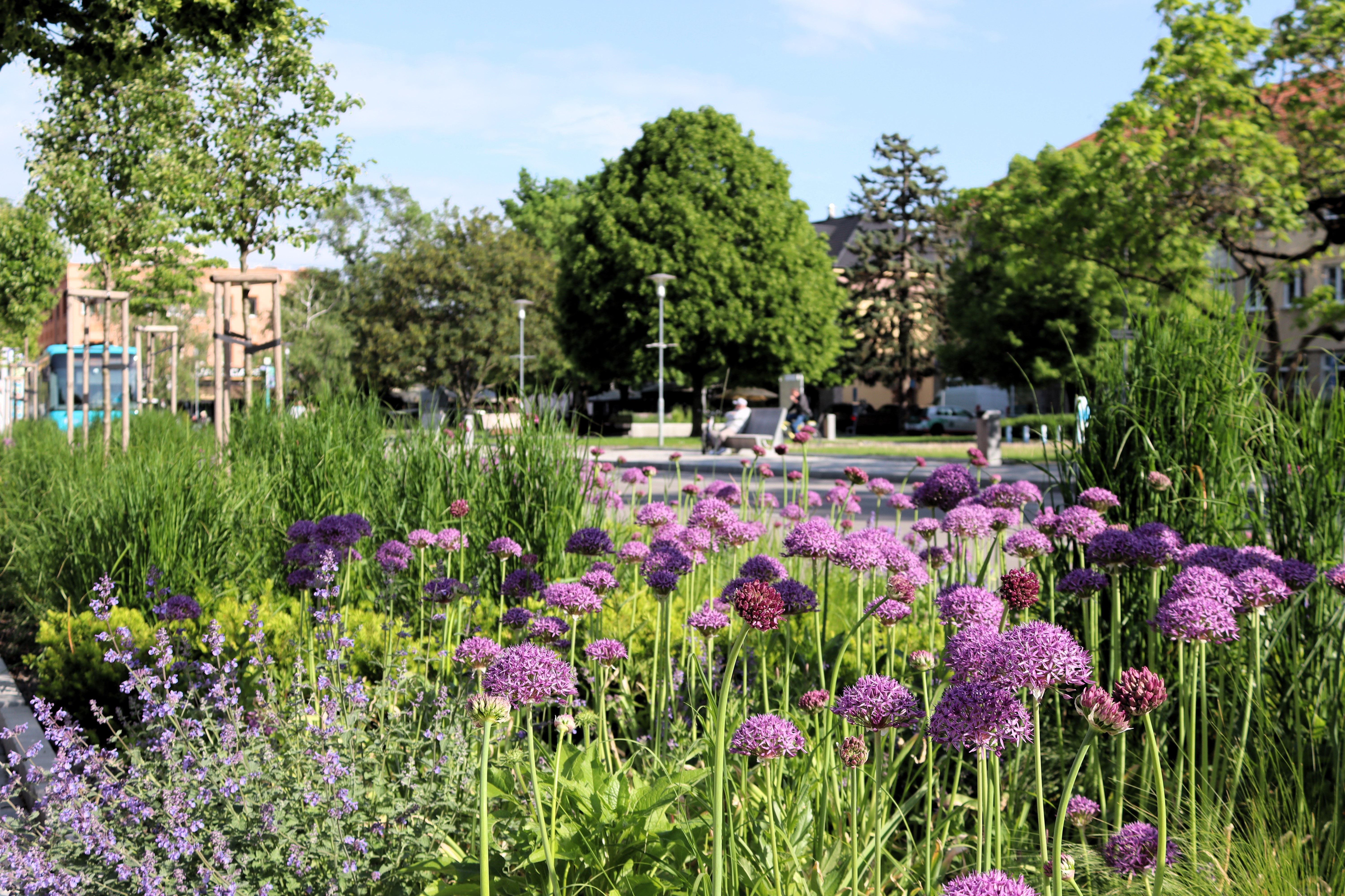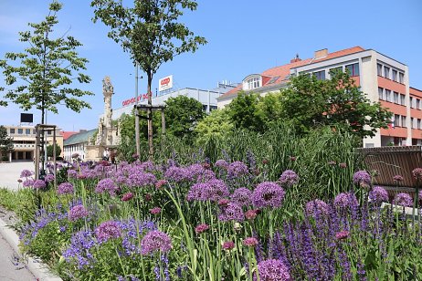 Podrast stromov bude tvoriť kompozícia z trvalkových výsadieb, ktoré budú členené nízkymi strihanými lineárnymi pásmi z tisu - v duchu renesančných záhrad, v štylizovanom poňatí. Tisové pásy budú kopírovať hlavné vizuálne a kompozičné väzby na námestí, čím návštevníkov námestia upozornia na tieto hodnoty. Súvislé bylinné pásy zase zjednotia dielčie plochy zelene do komplexne pôsobiaceho celku. Záhonové úpravy budú doplnené o jarný aspekt v podobe cibuľovín a jesenné pôsobenie podržia najmä okrasné trávy a trvalky kvitnúce na jeseň. Línie tisu zabezpečia celoročné pôsobenie vegetačnej úpravy.