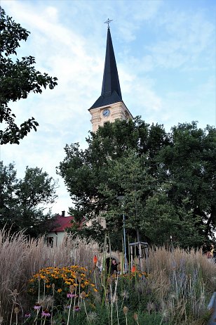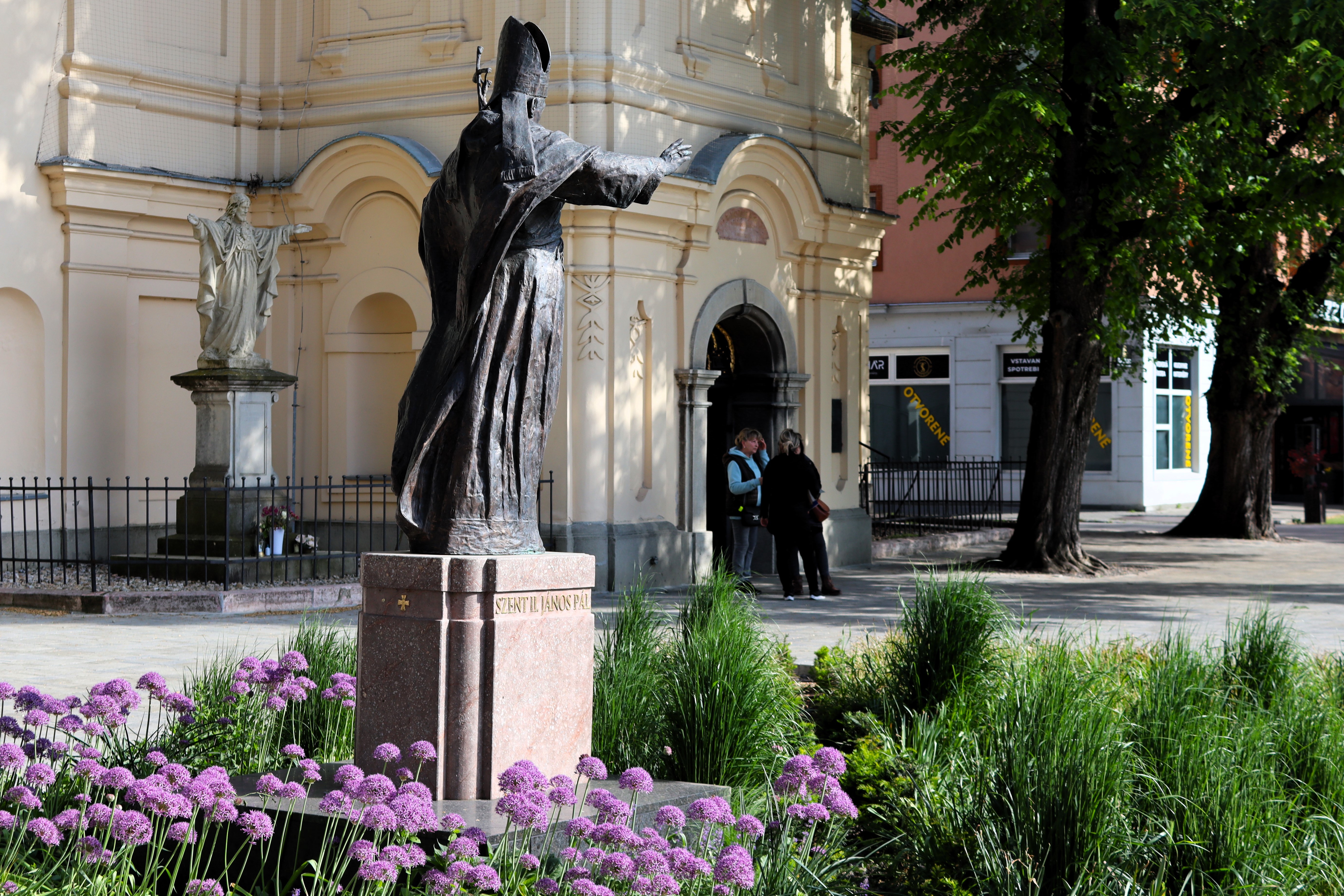 Menšie záhony v predpolí kostola majú rovnakú druhovú skladbu rastlín ako záhon po južnom obvode námestia. Tieto záhony sú rozšírené tak, aby svojimi okrajmi lícovali s priľahlými stavbami. V jednom zo záhonov je osadená socha sv. J. Pavla II, ktorý zostáva na svojom pôvodnom mieste.