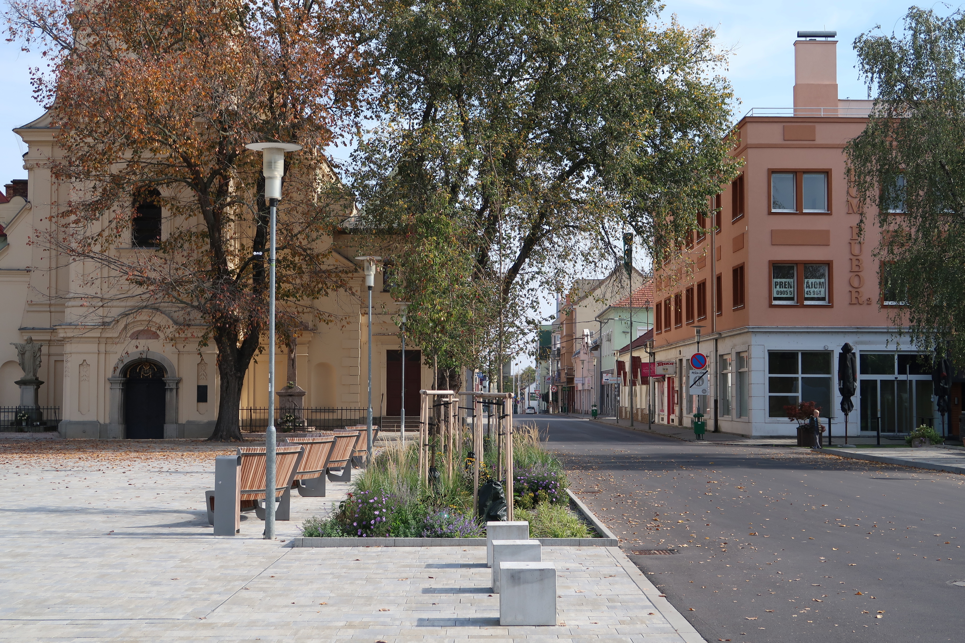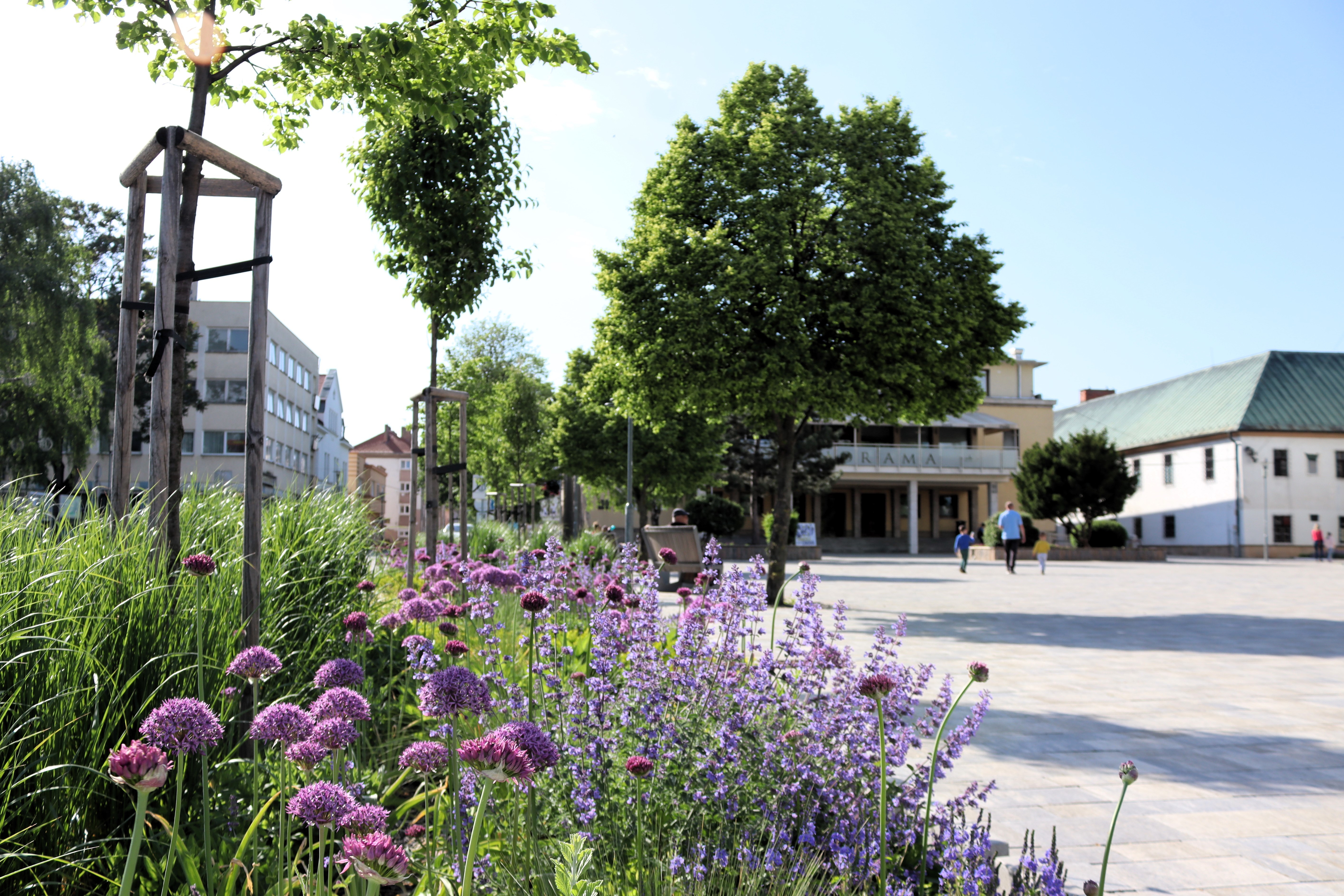 Navrhovaná druhová skladba rastlín vychádza z pôdno-ekologických nárokov v riešenom priestore. Zohľadnené boli svetelné podmienky, ktoré boli rozdielne pri oboch typoch záhonov. Záhon severný sa nachádza v miernom polotieni existujúcich košatých listnatých stromov. Tejto skutočnosti bol prispôsobený výber druhovej skladby rastlín. Do existujúceho stromoradia navrhujeme doplniť chýbajúce stromy z rovnakých druhov, ako sa nachádzajú v priľahlých plochách. Pri výbere druhovej skladby sme uprednostnili domáce autochtónne druhy drevín s prirodzenou formou koruny a farbou listov. Do existujúceho dvojradového stromoradia navrhujeme doplniť jednu lipu a dva javory. Navrhovaný podrast stromov pozostáva okrem tisu (Taxus baccata L.), z ďalších troch druhov trvaliek: Geranium macrorrhizum, Alchemilla mollis "Auslese", Carex morrowii "Ice Dance", ktoré sú mozaikovito usporiadané v jednotlivých plochách záhona vytvorených šikmými predeľovacími tisovými pásmi tak, aby do priestoru vniesli rozmanitosť, ale aj vizuálne zjednotenie medzi jednotlivými plochami záhonov. Navrhovaný podrast bude dosahovať výšku 30-50 cm. Zjednocujúcim prvkom všetkých navrhovaných záhonov v severnej časti hlavného námestia je alchemilka Alchemilla mollis "Auslese", ktorá vytvorí súvislú sviežozelenú plochu s jemným žltým kvitnutím v letnom období. Priľahlé navrhované mozaiky v záhonoch tvoria pakost podzemkatý - Geranium macrorrhizum a okrasná vždyzelená tráva so žltým lemovaním listov - Carex morrowii "Ice Dance". Do záhonov sú navrhované cibuľoviny – narcis (Narcissus) a modrica (Muscari), pre vizuálne a farebne atraktívny kvitnúci jarný efekt, v žlto-modro-bielej farebnej kombinácii. Cibuľoviny budú vytvárať zaujímavý farebný akcent a budú pôsobiť ako zjednocujúci prvok záhonov v jarnom období. Šírka záhonov v celej dĺžke je 5,1 m a jeho vonkajší okraj je vedený po spojnici medzi severným okrajom budovy Marianum vedľa farského Kostola povýšenia svätého Kríža a severným rohom budovy domu kultúry (Kovak). Súbežne s týmto záhonom je navrhnutá mlatová plocha, ktorá zjednotí druhý rad stromov do súvislého pásu spolu s vývodmi inžinierskych sietí, poklopmi, lavičkami, odpadkovými košmi a stojanmi na bicykle (Poznámka: od pôvodne navrhnovaných mlatových pásov bolo na žiadosť zadávateľa upustené a boli nahradené dlažbou). Lavičky navrhujeme umiestniť pohľadovo smerom na juh, teda na priestor námestia. Osvetlenia navrhujeme posunúť smerom k druhému radu stromov do jednej línie tak, aby bola zachovaná kolmica na okolité existujúce osvetlenia. Verejné osvetlenie na rohu obchodného domu COOP Jednota, od Tolstého ulice sa nachádza v kolíznom bode s existujúcim pagaštanom konským. Z tohto dôvodu navrhujeme presunúť verejné osvetlenie smerom do vonkajšieho pásu stromov, bližšie k budove. Kolmica na hlavnú kompozičnú os námestia, ako aj spojnica medzi jednotlivými prvkami osvetlenia sa tak zachová.