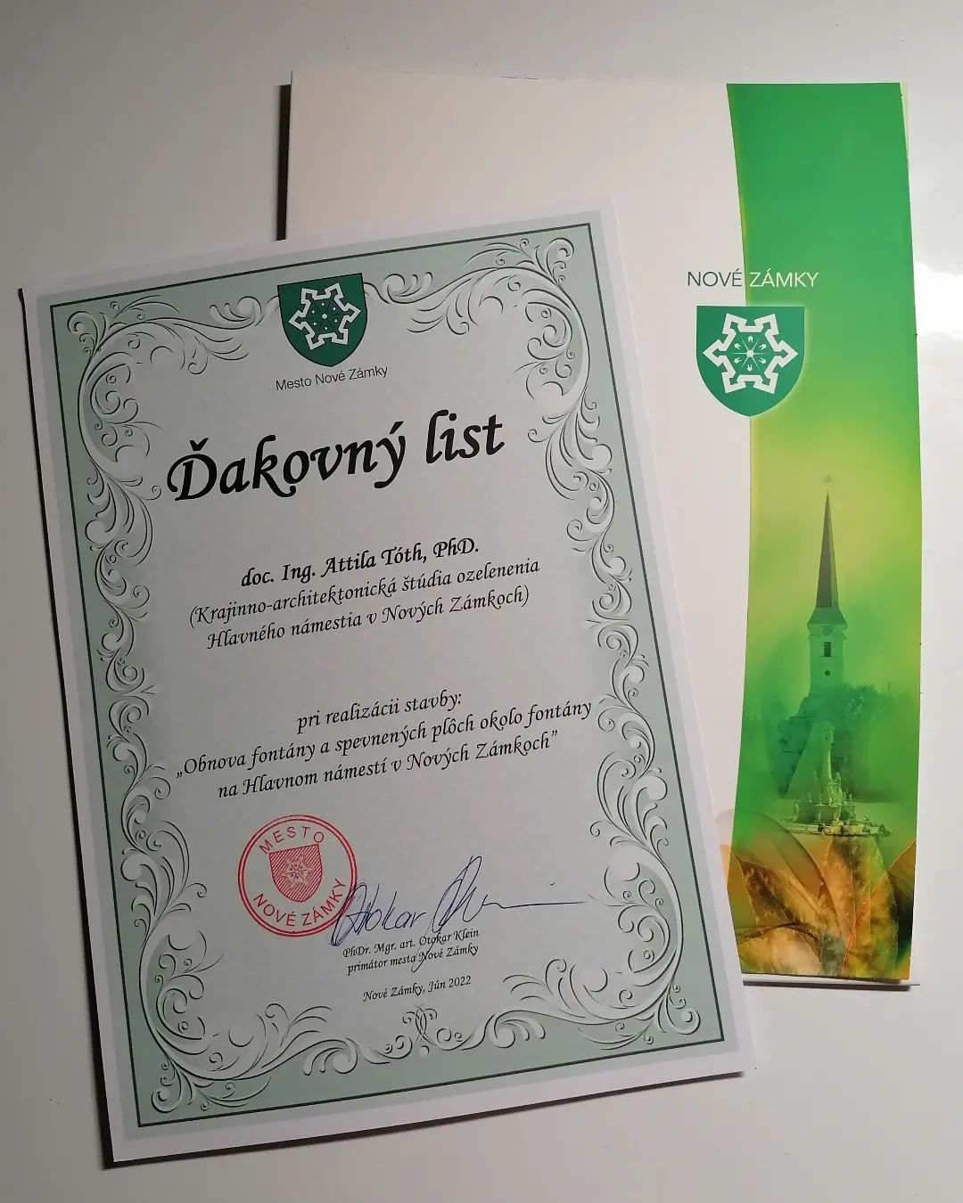Ing. Silvia Ficza (architektúra - projekčné práce); BVK-PRO, s.r.o., Ing. Csaba Baji (statika); Ing. Ladislav Fišer (zdravotechnika, dažďová kanalizácia, závlahový systém); Ing. Pavol Jakab (elektrotechnika); AQUA SLOVAKIA SK s.r.o., Ing. Ján Beseda (fontána); madplant group s.r.o. (realizácia výsadieb); ONYX, s.r.o. (realizácia obnovy fontány a spevnených plôch); PER-FEKT land services, s.r.o. (geodetické práce)