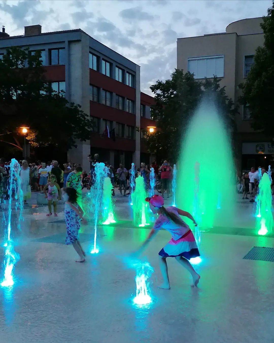 Fontána s protišmykovou gresovou dlažbou je koncipovaná ako dynamická, chodníková, štvorcového tvaru s rozmermi 13,2 m x 13,2 m. Je rozdelená na tri časti. Vonkajšia, stredová a časť vodné delá. Pod dlažbou vo vonkajšej časti budú v štyroch radoch po 6 ks umiestnené efektové trysky, ktoré budú vystrekovať vodu do výšky od 0 až 1,5m, podľa vopred nastaveného programu, spolu v štyroch radoch 24 kusov. Každý rad / 6 ks / bude ovládaný samostatne. Trysky sú uložené v nádobách, ktoré taktiež slúžia ako prepad na odvod spätnej vody do vyrovnávacej nádrže k ošetreniu a odstráneniu nečistôt. Po ošetrení bude voda znovu vytláčaná späť do trysiek a bude tu vytvárať dynamický efekt. V stredovej časti bude realizovaná jedna šachta, kde budú umiestnené na okrajoch po 3 ks efektové trysky s kolmým výstrekom do výšky ca. 2,5m, v dynamickom prevedení. Uprostred budú 2 efektové trysky a 1 stredová s výstrekom 3 m v dynamickom prevedení. V štyroch krajných šachtách tejto chodníkovej fontány budú umiestnené 4 ks vodných diel, ktoré budú vystrekovať prerušované vodné lúče smerom k strednej šachte. Všetky tieto šachty budú prekryté kovovými mrežami.
