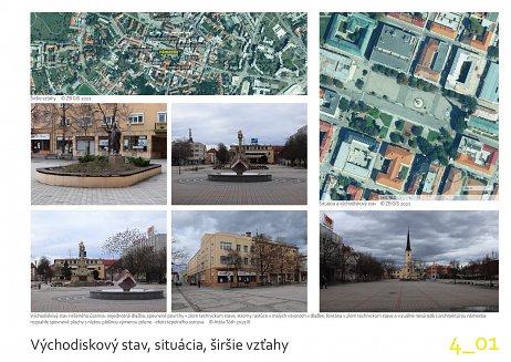 Návrh v plnej miere rešpektuje historické a súčasné hodnoty námestia a snaží sa ich umocniť a podčiarknuť. Z tohto dôvodu sú hlavné a vedľajšie kompozičné osi - medzi kostolom a súsoším, medzi súsoším a mestským úradom, medzi sochami historických dejateľov a súsoším Najsvätejšej Trojice - vyzdvihnuté a rešpektované. Kompozičná väzba medzi súsoším a kostolom je ťažisková. Najsvätejšia Trojica hľadí na kostol. V súsoší sa hlavná kompozičná os križuje s najvýznamnejšou sekundárnou kompozičnou osou, ktorá vychádza z budovy mestského úradu. Je to významné vizuálne prepojenie, preto väzbu medzi mestským úradom a súsoším je potrebné zachovať otvorenú a priehľadnú - nevnášať do nej žiadne vyššie prvky (vrátane drevín) a podľa možnosti počítať v budúcnosti s úplným otvorením tohto priehľadu. Na túto os navrhujeme presunúť aj studňu, ktorá sa nachádza pred budovou daňového úradu, a to do mlatového povrchu.