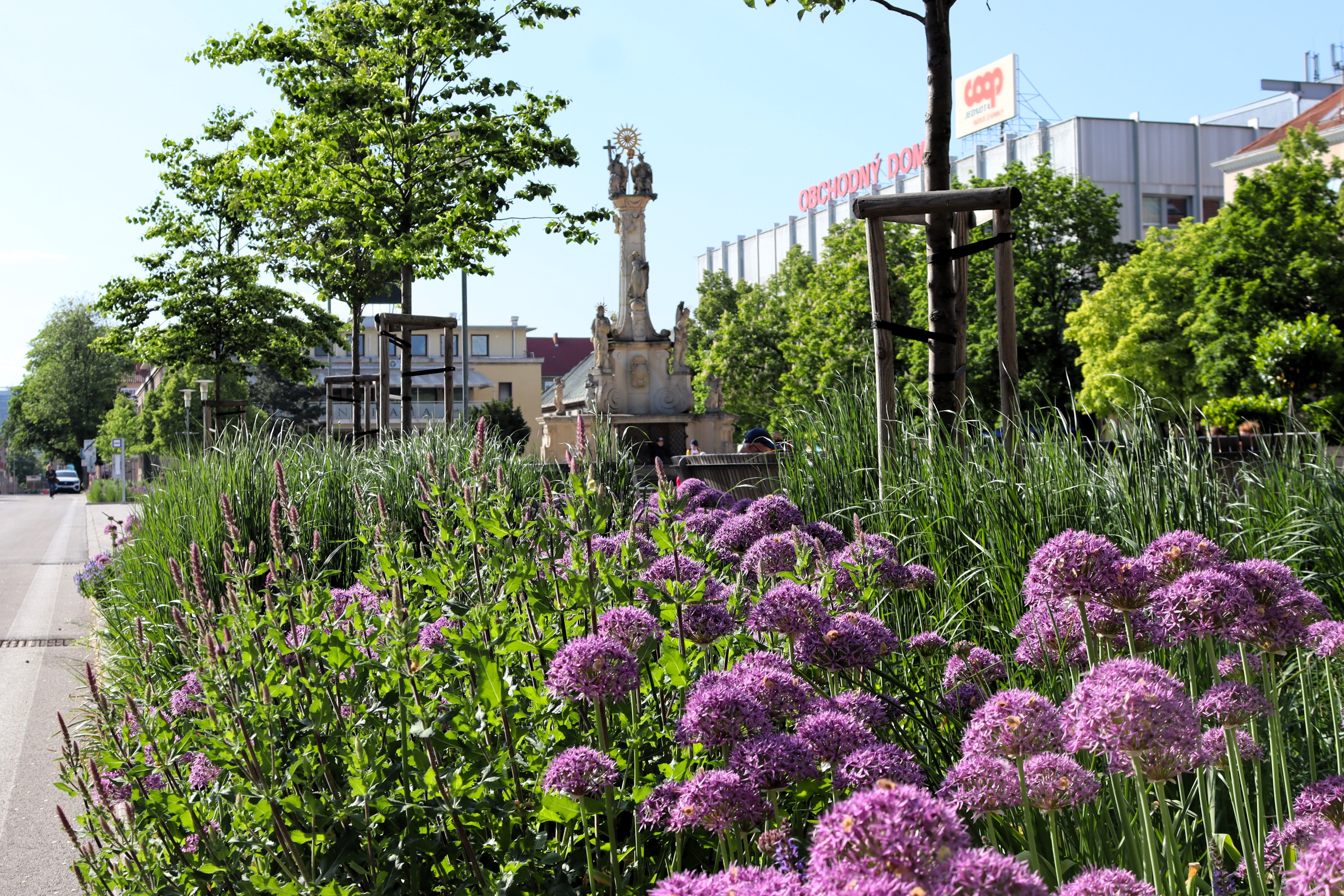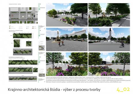 Návrh v plnej miere rešpektuje historické a súčasné hodnoty námestia a snaží sa ich umocniť a podčiarknuť. Z tohto dôvodu sú hlavné a vedľajšie kompozičné osi - medzi kostolom a súsoším, medzi súsoším a mestským úradom, medzi sochami historických dejateľov a súsoším Najsvätejšej Trojice - vyzdvihnuté a rešpektované. Zeleň na námestí vychádza z renesančného odkazu a tvaroslovia námestia. Súvislé plochy zelene zjednotia existujúcu výsadbu stromov a doplnia ju o novú. Náhrada betónu v okolí stromov novou výsadbou vo významnej miere prispeje k vytvoreniu vhodnejších podmienok pre dlhodobé udržanie drevín v priestore. Zeleň bude mať vymedzujúci, vyvažujúci a harmonizujúci efekt na námestí. Podrast stromov bude tvoriť kompozícia z trvalkových výsadieb, ktoré budú členené nízkymi strihanými lineárnymi pásmi z tisu. Tisové pásy budú kopírovať hlavné vizuálne a kompozičné väzby na námestí, čím návštevníkov námestia upozornia na tieto hodnoty. Navrhovaná zeleň nielenže v plnej miere rešpektuje historické väzby a hodnoty, ale je aj inovatívna a nadčasová. Bude zbierať zrážkovú vodu a využije ju v prospech rastlín a stromov tak, aby do kanalizácie neodtiekla žiadna, alebo len minimálna zrážková voda. Navrhovaná fontána je osadená tak, aby dopĺňala predpolie kostola a zároveň aby nenarúšala hlavnú kompozičnú os medzi kostolom a súsoším. Osadenie fontány v priestore predpolia kostola priestorovo a kompozične vyvážené pásmi zelene z oboch strán, ktoré sú od okrajov fontány rovnako vzdialené, čím vnášajú do priestoru symetriu a vyváženosť.