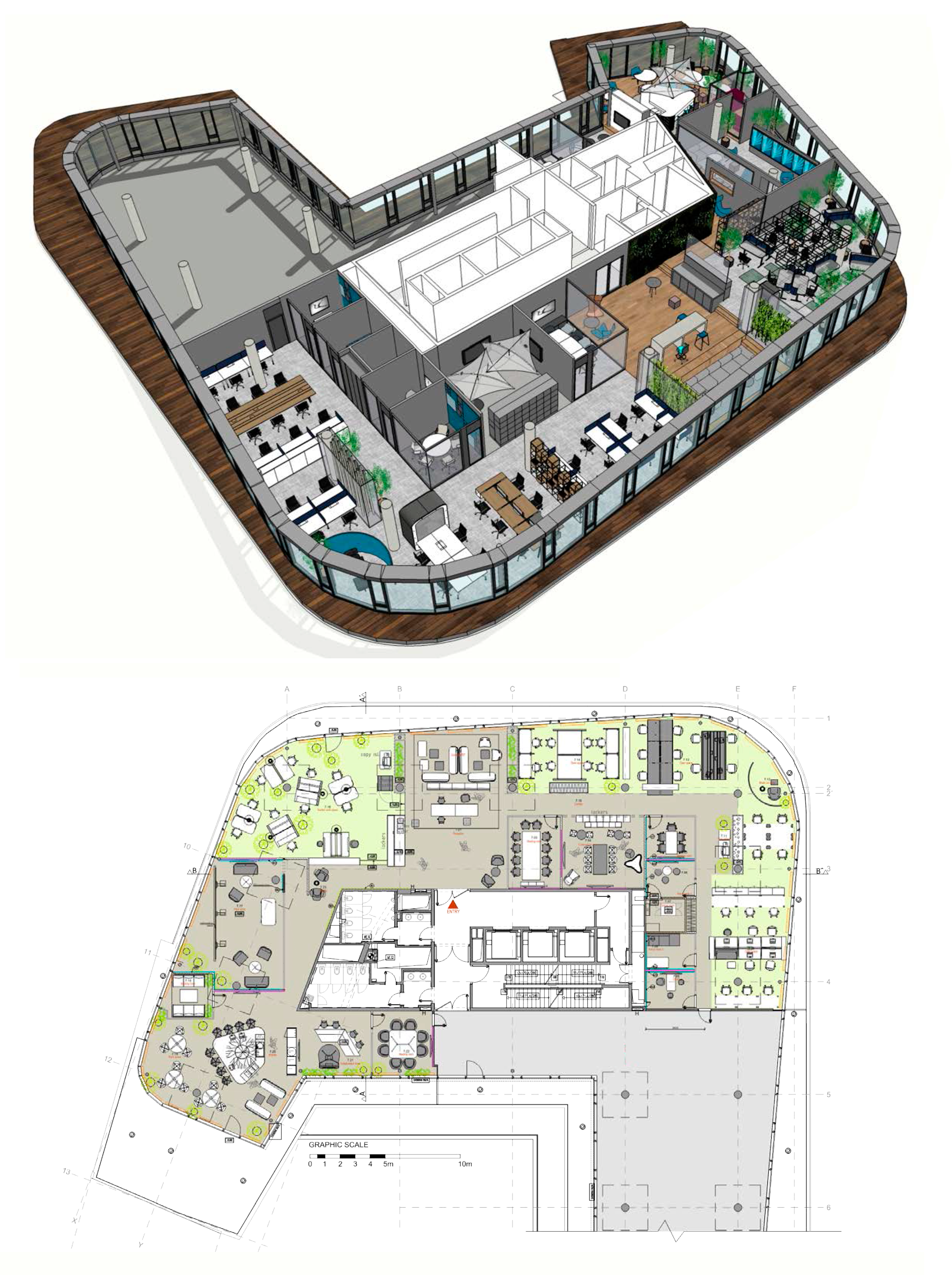 Zamestnanec si určí ich polohu podľa vlastných preferencií. Každé miesto má pripojenie na elektrinu a internet. Jednotlivé zóny sú oddelené väčšinou iba opticky alebo zvukovou bariérou. Kancelárie disponujú technológiou, ktorá kontroluje množstvo CO2 vo vzduchu, jeho vlhkosť aj teplotu.