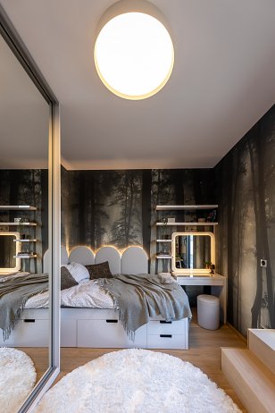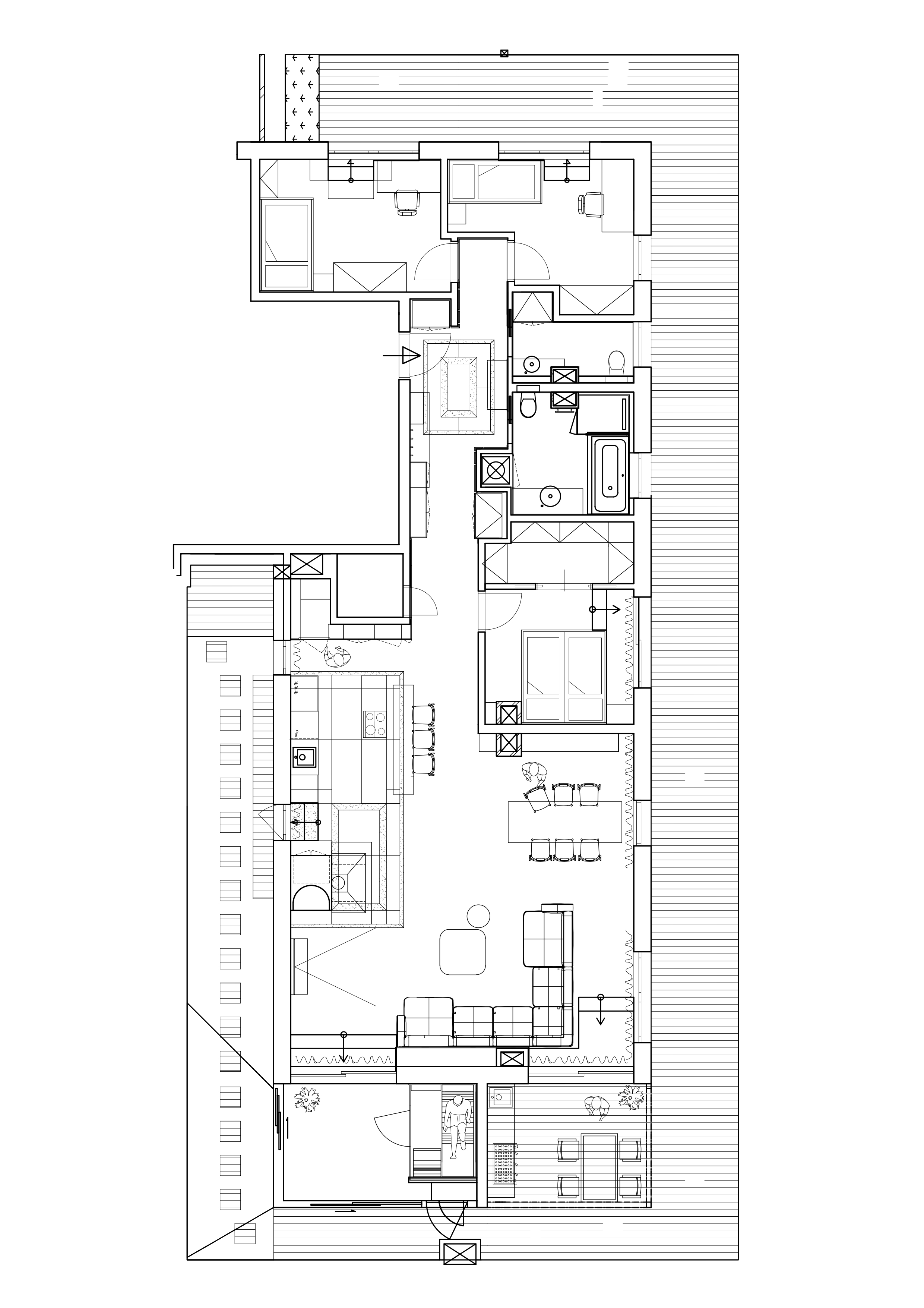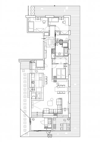 Do interiéru tohto strešného bytu ústilo hneď niekoľko stúpačiek v podobe murovaných alebo sadrokartónových kastlíkov. Tieto kastlíky bolo potrebné zakomponovať do dispozície bytu tak, aby to hralo v prospech dizajnu.