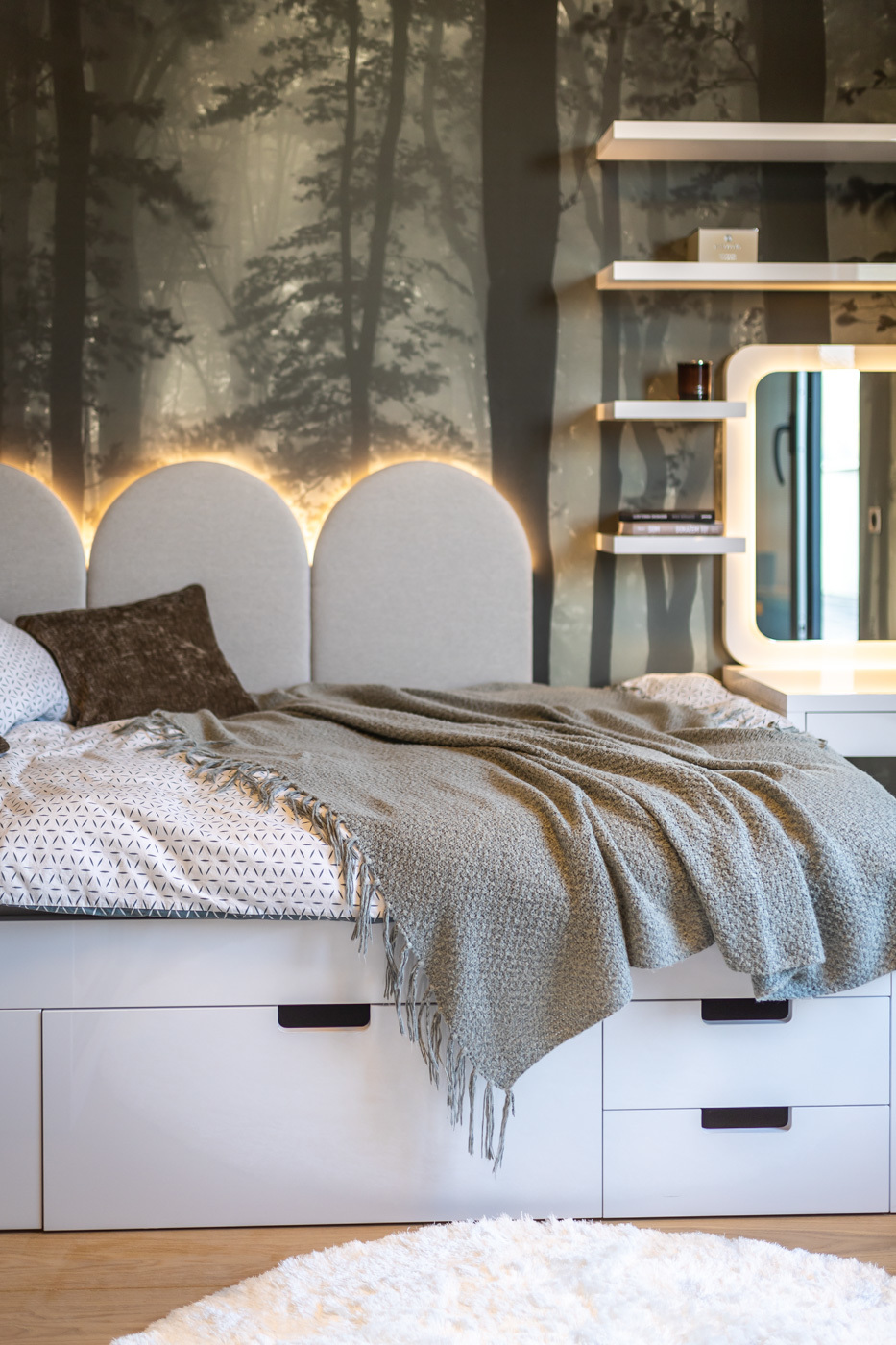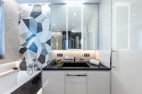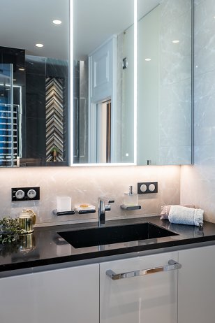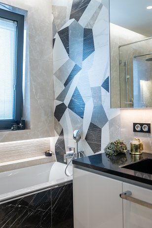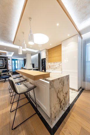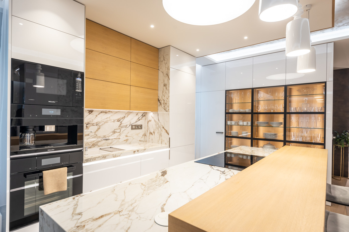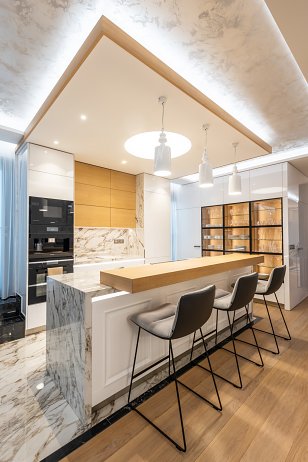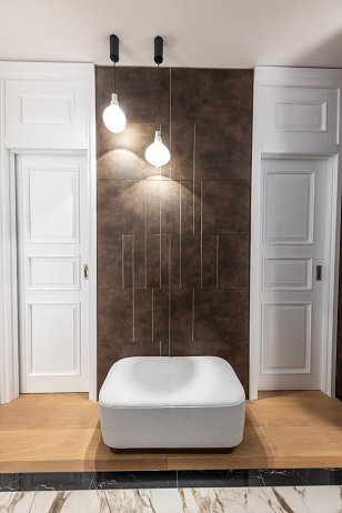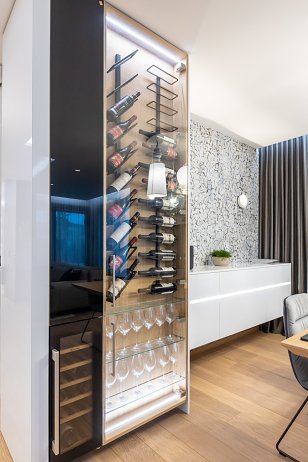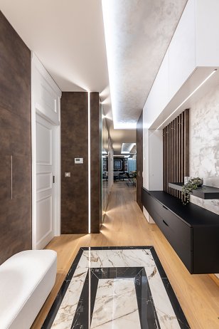 V byte tak na výsledný dizajn mali vplyv práve stúpačkové kastlíky a ich pozícia v priestore. V miestnostiach vytvárali niky. Niekedy to nejde navrhnúť tak minimalisticky ako sa s tým stretávame často u lukratívnych nehnuteľností. To ani nebola požiadavka majiteľa bytu. Očakával práve zaujímavé riešenia ako využiť potenciál priestoru na 100%. Nebránil sa ani otvoreným knižniciam a ani vitrínam v kuchyni. V každej miestnosti bol kladený dôraz na detail a remeselnú kvalitu.