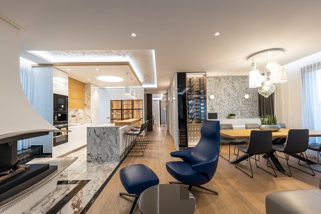 Interiéru s plochou 130m2 dominuje kombinácia dreva a mramoru. Vo vstupnej hale je zaujímavosťou mramorová intarzia v dubovej podlahe. Jedná sa o 9 mm hrubú veľkoformátovú gresovú dlažbu v dekore mramoru, ktorú šikovní majstri narezali do navrhnutého tvaru. Podlaha pod dlažbou sa musela upraviť do určitej výšky nivelizačnou hmotou aby sme dosiahli želaného výsledku tak, aby dlažba bola v rovine s dubovou podlahou. Podobným spôsobom s použitím mramorovej dlažby sme opticky oddelili kuchyňu a krb od obývacieho priestoru.
