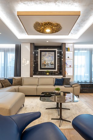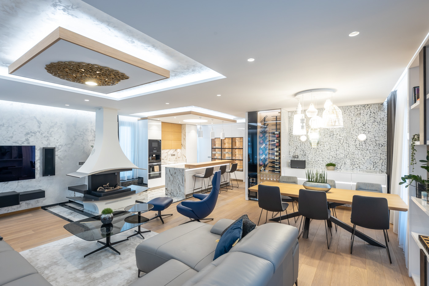 Ústredným bodom celého interiéru je krb s otvoreným ohniskom. Bol to práve krb, ktorý sme s majiteľom bytu riešili už na prvom stretnutí. Tento krb je skutočným dizajnovým skvostom celého interiéru. Keď je oheň otvorený a počujete to praskanie dreva, cítite vôňu a teplo, ktoré vychádza z neho, je to skutočná romantika.