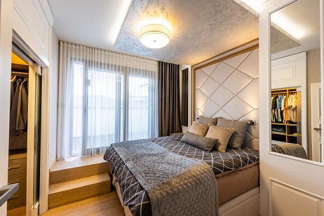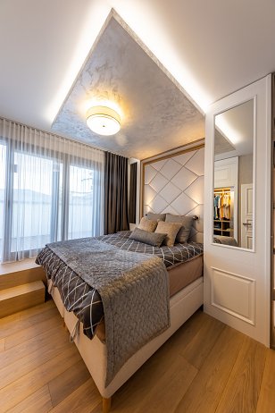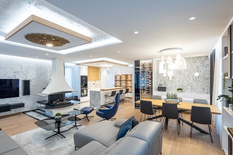 Veľkometrážny penthouse má 230m2 vrátane terás a ponúka panoramatický výhľad na okolité mesto. Terasy majú vyše 100m2 a sú situované po obvode bytu. Dispozíciu priestoru si majiteľ želal rozdeliť na dve samostatné detské izby, spálňu so šatníkom a obývaciu miestnosť spojenú s kuchyňou a jedálňou. Samostatná toaleta, kúpeľňa a komora sú tiež súčasťou bytu.