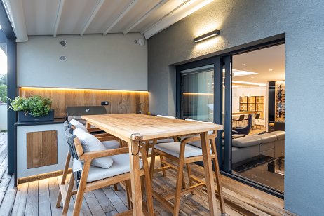 Z opačnej strany tepidária si majiteľ želal mať letnú kuchynku s grilom. Plynový gril je v tomto prípade vložený do výklenku v pracovnej doske z prírodného kameňa. Gril sa takto dá kedykoľvek mimo grilovacej sezóny odložiť preč z tejto kuchynky.
