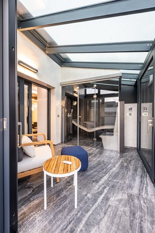 Akoby predĺžením bytu, zväčšením obytnej časti sa stala zimná záhrada s tepidáriom s parnou saunou a sprchou. Na stenách a lehátkach tepidária je špeciálna glazovaná keramika. Podlaha a strop je z gresovej dlažby. Sálavé suché teplo je v miestnosti produkované vyhrievaním stien, podlahy a lavíc, na ktorých sa sedí alebo leží. Paru do priestoru vháňa parný generátor. Vnútorný priestor sauny sa pri tomto spôsobe saunovania vyhrieva na teplotu 40 – 45 °C, pričom relatívna vlhkosť vzduchu môže dosiahnuť až 100%. Saunovanie si môže majiteľ obohatiť aj o pridanie rôznych aromatických prísad.