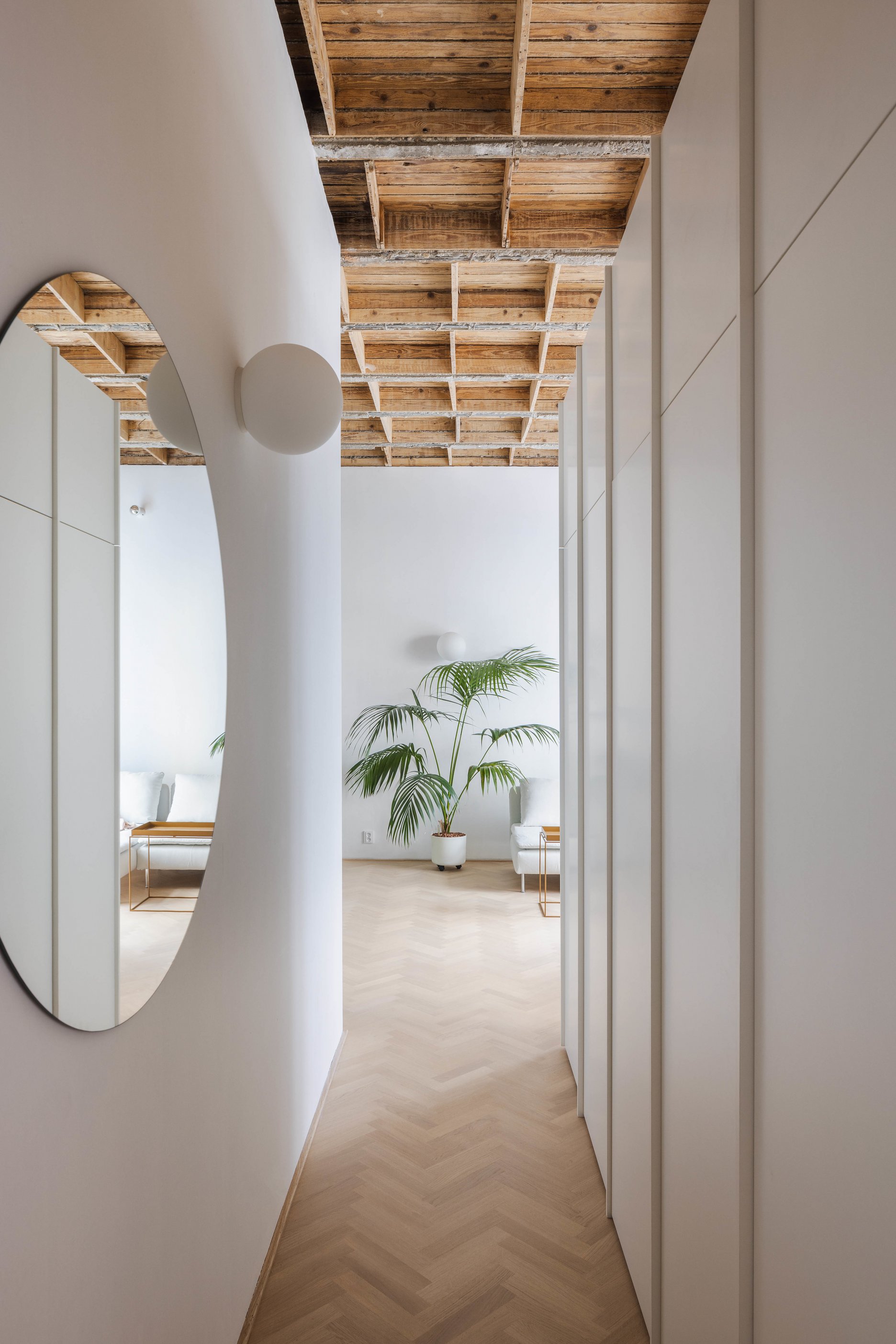 Pôvodná dispozícia malého bytu s výmerou 38 m2 a priechodnými izbami prešla radikálnou zmenou. Priečky nahradili nábytkové steny, odsadené od odhaleného stropu, ktoré prispievajú k optickému prepojeniu a presvetleniu interiéru. Jednoduchá farebná a materiálová schéma necháva vyniknúť dominantný vizuál dobového rebierkového stropu.
