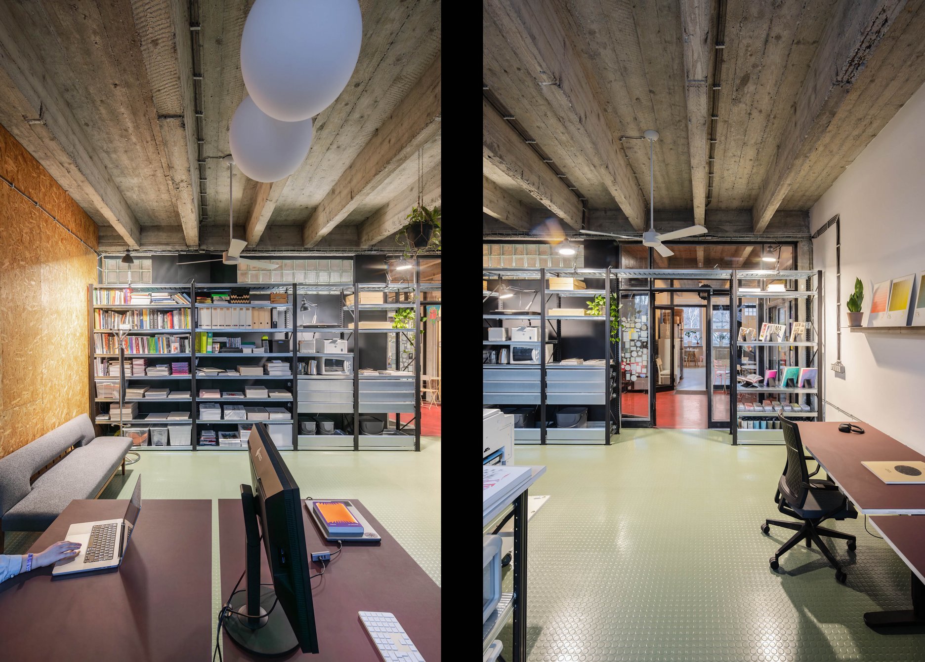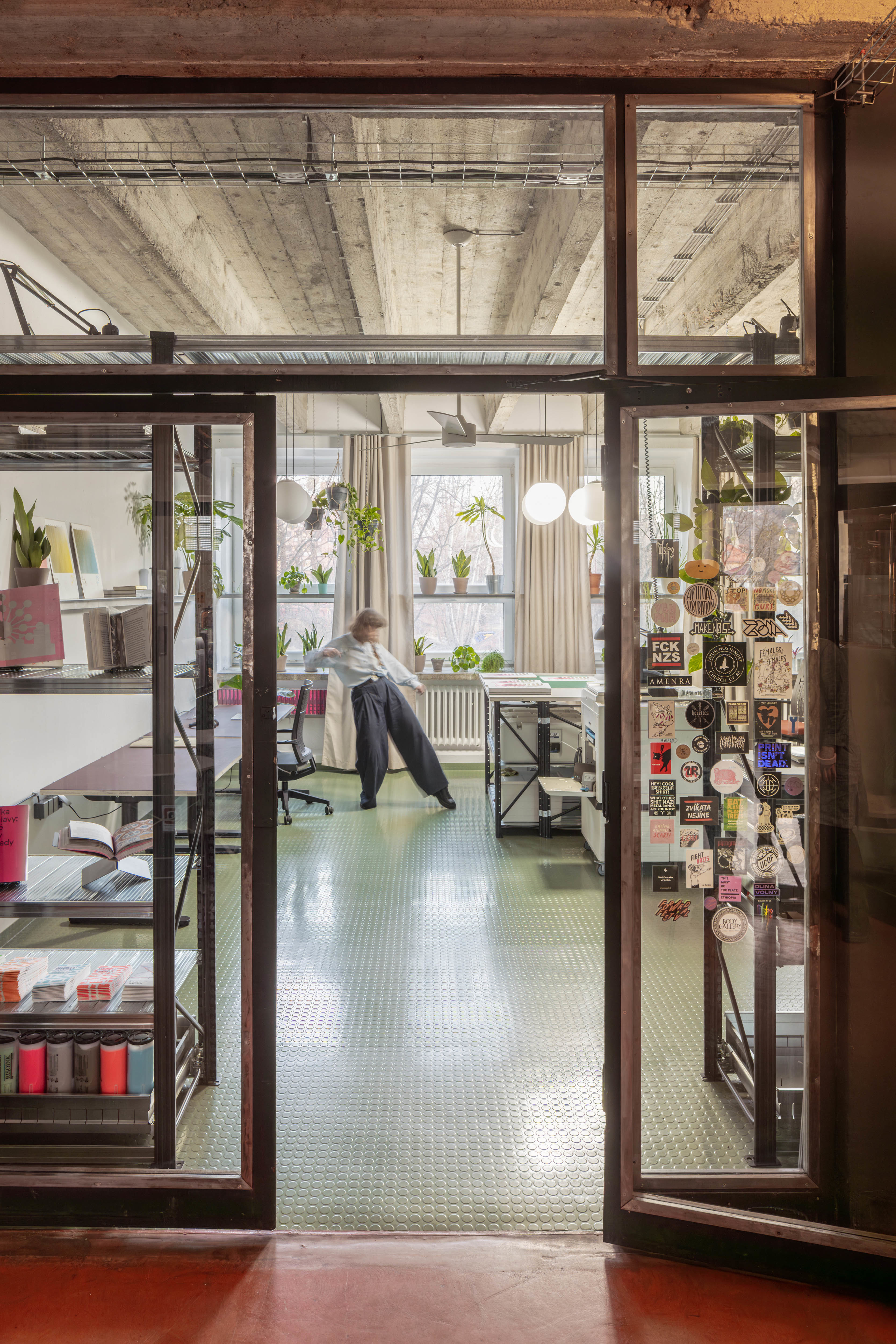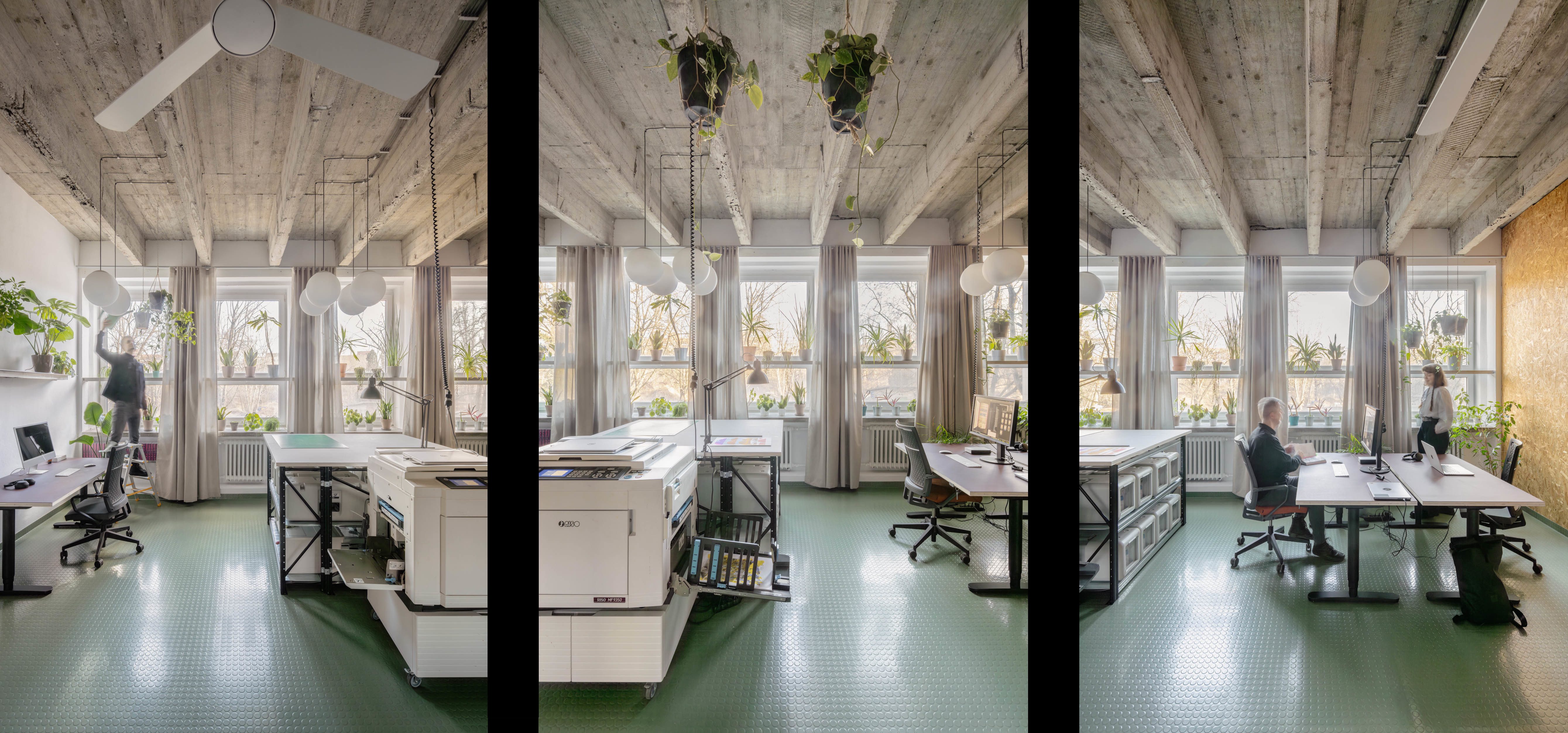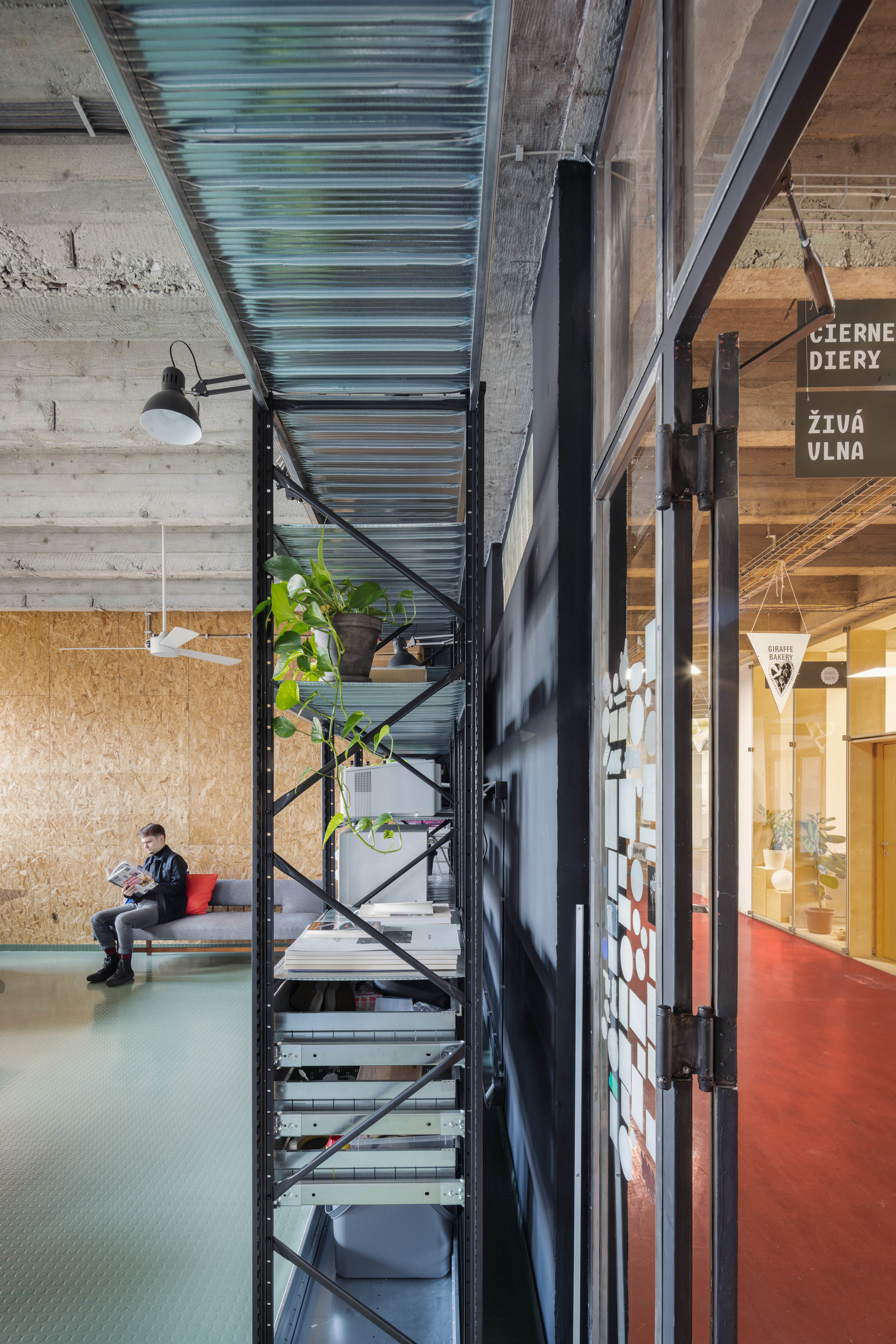 Funkčné úpravy a riešenia, bez očividnej snahy o "architektonizáciu" priestoru. Architekti vytvorili prehľadný rámec, schopný reagovať na živelné fungovanie kolektívu a budúce zmeny. Zachovaná surovosť interiéru, industriálne detaily a repasované kusy zariadenia reflektujú oduševnenie klienta...