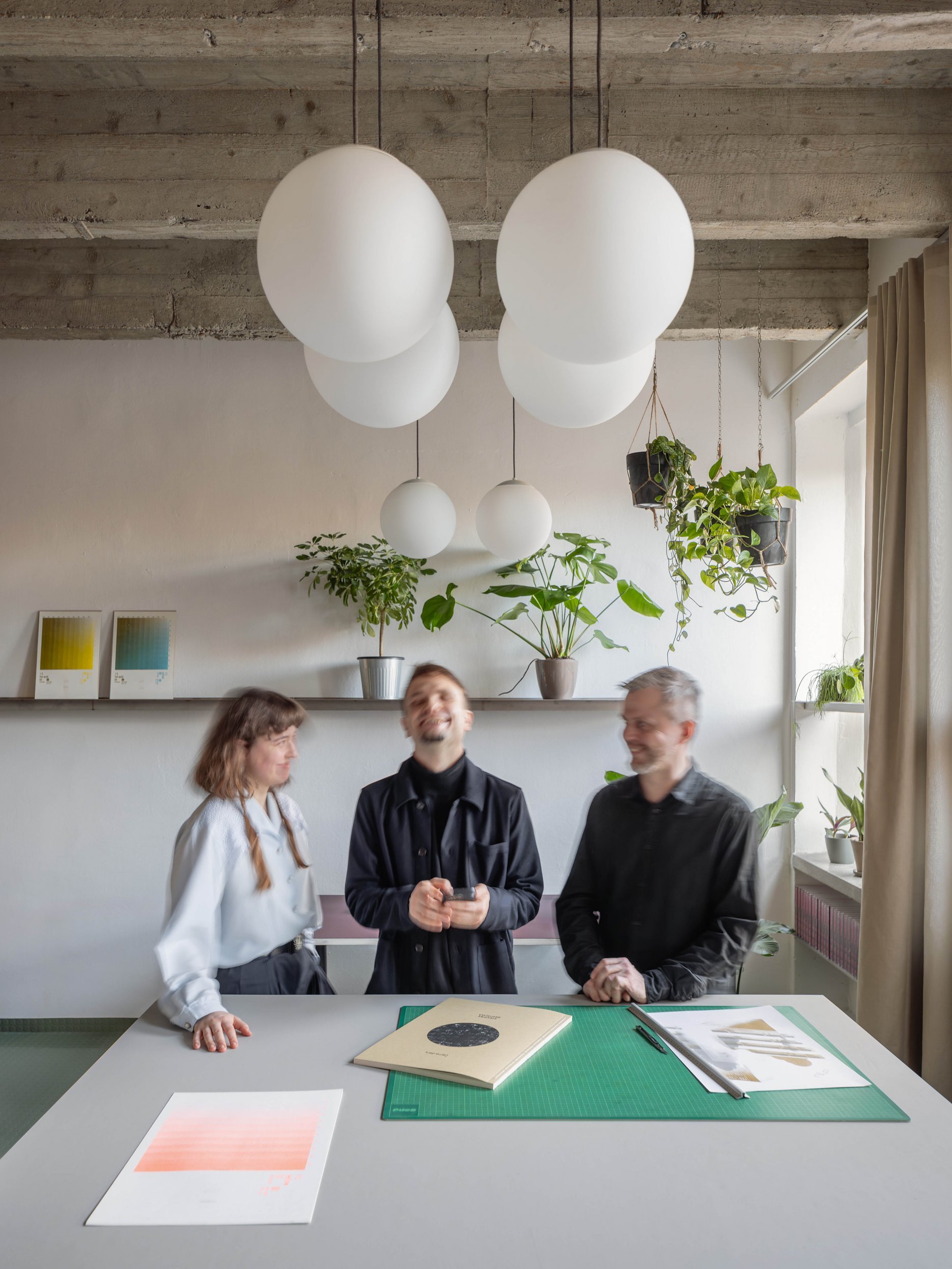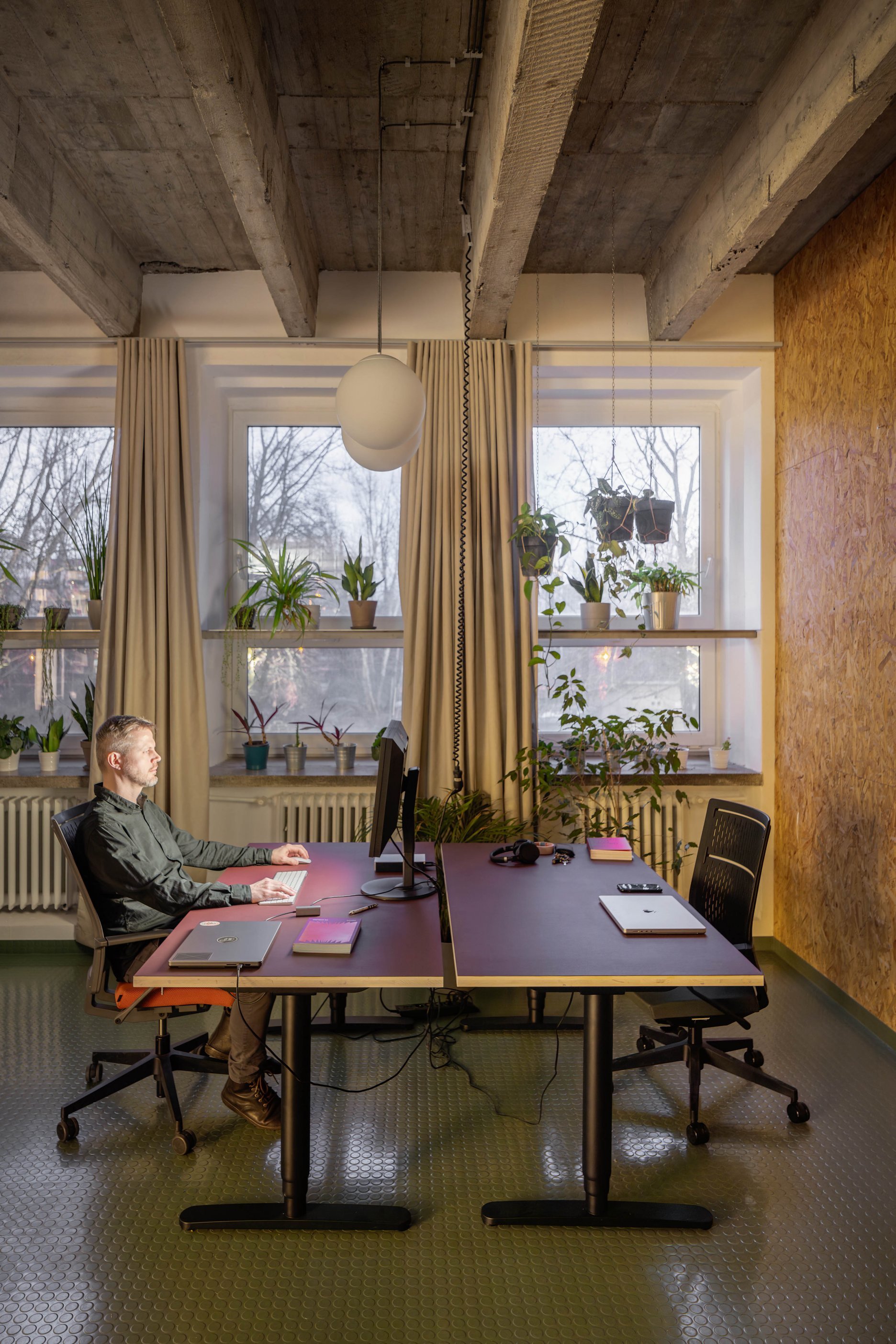 Pracovné stoly majú biodosky potiahnuté linom v dvoch odtieňoch - burgundy a sivá. Tieto farby sme zvolili ako doplnkové k jemne zelenej podlahe značky Nora. Peniažteková podlaha bola vyrobená z kaučukovej gumy v hrúbke 3 milimetre. Jej peniažteky sú skosené pod uhlom, ktorý zjednodušuje umývanie a dlhodobú údržbu. Pôvodne sme uvažovali nad modrou alebo dokonca ružovou farbou podlahy. Priveľmi výrazné farby v priestore by však mohli skresľovať farbu papiera pri tlači grafík Čiernych dier.