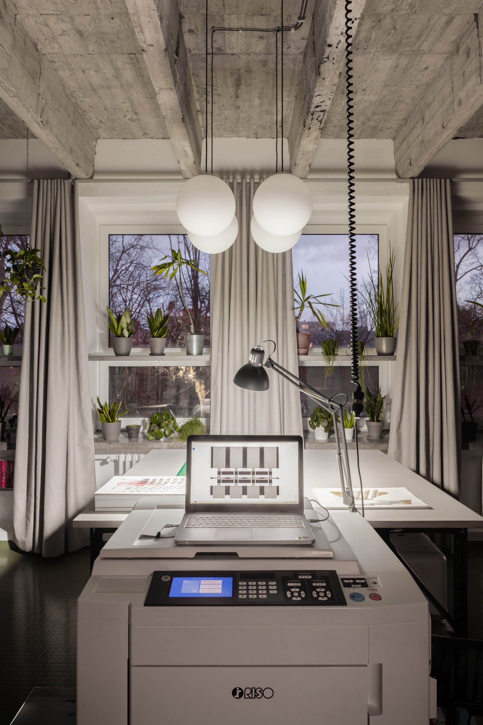Stredobodom miestnosti je RISO, japonská risografická tlačiareň, na ktorej vznikajú všetky grafické listy Čiernych dier. Tlačiareň potrebuje dostatok priestoru na každodennú operáciu a vymieňanie farebných valcov. Nevyhnutný je tiež samostatný pracovný stôl na kontrolu a triedenie výtlačkov. Priestor pod stolom sme sa rozhodli využiť na odkladanie farebných valcov, ktoré boli dovtedy len voľne uložené na podlahe. Na konštrukciu sme využili typový regálový systém.