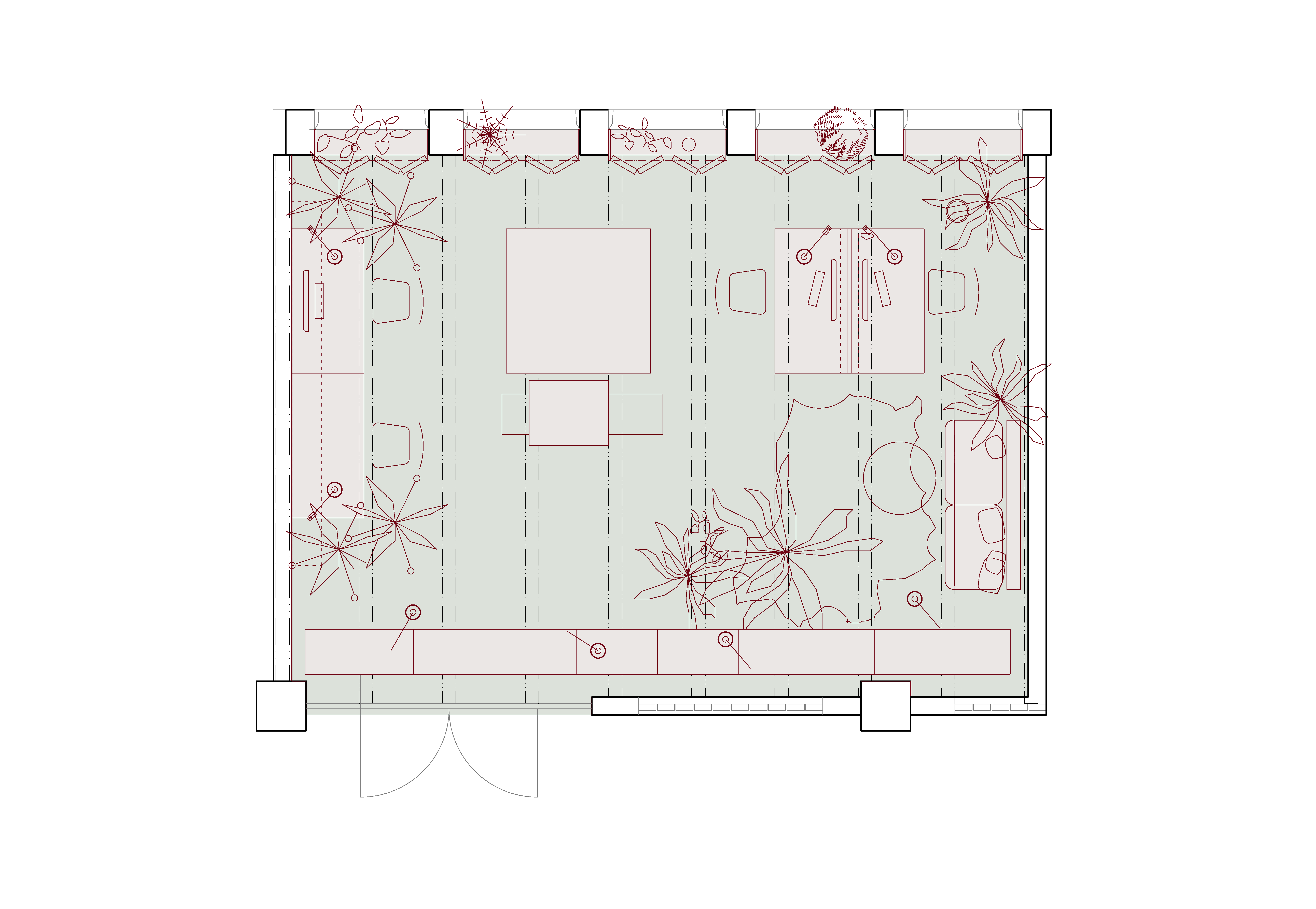 Na mieru boli zhotovené nerezové police medzi okennými otvormi a na stene. Čím viac rastlín nesú, tým lepšie. Rozkladacia "švédska lavica" na poobedné vylihovanie bola navrhnutá Miroslavom Navrátilom v 60. rokoch 20. storočia a zreštaurovaná značkou Renové. Podobný príbeh má aj chrómový vešiak, zachránený zo zbúranej stavby neskorej moderny.