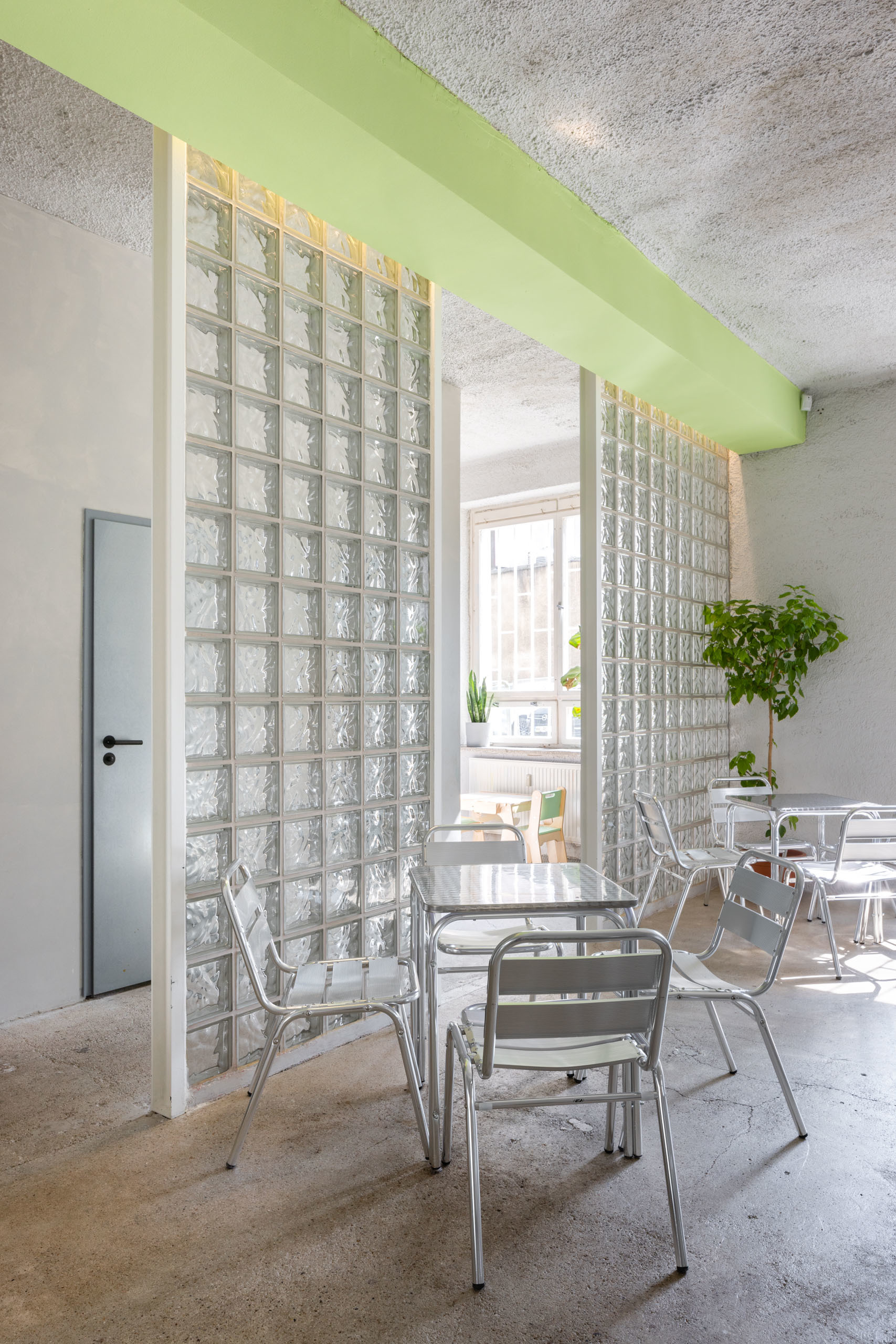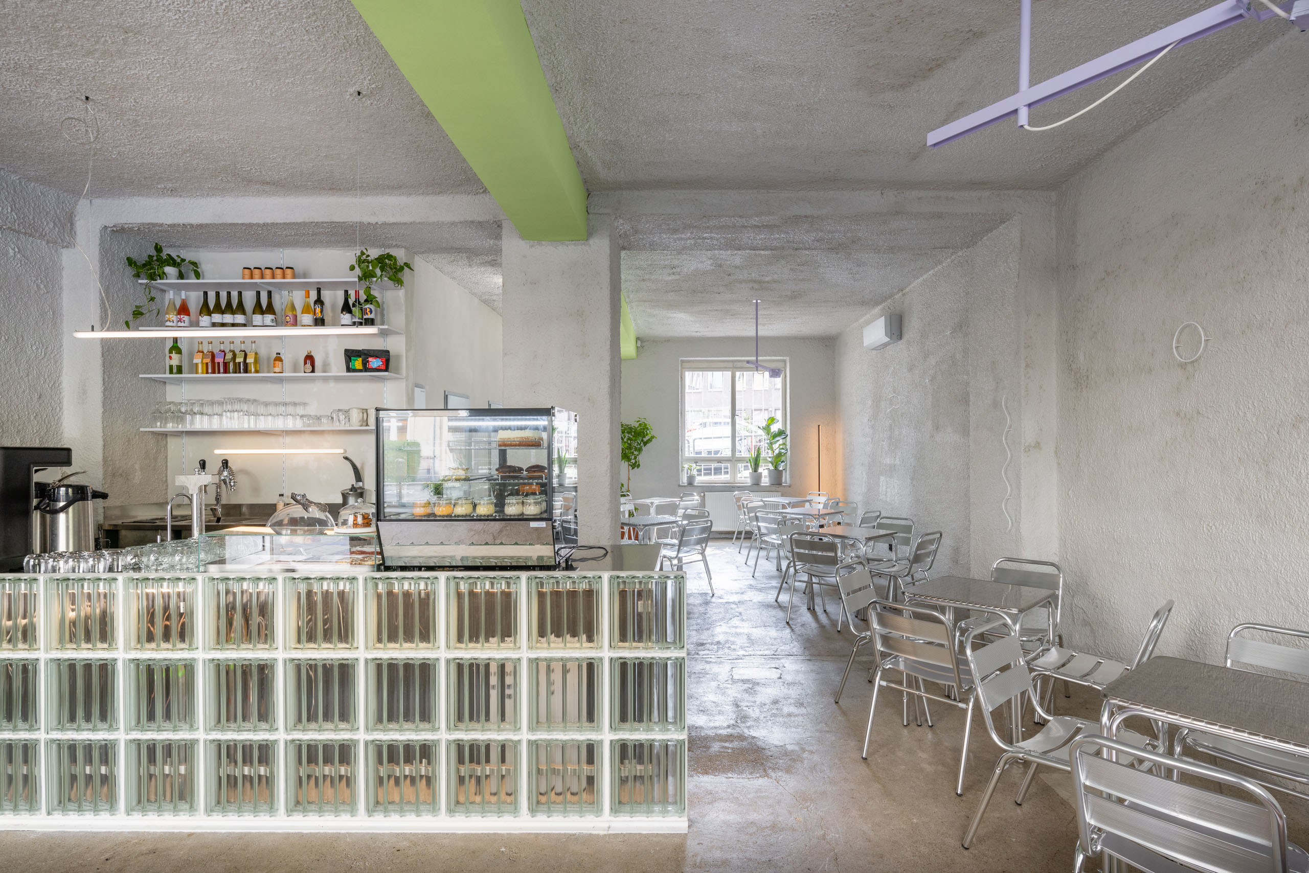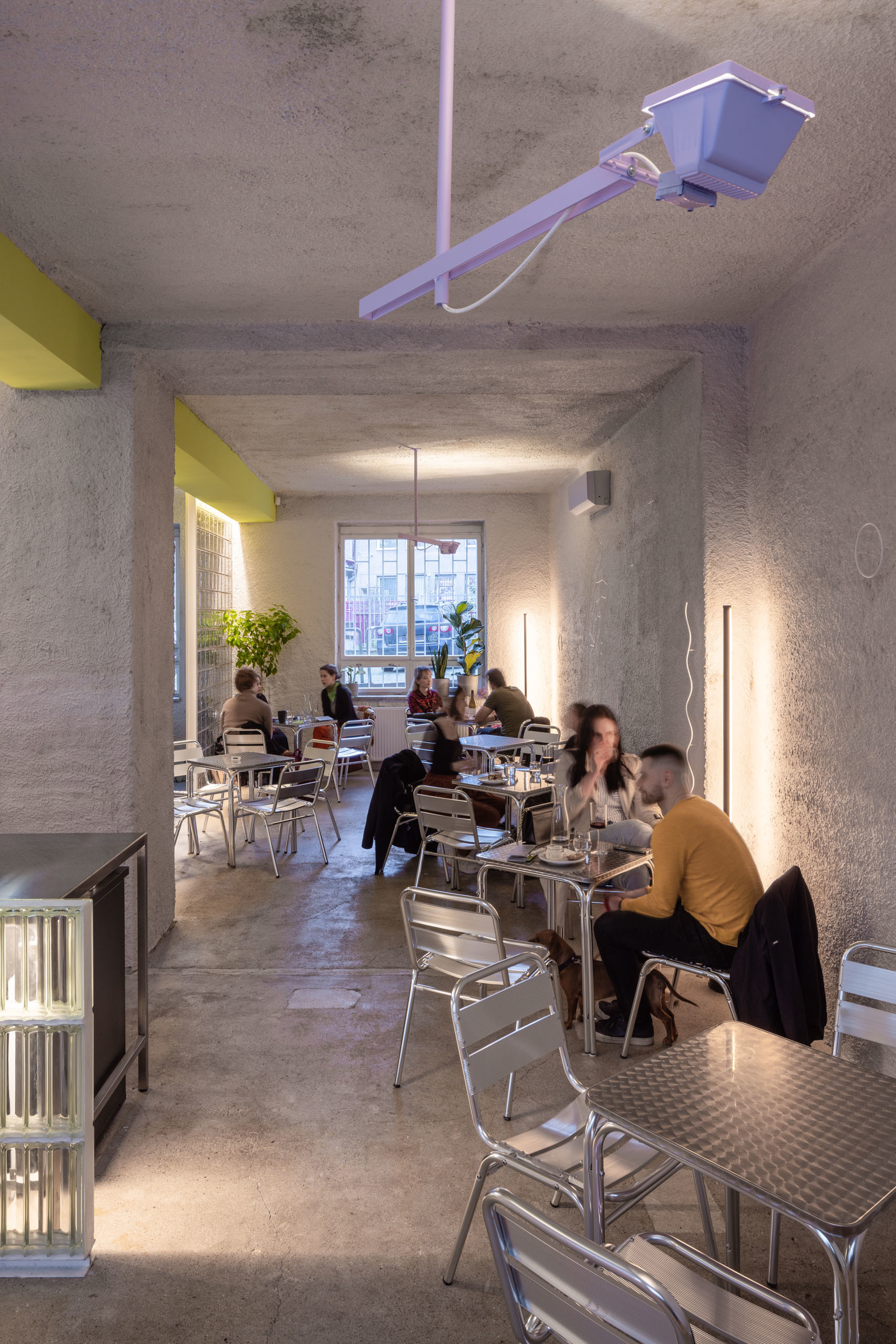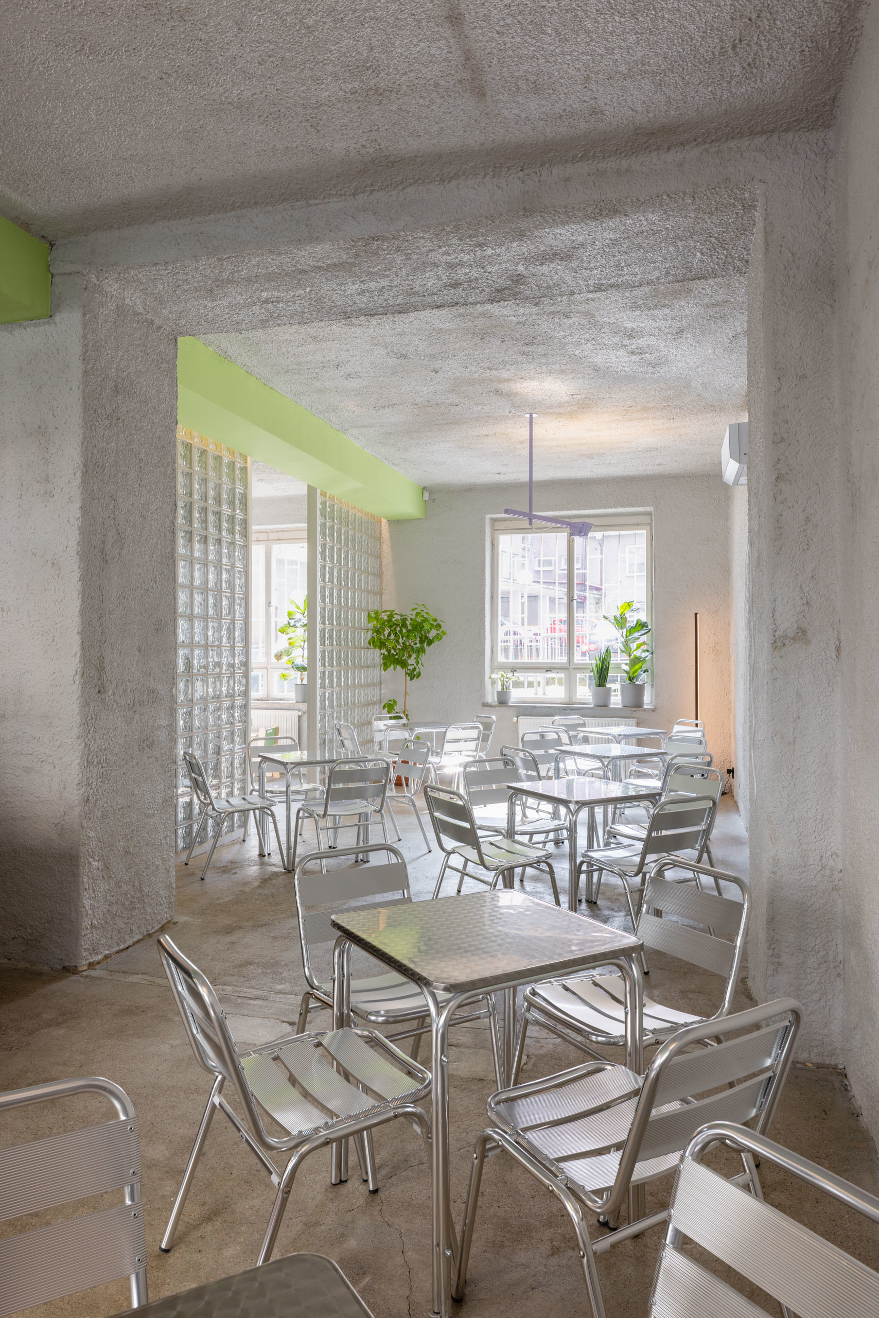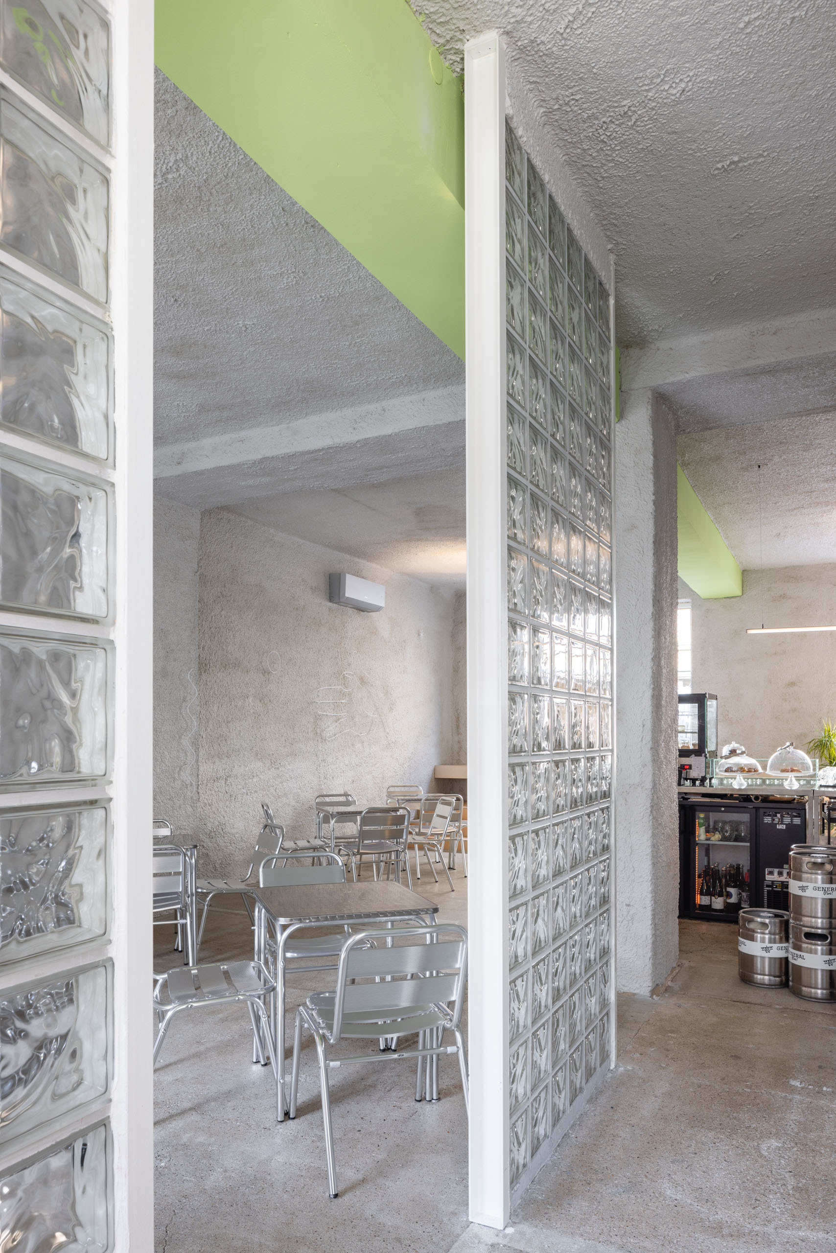 Dominantným interiérovým prvkom priestoru sa stáva bar, ktorý svojou materialitou nadväzuje ma zachované sklobetónové steny.