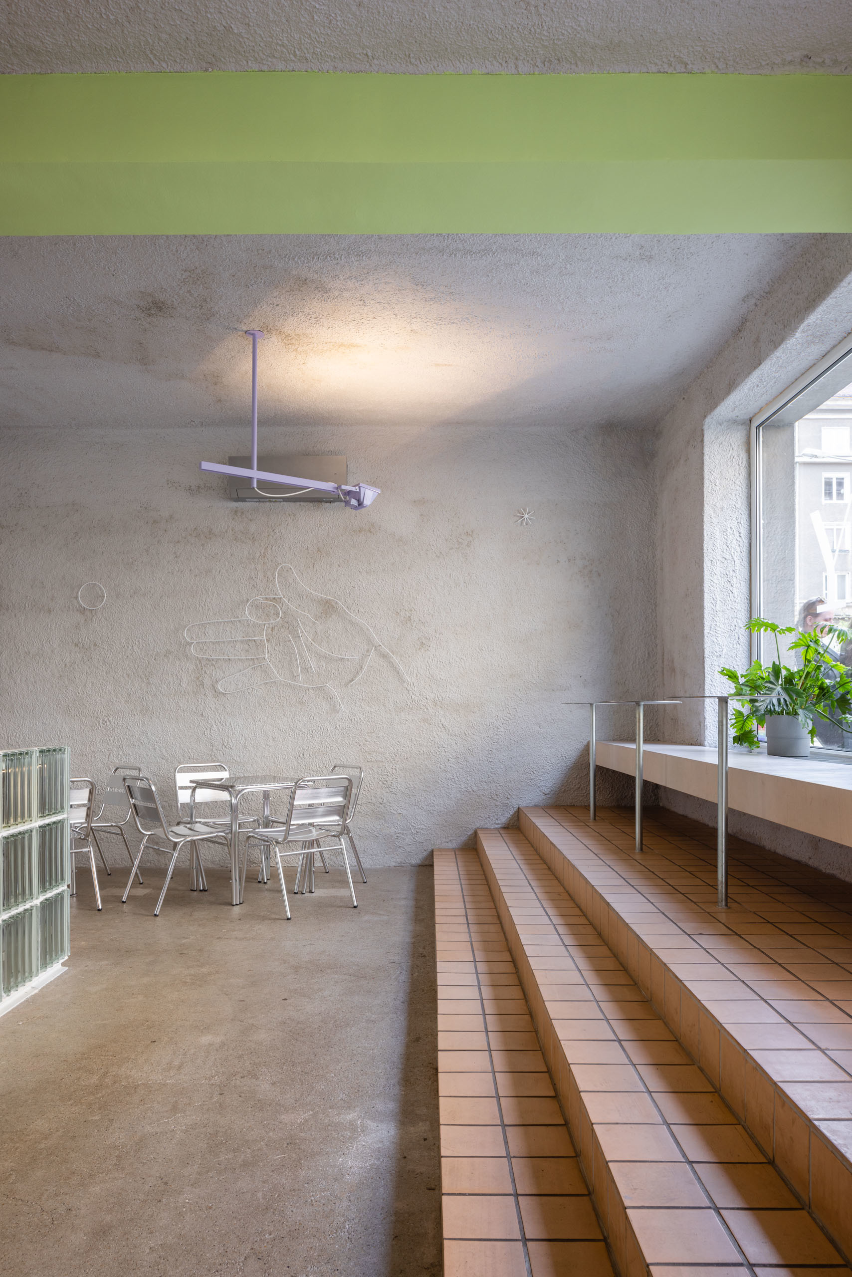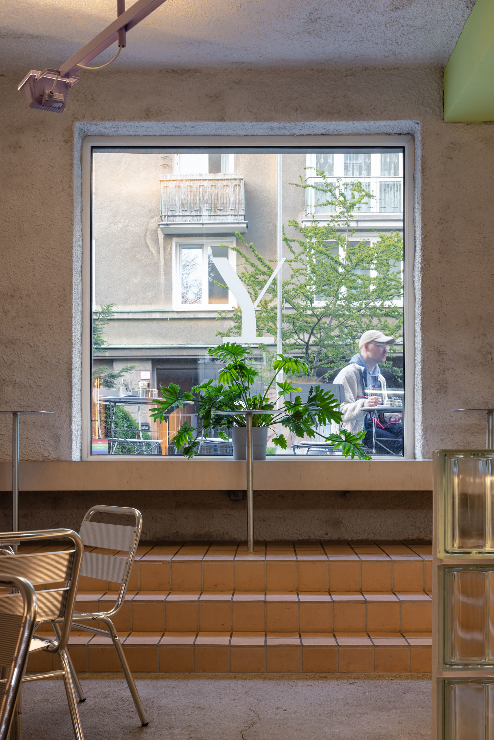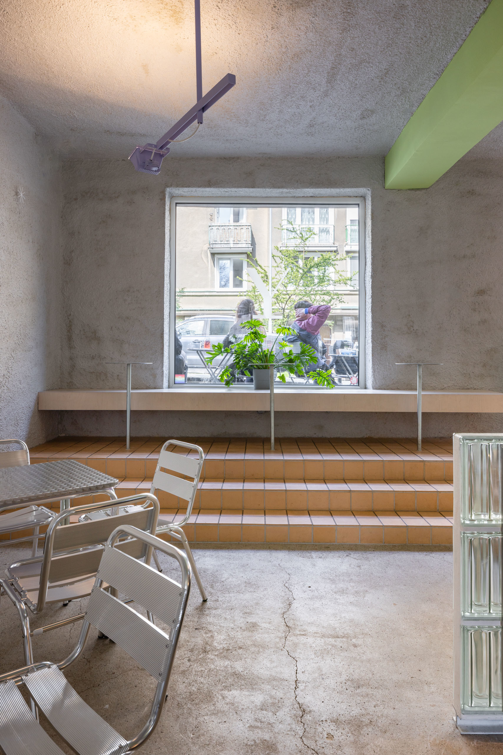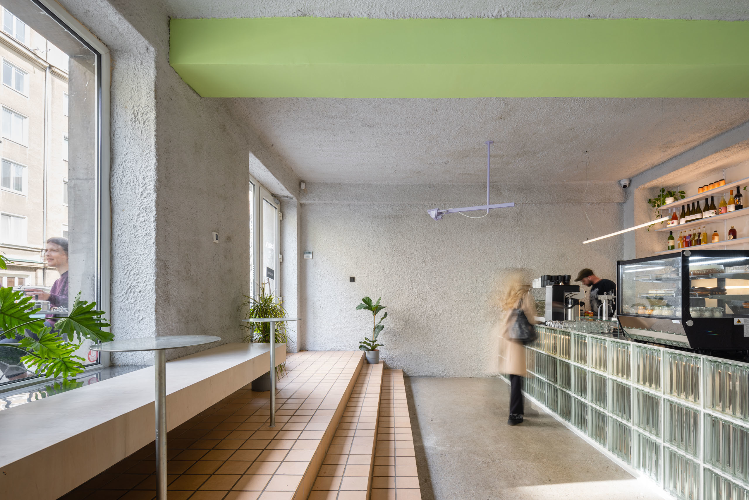 Priestor sme vyčistili a povrchy zjednotili striekanou omietkou. Pôvodná betónová podlaha kaviarne sa prebrúsila, aby sa na povrch dostalo typické riečne kamenivo. Schodisko do prevádzky sme natiahli na celú šírku priestoru a vytvorili tak zvýšený priestor pre sedenie obložený béžovou terakotovou dlažbou.