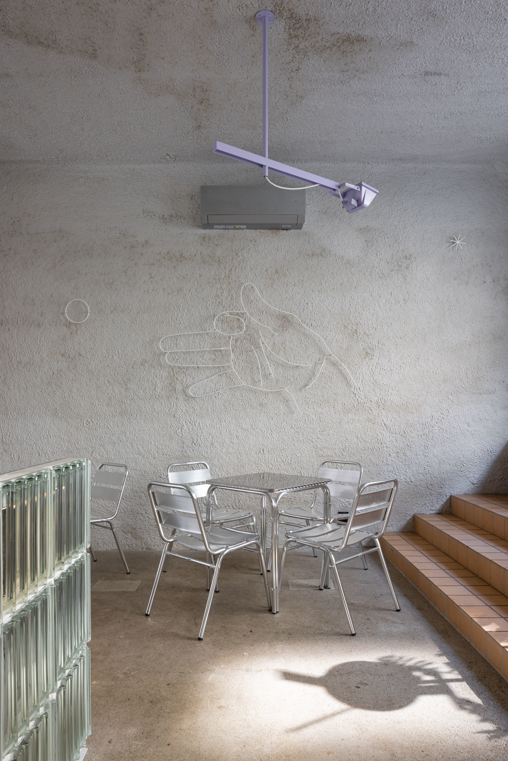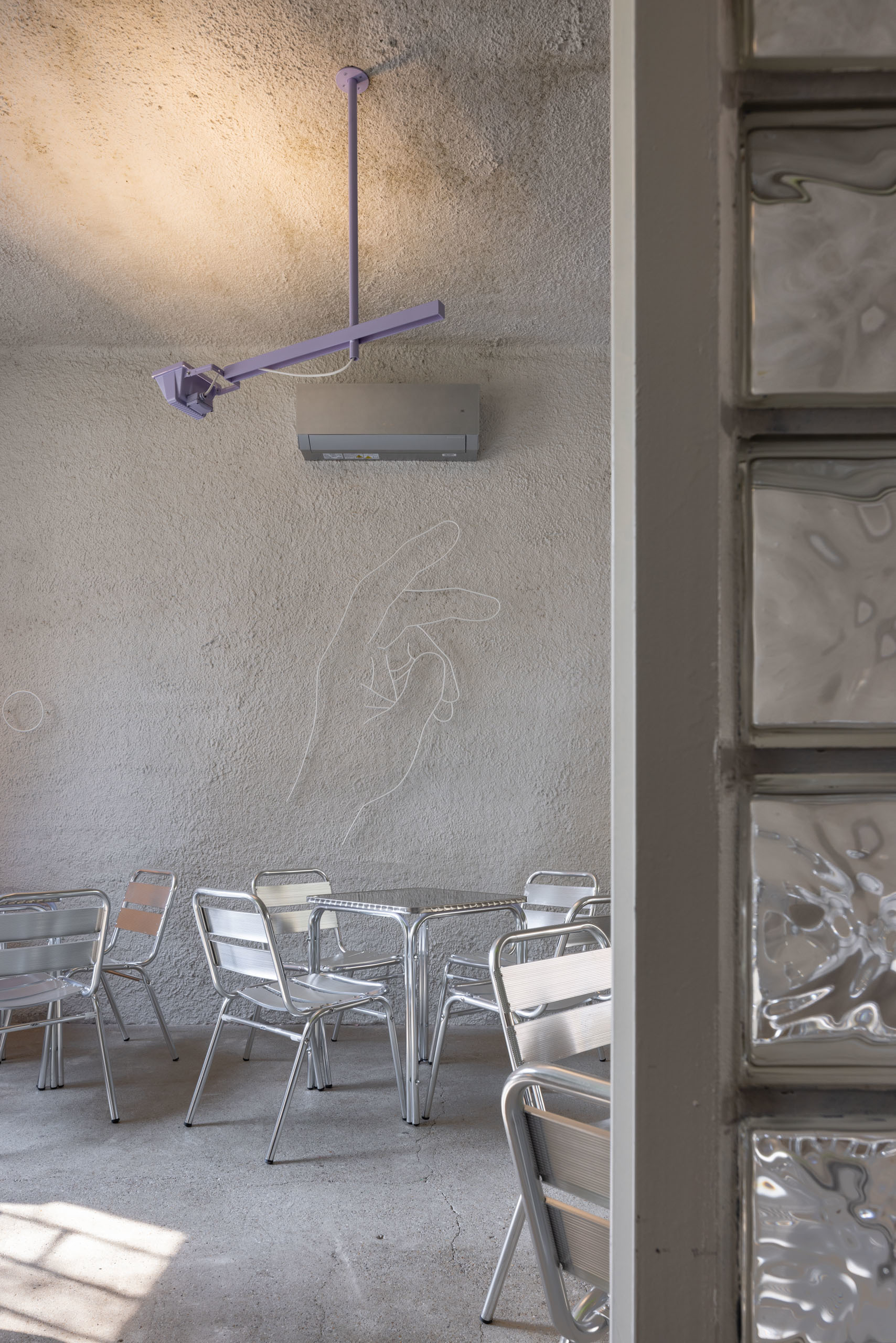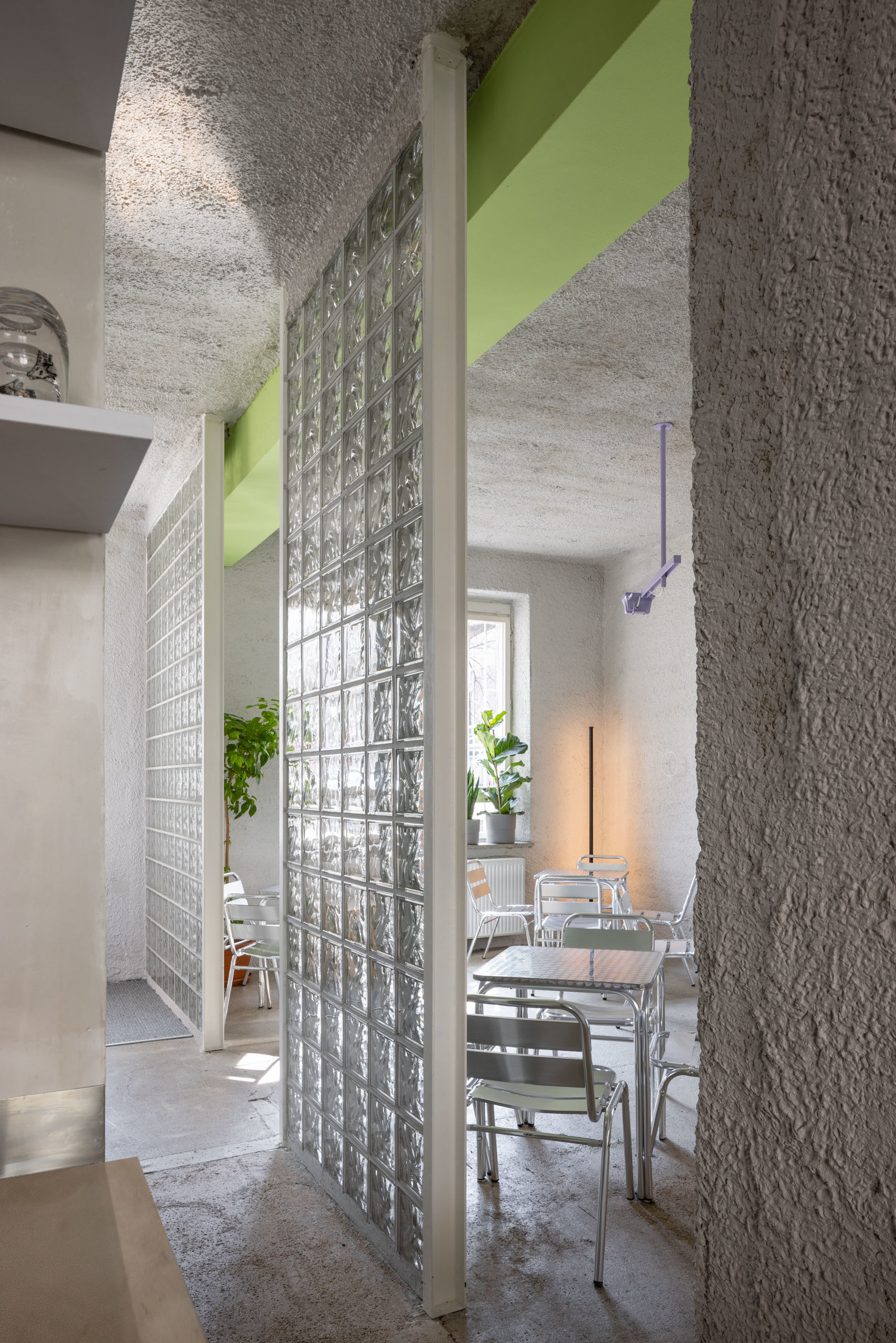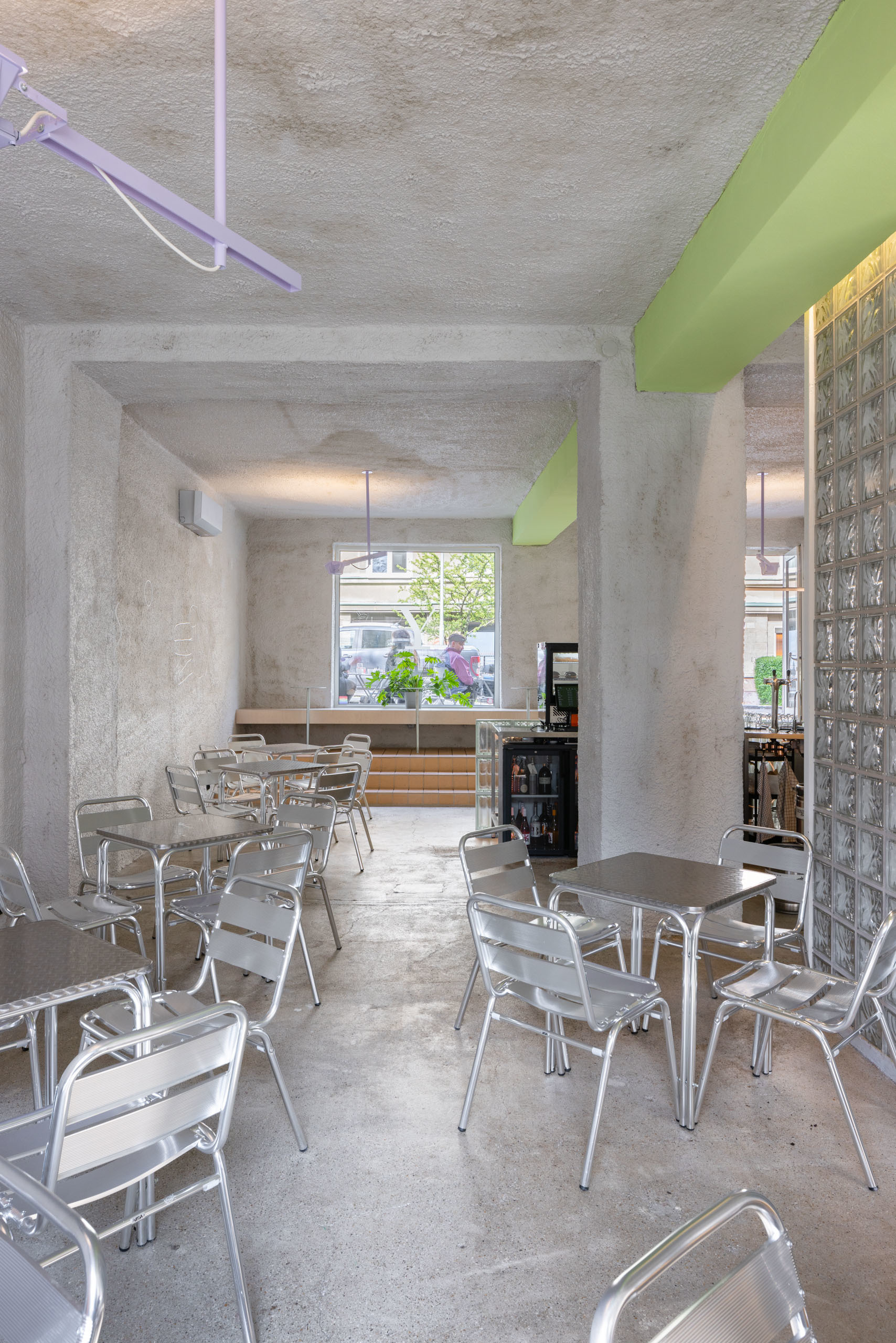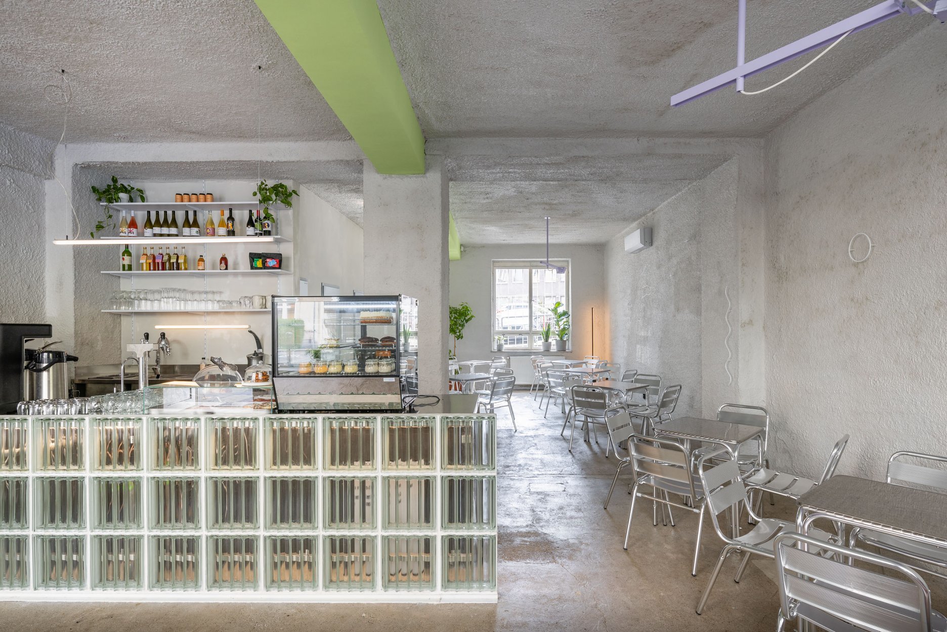 Priestor sme vyčistili a povrchy zjednotili striekanou omietkou. Pôvodná betónová podlaha kaviarne sa prebrúsila, aby sa na povrch dostalo typické riečne kamenivo. Schodisko do prevádzky sme natiahli na celú šírku priestoru a vytvorili tak zvýšený priestor pre sedenie obložený béžovou terakotovou dlažbou.
