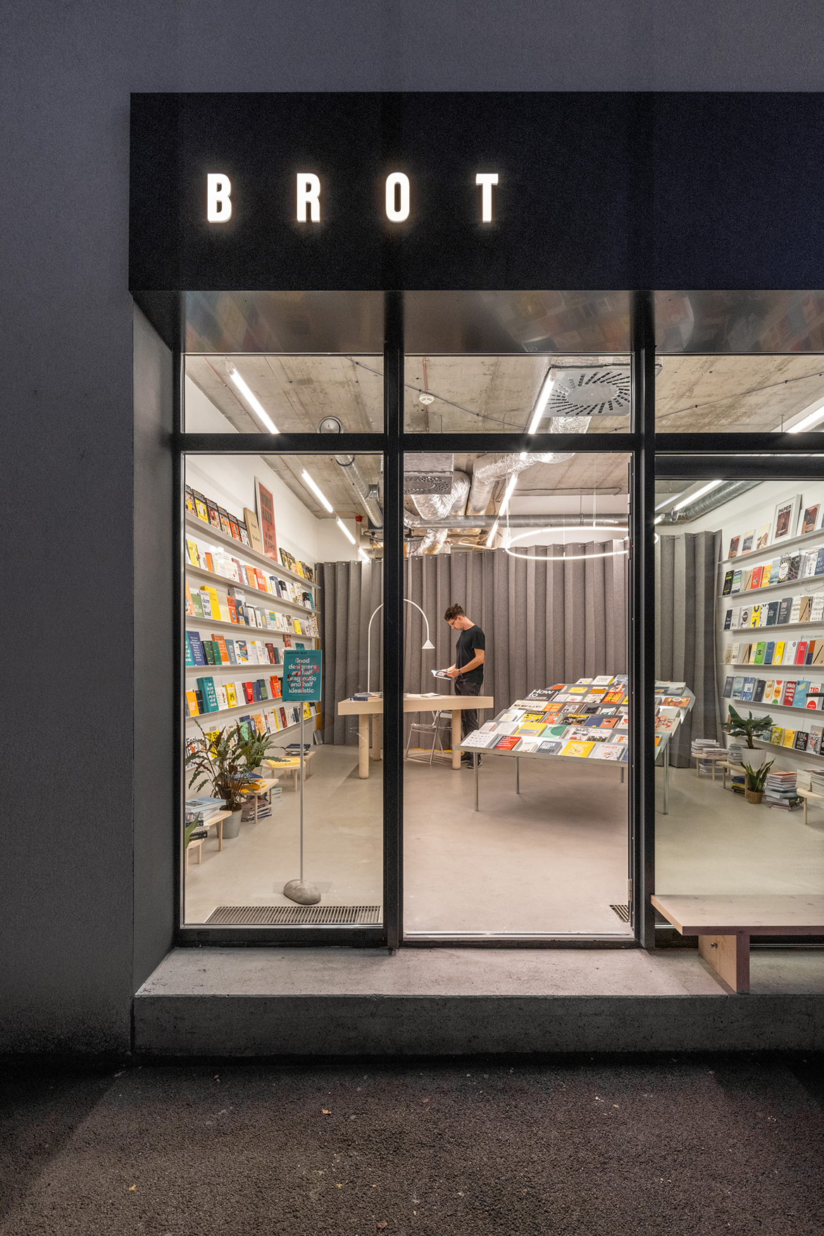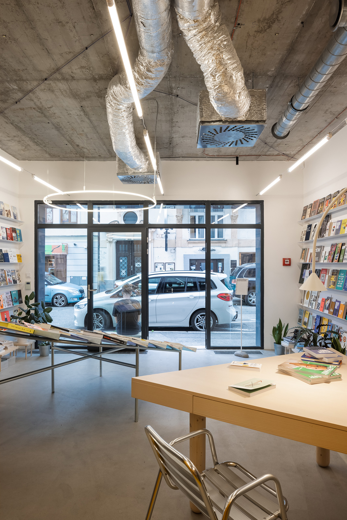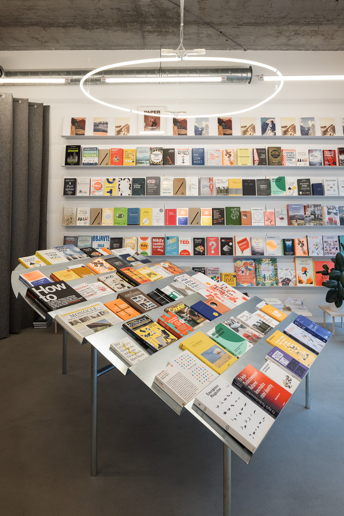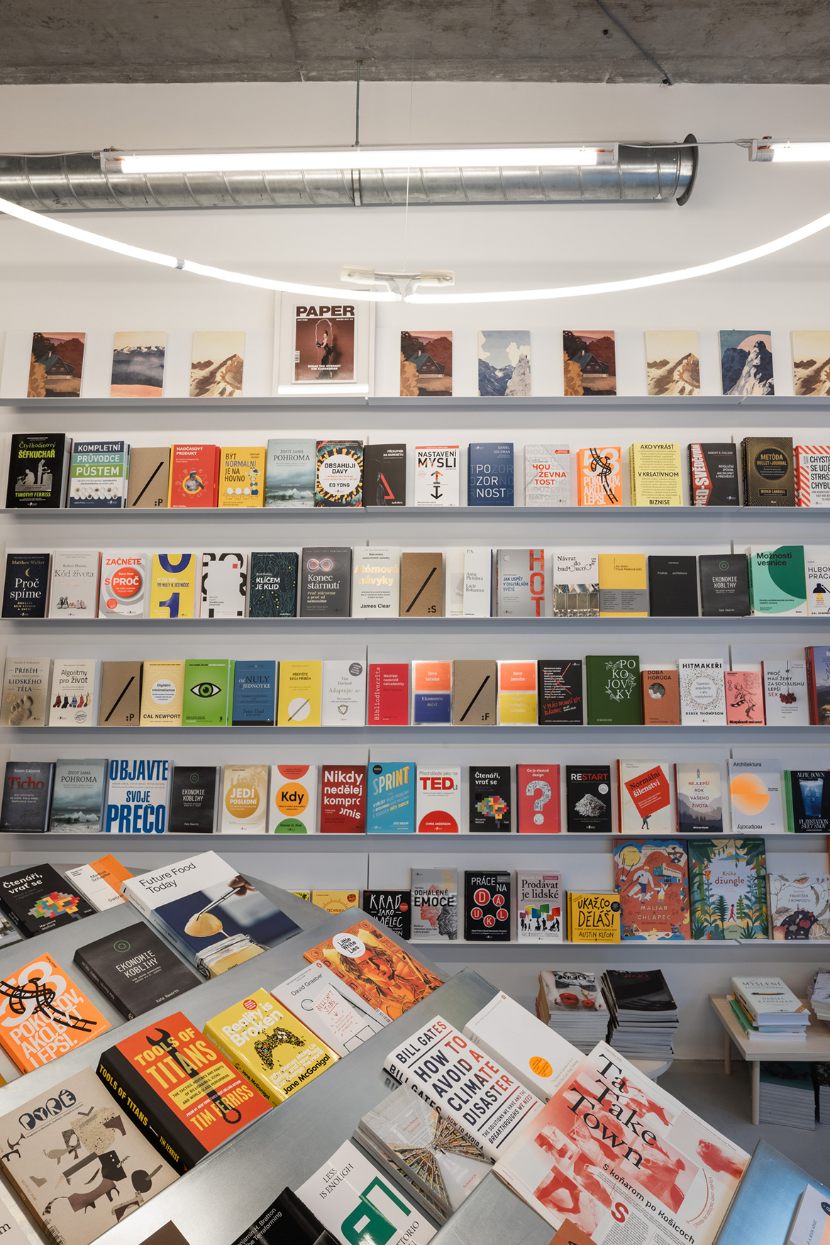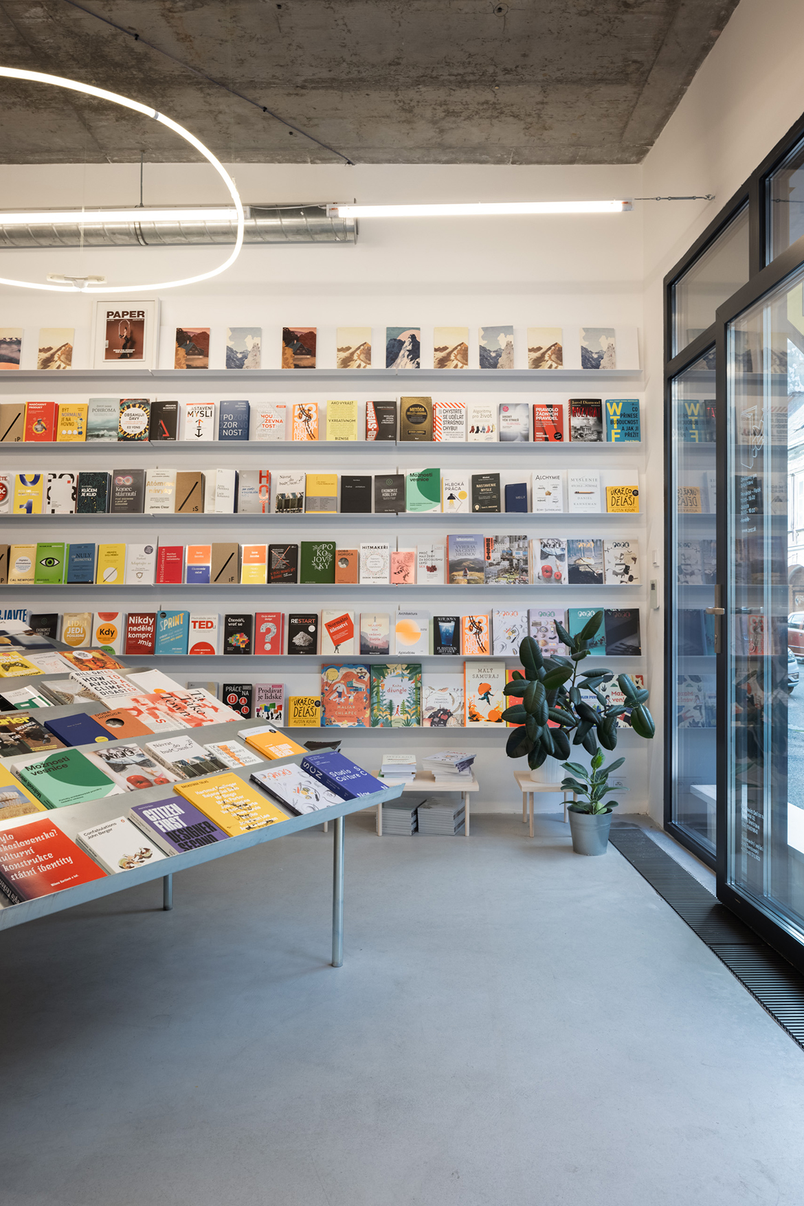 Otvorený výklad z ulice, scénická kulisa pre vystavené produkty. Abstrahované línie v interiéri nechávajú vyniknúť prezentované publikácie. Autori šikovne pracujú s detailom rôznych štruktúr a textúr povrchov.